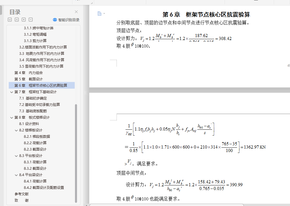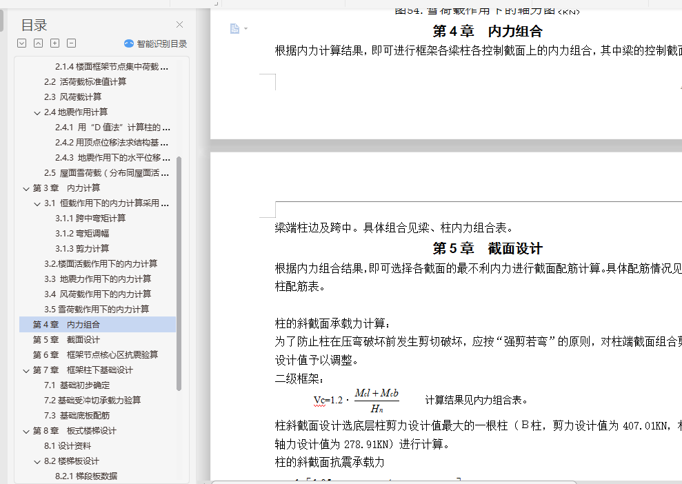 The purpose of the design is to do the anti-seismic design in the longitudinal frames of axis 2、3、7、8. When the directions of the frames is determined, firstly the weight of each floor is calculated .Then the vibrate cycle is calculated by utilizing the peak-displacement method, then making the amount of the horizontal seismic force can be got by way of the bottom-shear force method. The seismic force can be assigned according to the shearing stiffness of the frames of the different axis. Then the internal force (bending moment, shearing force and axial force ) in the structure under the horizontal loads can be easily calculated. After the determination of the internal force under the dead and live loads, the combination of internal force can be made by using the Excel software, whose purpose is to find one or several sets of the most adverse internal force of the wall limbs and the coterminous girders, which will be the basis of protracting the reinforcing drawings of the components. The design of the stairs is also be approached by calculating the internal force and reinforcing such components as landing slab, step board and landing girder whose shop drawings are completed in the end.