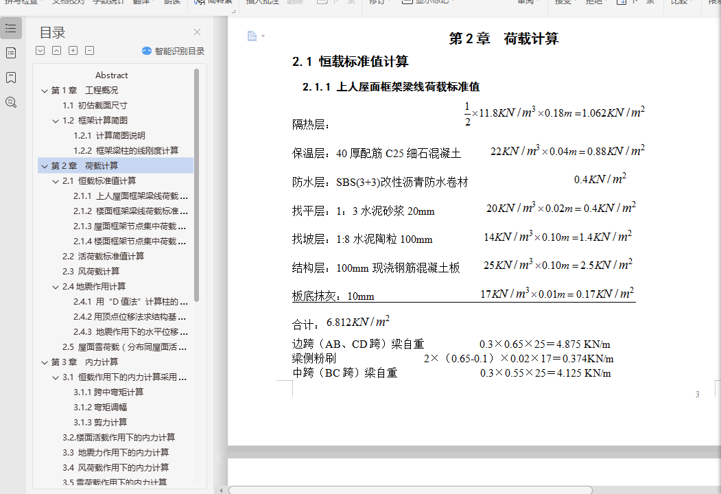 2.1.1 上人屋面框架梁线荷载标准值 3