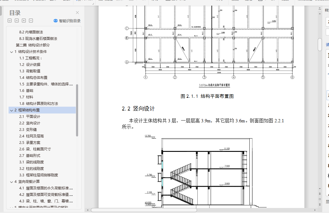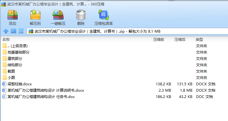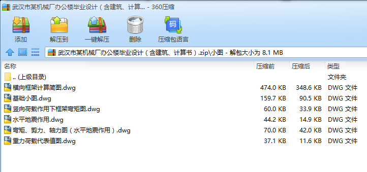 本设计所在地区抗震设防烈度为8度,框架结构的抗震等级为二级,所在场地土类别为二类。结构设计中主要包含了结构简图的确定,横向水平地震作用计算及位移验算,竖向荷载计算,水平地震作用下内力分析,竖向荷载作用下内力计算,框架内力组合,截面设计及施工图绘制等工作。其中后五项主要针对一榀典型框架进行。