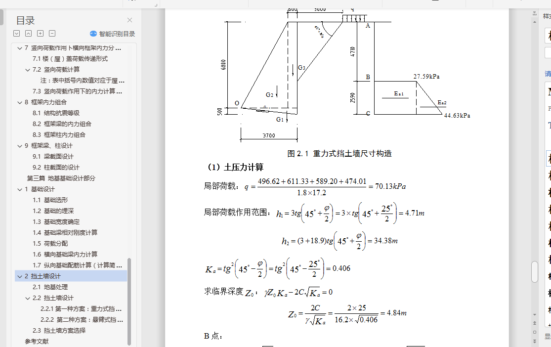 最后进行了挡土墙设计,主要计算了重力式挡土墙和悬臂式挡土墙,并进行了比较。