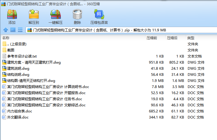 The design to the industrial factory building of steel construction adopts portal frame structure: Each span is 18 m and consists of 10 tons ,bridge type crane of A3 grade.The design is mainly according to the criterion of “CODE ROR DESIGN OF STEEL STRUCTURES” (GB50017―2003)and “TECHNICAL SPECIFICATION FOR STEEL STRUCTURE OF LIGHT-WEIGHT BUILDINGS WITH GABLE FRAMES”(CECS102:2002)etc. After decided the plane arrangement of frame,representative value of load is first caculated. The internal force is analyzed and combined in PKPM so as to choose the section of beam and column and neglectes the factor that earthquake is on the influence of loading etc. Based on these analysis, the section of beam and columniation is decided. Then the vibrate cycle is calculated by the peak-displacement method for structural internal force (bending moment,shearing force and axial force ). Next, checking stability of the plane structure. The steel beam and column employs Q235 carbon structural steel. Connection bolts are high strength of friction type with behavioral grade 8.8 and 10.9. Rod for manual welding usually adopts E43. And during calculate the internal force , a kind of most unfavorable association have been only selected,fetch the safest result to calculate. In addition, foundation of the ground has been caculated.Because the geological condition of the place of factory building is better, the design plan is adopted on the individual footing under the post. Having finished the roof beam , internal force and the section of members have been caculated . Finally draw the building and structure.