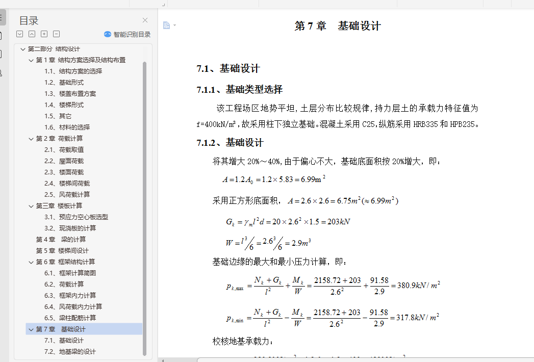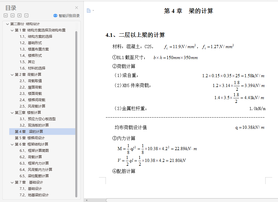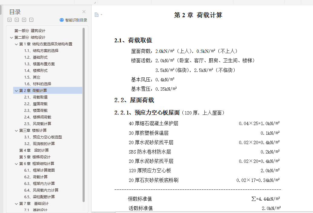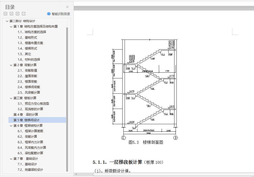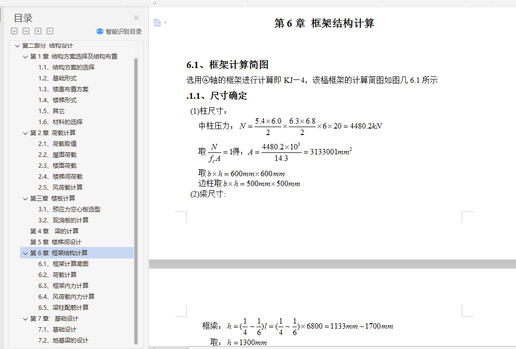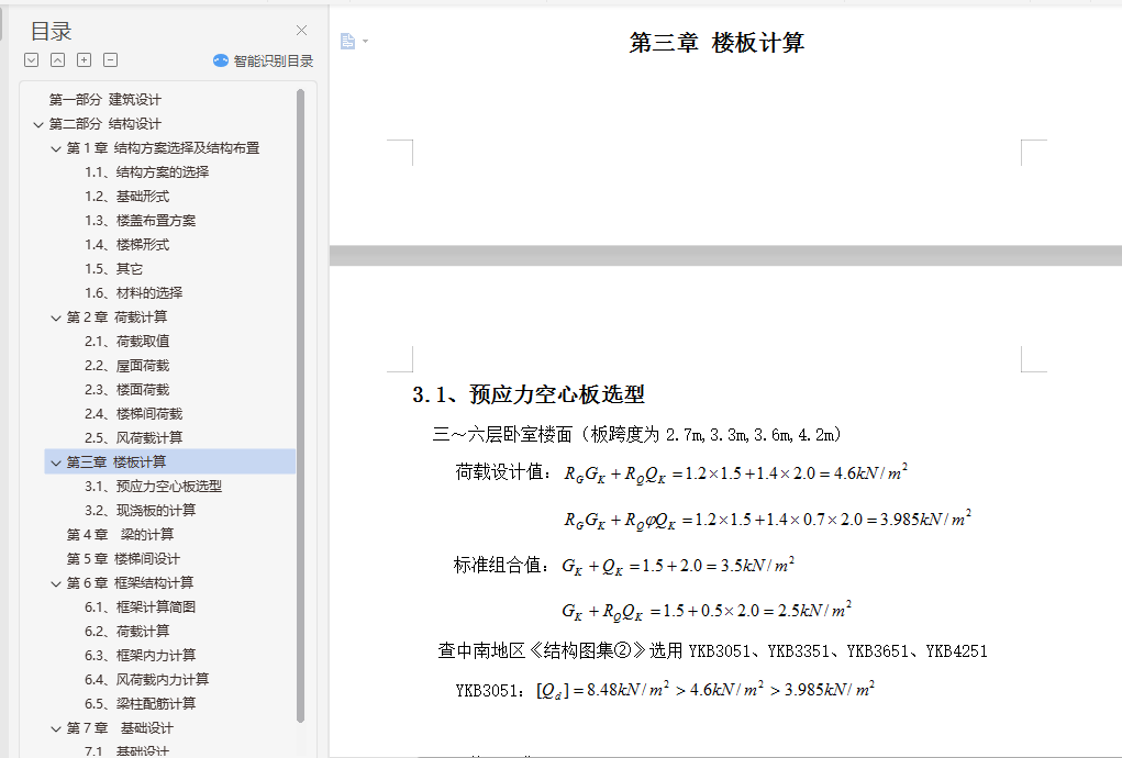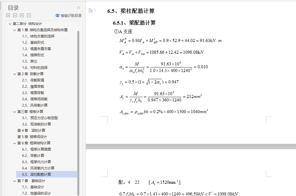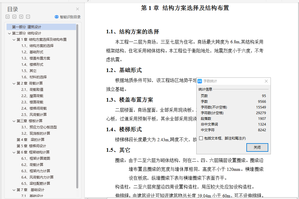 目录第一部分 建筑设计 1第二部分 结构设计 3第1章 结构方案选择及结构布置 31.1、结构方案的选择 31.2、基础形式 41.3、楼盖布置方案 41.4、楼梯形式 41.5、其它 41.6、材料的选择 4第2章 荷载计算 52.1、荷载取值 52.2、屋面荷载 62.3、楼面荷载 72.4、楼梯间荷载 112.5、风荷载计算 12第三章 楼板计算 123.1、预应力空心板选型 123.2、现浇板的计算 13第4章 梁的计算 27第5章 楼梯间设计 60第6章 框架结构计算 656.1、框架计算简图 656.2、荷载计算 666.3、框架内力计算 746.4、风荷载内力计算 786.5、梁柱配筋计算 80第7章 基础设计 907.1、基础设计 907.2、地基梁的设计 93第一部分 建筑设计第1章 建筑说明1.1、工程概况:工程名称:宏兴商住楼设计工程地点:衡阳市工程信息:总建筑面积5230.33㎡,总层数7层,一层层高4.5m,二层层高为5.4m,为商场,三层及以上层高3.0m,为住宅。结构形式:一二层为框架结构,三~七层为砌体结构。1.2、建筑功能与特点:该拟建的建筑位于衡阳市市内,为商用与民用综合建筑。建筑占地472.8㎡,总建筑面积5230.33㎡。1.2.1、平面设计建筑朝向为坐北朝南,平面布置满足长宽比小于5,采用纵向1.5m、4.8m,横向5.2、2.7的柱距,满足建筑开建模数和进深的要求。1.2.2、立面设计该建筑立面为了满足采光和美观要求,设置了大面积的玻璃窗。外墙面选用外墙漆。