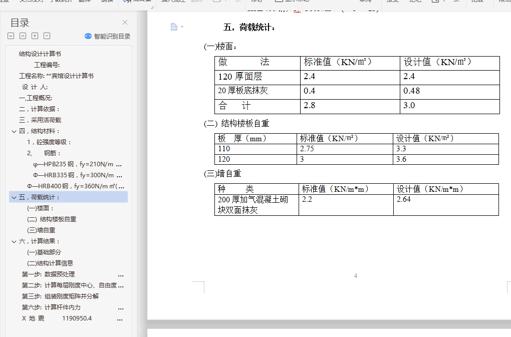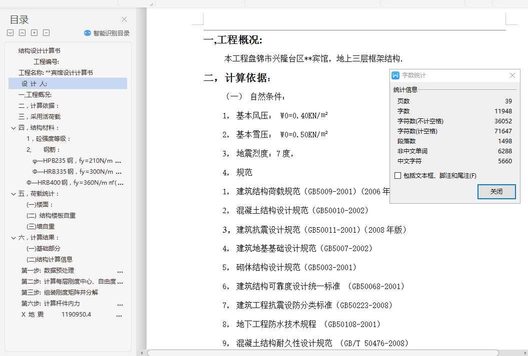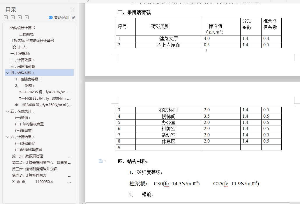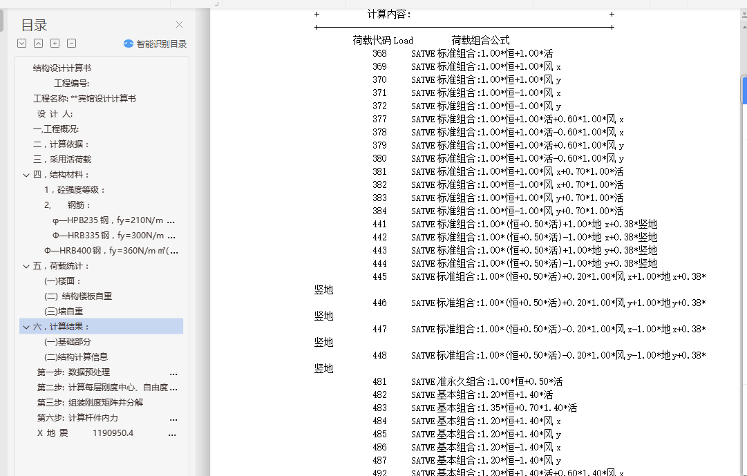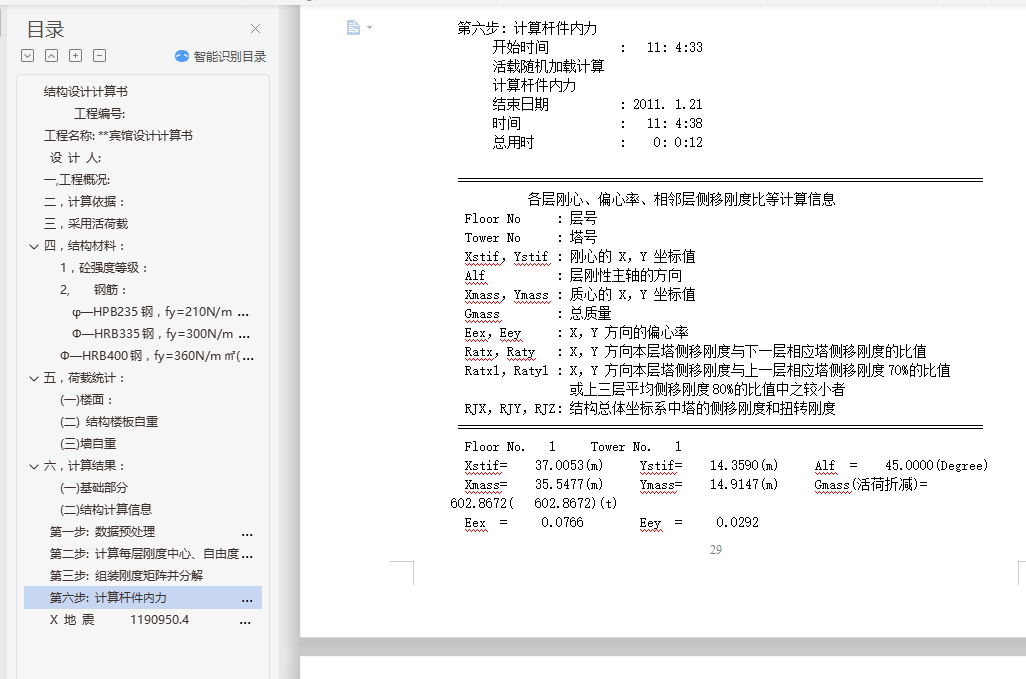 目录结构设计计算书 1工程编号: 1工程名称: **宾馆设计计算书 1设 计 人: 1一,工程概况: 2二,计算依据: 2三,采用活荷载 3四,结构材料: 31, 砼强度等级: 32, 钢筋: 3φ—HPB235钢,fy=210N/m㎡(φ8~φ12) 3Ф—HRB335钢,fy=300N/m㎡(Ф12~Ф25) 3Ф—HRB400钢,fy=360N/m㎡(Ф8~Ф25) 3五,荷载统计: 4(一)楼面: 4(二) 结构楼板自重 4(三)墙自重 4六,计算结果: 4(一) 基础部分 4(二) 结构计算信息 22第一步: 数据预处理 26第二步: 计算每层刚度中心、自由度、质量等信息 26第三步: 组装刚度矩阵并分解 26第六步: 计算杆件内力 29X 地 震 1190950.4 6974.4 170.76 0.00 30