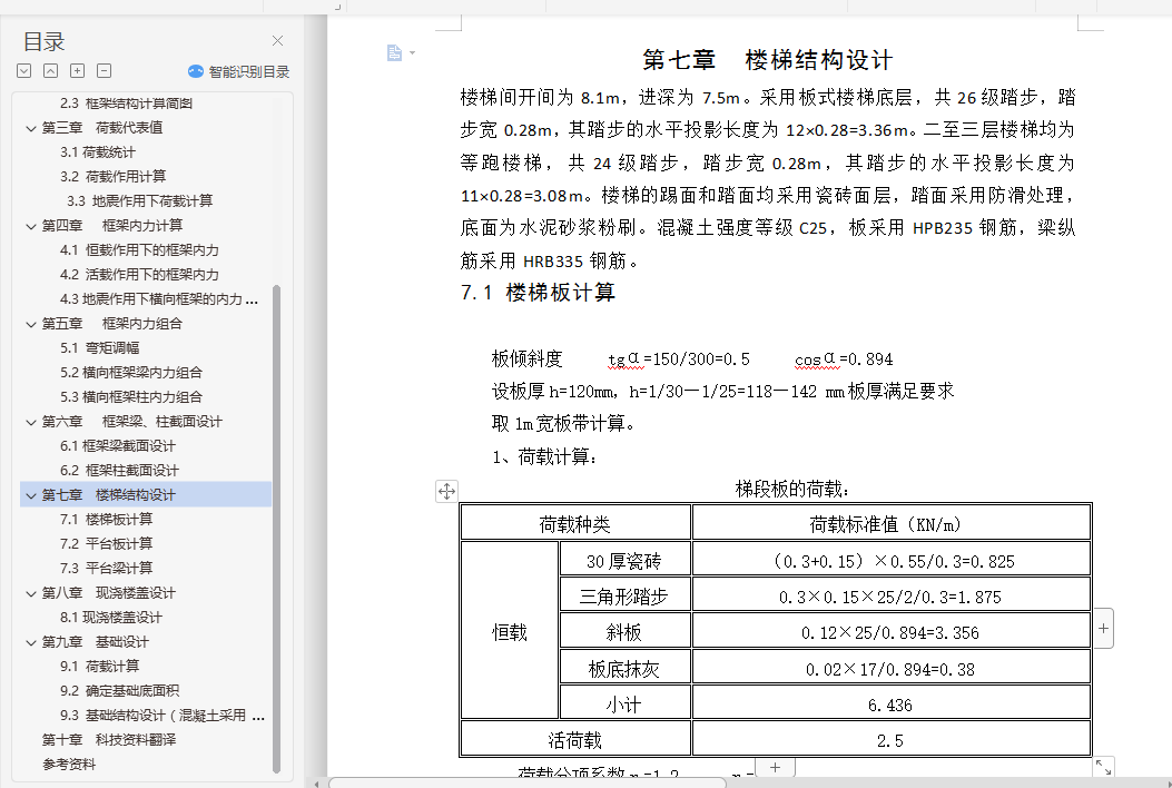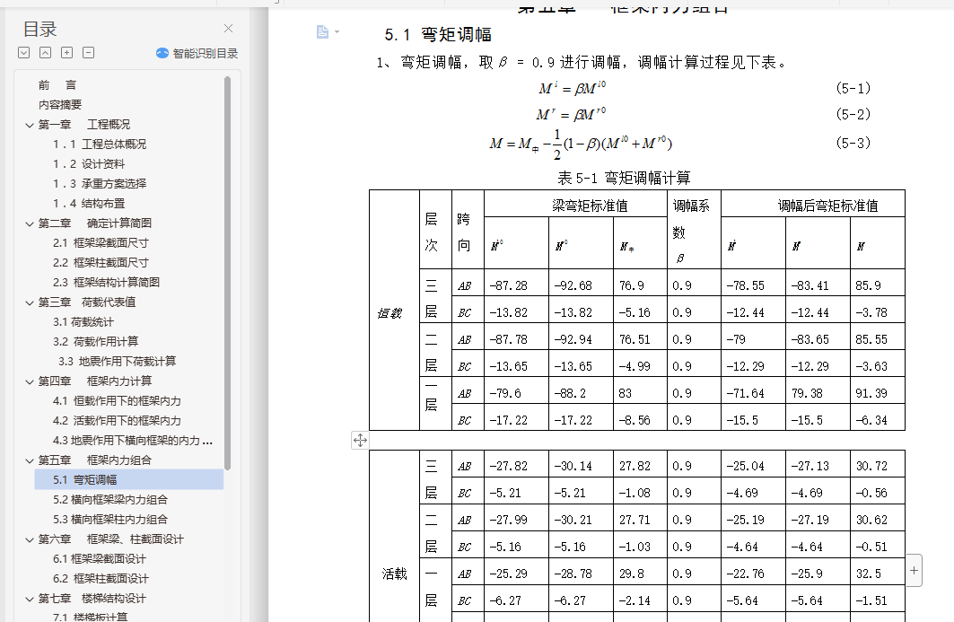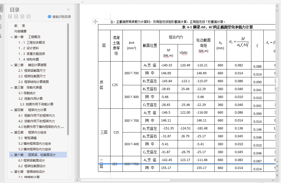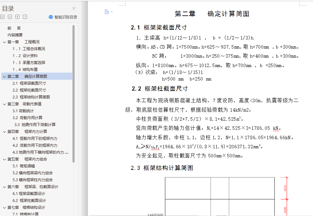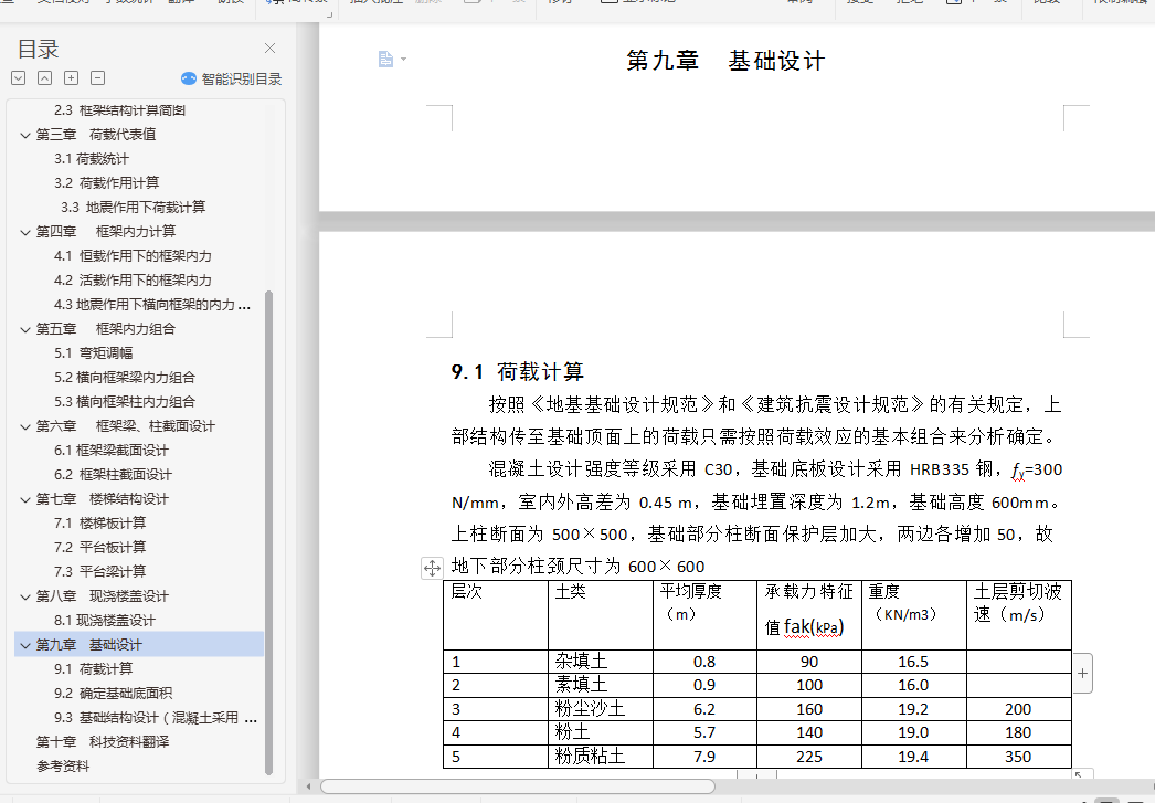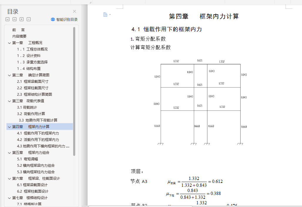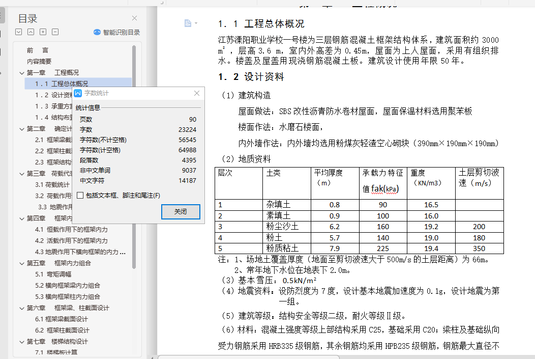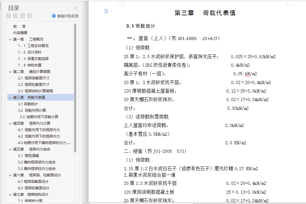 内容摘要本设计主要进行了结构方案中横向框架3轴框架的抗震设计。在确定框架布局之后,先进行了层间荷载代表值的计算,接着利用顶点位移法求出自震周期,进而按底部剪力法计算水平地震荷载作用下大小,进而求出在水平荷载作用下的结构内力(弯矩、剪力、轴力)。接着计算竖向荷载(恒载及活荷载)作用下的结构内力,。 是找出最不利的一组或几组内力组合。 选取最安全的结果计算配筋并绘图。此外还进行了结构方案中的室内楼梯的设计。完成了平台板,梯段板,平台梁等构件的内力和配筋计算及施工图绘制。关键词: 框架 结构设计 抗震设计AbstractThe purpose of the design is to do the anti-seismic design in the longitudinal frames of axis 3. When the directions of the frames is determined, firstly the weight of each floor is calculated .Then the vibrate cycle is calculated by utilizing the peak-displacement method, then making the amount of the horizontal seismic force can be got by way of the bottom-shear force method. The seismic force can be assigned according to the shearing stiffness of the frames of the different axis. Then the internal force (bending moment, shearing force and axial force ) in the structure under the horizontal loads can be easily calculated. After the determination of the internal force under the dead and live loads, the combination of internal force can be made by using the Excel software, whose purpose is to find one or several sets of the most adverse internal force of the wall limbs and the coterminous girders, which will be the basis of protracting the reinforcing drawings of the components. The design of the stairs is also be approached by calculating the internal force and reinforcing such components as landing slab, step board and landing girder whose shop drawings are completed in the end.Keywords : frames, structural design, anti-seismic design目录前 言 1内容摘要 2第一章 工程概况 41.1 工程总体概况 41.2 设计资料 41.3 承重方案选择 41.4 结构布置 5第二章 确定计算简图 62.1 框架梁截面尺寸 62.2 框架柱截面尺寸 62.3 框架结构计算简图 6第三章 荷载代表值 73.1荷载统计 73.2 荷载作用计算 93.3 地震作用下荷载计算 12第四章 框架内力计算 174.1 恒载作用下的框架内力 174.2 活载作用下的框架内力 244.3地震作用下横向框架的内力计算 28第五章 框架内力组合 325.1 弯矩调幅 325.2横向框架梁内力组合 335.3横向框架柱内力组合 36第六章 框架梁、柱截面设计 406.1框架梁截面设计 406.2 框架柱截面设计 46第七章 楼梯结构设计 487.1 楼梯板计算 487.2 平台板计算 497.3 平台梁计算 50第八章 现浇楼盖设计 538.1现浇楼盖设计 54第九章 基础设计 569.1 荷载计算 579.2 确定基础底面积 589.3 基础结构设计(混凝土采用C20) 59第十章 科技资料翻译 62参考资料 87