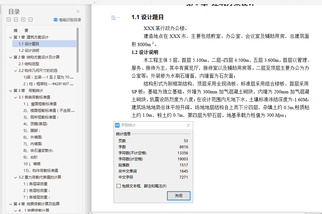 本工程为XXX市某行政办公楼,建筑面积7035 m2,五层,建筑高度23.2m,采用框架结构,设计基准期50年,抗震设防烈度为8度。基本雪压0.4 KN/M。楼﹑屋盖分别采用现浇钢筋混凝土结构、组合结构、SP板。