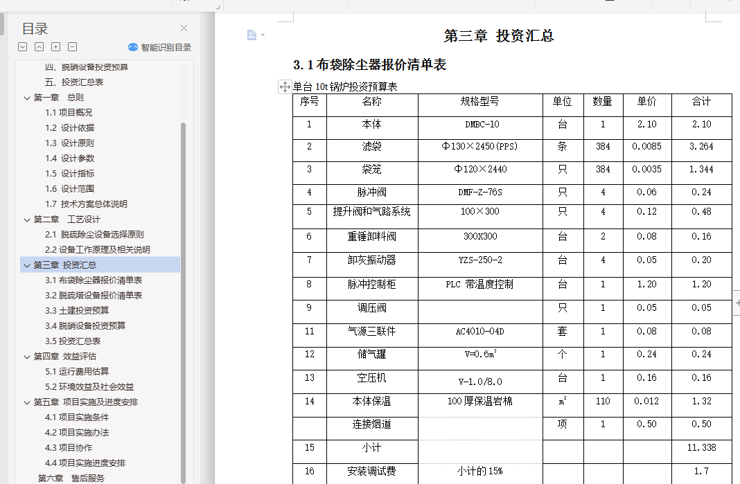 单台10t锅炉投资预算表