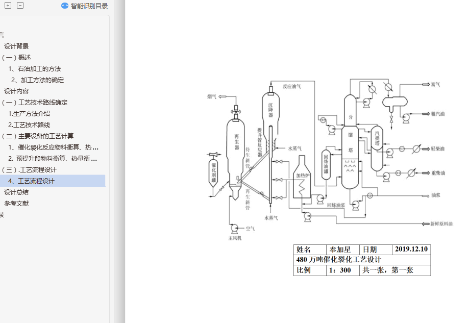 本设计课题是480万吨/年催化裂化装置工艺设计。通过对汽油裂化的方案的选择,确定裂化的技术路线,经过工艺计算和工艺流程的设计,达到了毕定设计的目的。设计中所选工艺对重油加工程度较深且产品收率很高,具有较好的经济效益和环保效益