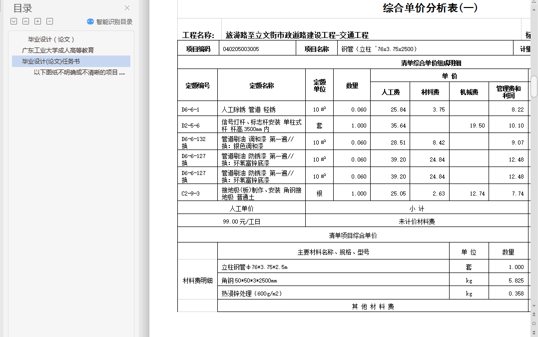在施工图设计阶段,按建设程序规定编制施工图预算,用以核实施工图阶段预算造价是否超过批复的初步设计概算,以实现建设项目“三控”原则。施工图预算是建设工程招投标的基准,是投保单位保证自身利益的共同基础,是办理结算的基本资料,因此必须保证施工图深度满足预算编制要求,也要确保图纸能完整或较为准确的反映项目实际情况,这样才能保证施工图预算在尽可能吻合实际的情况下,确保材料价与市场比较相符合,这样我们才能保证施工图预算不会突破概算。本工程工程量依据设计提供的施工图图纸,采用清单计价,执行国家《建设工程工程量清单计价规范》(GB50500-2013)并套用各专业综合定额,进行施工图预算编制工作。施工图预算文件包括:分部分项、措施项目、其他措施分部分项工程量清单综合单价分析表(一)等内容。综合单价分析是工程量清单计价的重要组成内容,它明细了完成每个单位分部分项工程所需投入的的人工费、材料费、施工机械使用费、企业管理费、利润并考虑一定范围内的风险费用,直接反映在清单综合单价中,是衡量和反映一个成熟的施工企业的技术能力、管理水平和风险管理的能力。