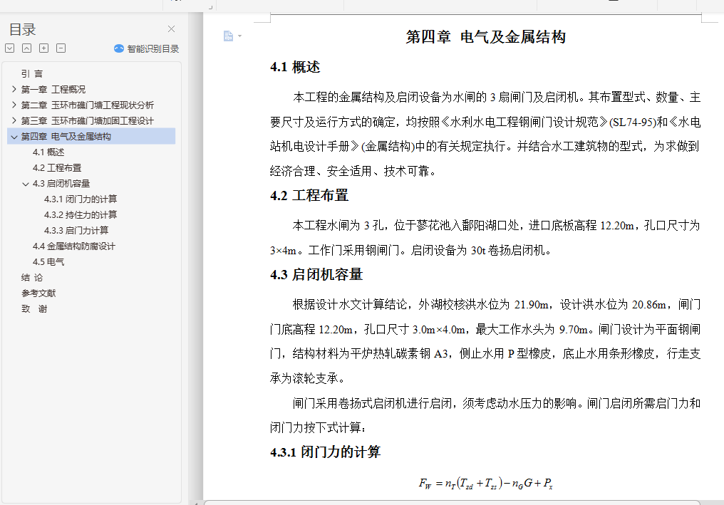 This design subject is the expansion design of the sluice of the reinforcement project of Yuhuan reef gate pond. Its main functions are tide blocking, flood discharging, silting and so on. It is composed of gate chamber and upstream and downstream connection section. The gate chamber section consists of base plate, gate pier, bank wall, gate and working bridge. The upstream connection section consists of upstream revetment, upstream wing wall and blanket. The downstream connection section is composed of downstream wing wall, stilling basin and anti scour groove. The design task is to determine the potential safety hazards of the reef gate according to the "reef gate pond safety evaluation report" and the operation condition of the project in the typhoon period, and the reef gate gate shall be reinforced. We are required to systematize and consolidate the textbook knowledge learned during the University. Through this design, I will master the general layout, hydraulic calculation, load calculation, seepage analysis and stability analysis of the gate. Learn structural design of sluice and master CAD drawing skills.