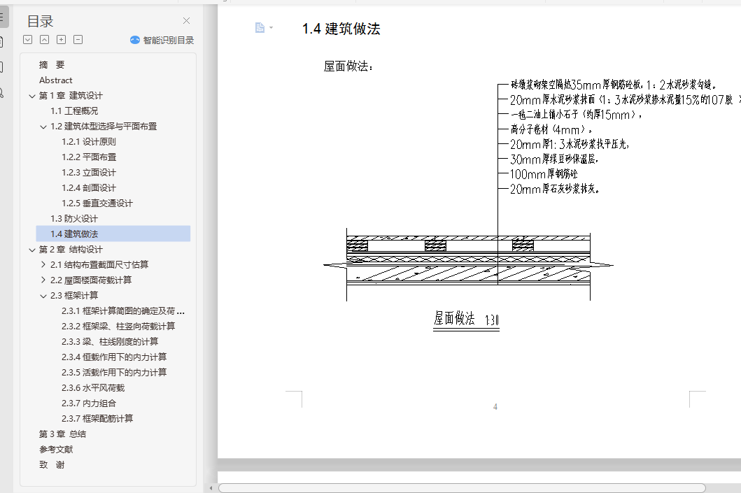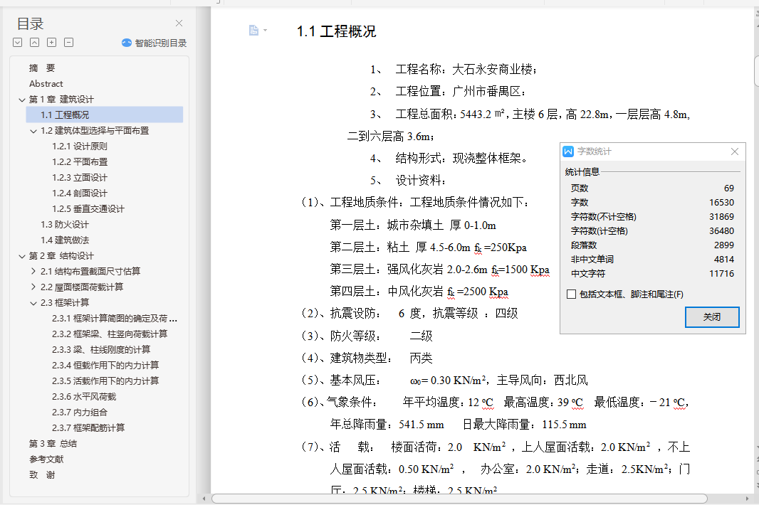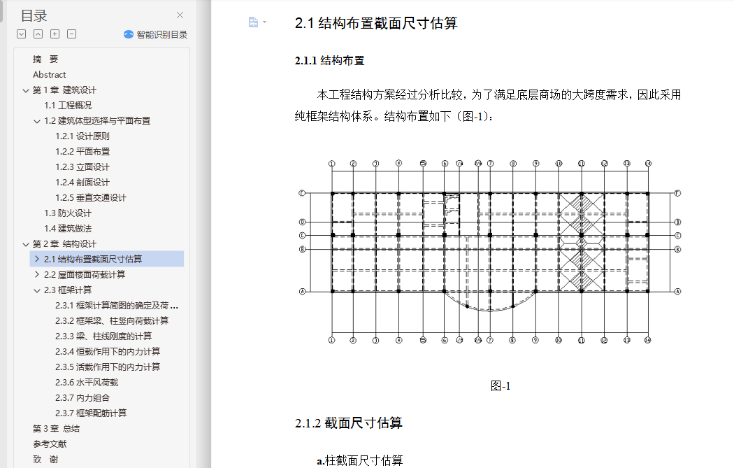 The project is located in Dashi, Panyu District, Guangzhou City, and the project adopts reinforced concrete frame structure, which requires the completion of the architectural design, structural design and engineering estimates of the commercial building. A total of six layers of height 4.8 meters, other layers of height are 3.6 meters. The total height of the building is 22.8 m. This design book includes two parts: architectural design and structural design, in which the structural part is the main part. The structural design of the project adopts the frame structure, and the structural calculation is analyzed according to the lateral frame load bearing. The calculation of internal force takes into account the following three kinds of load action, namely, the internal force under vertical dead load, the internal force under live load and the internal force under wind load. Structure The parts include: load calculation; reinforcement calculation of a plate; force analysis, calculation and design of a frame structure; staircase design; independent foundation design.