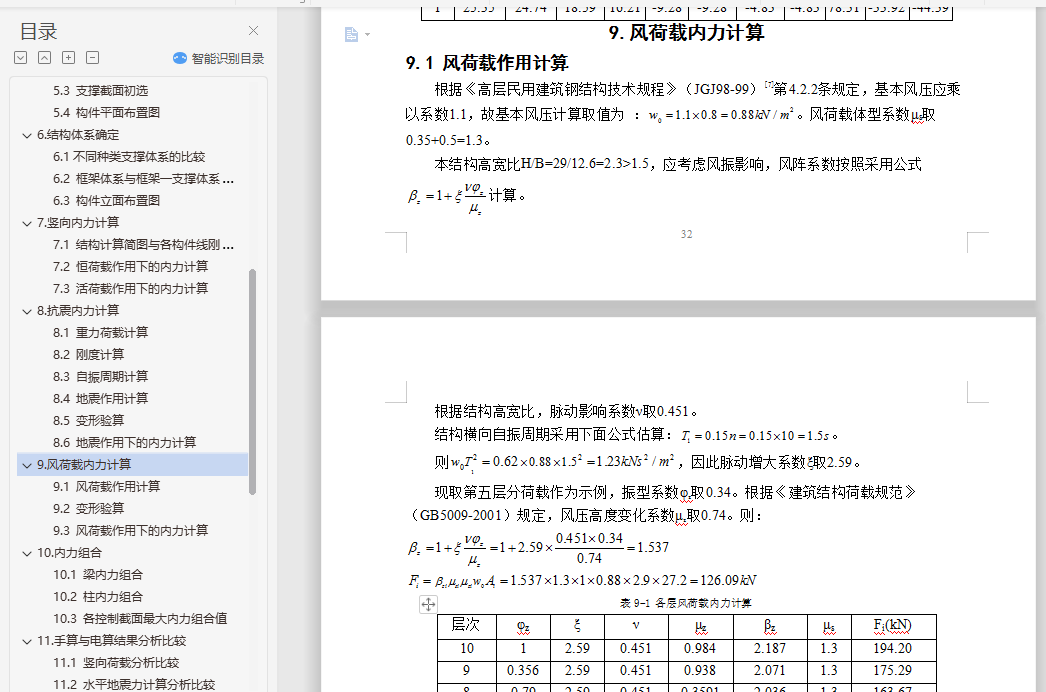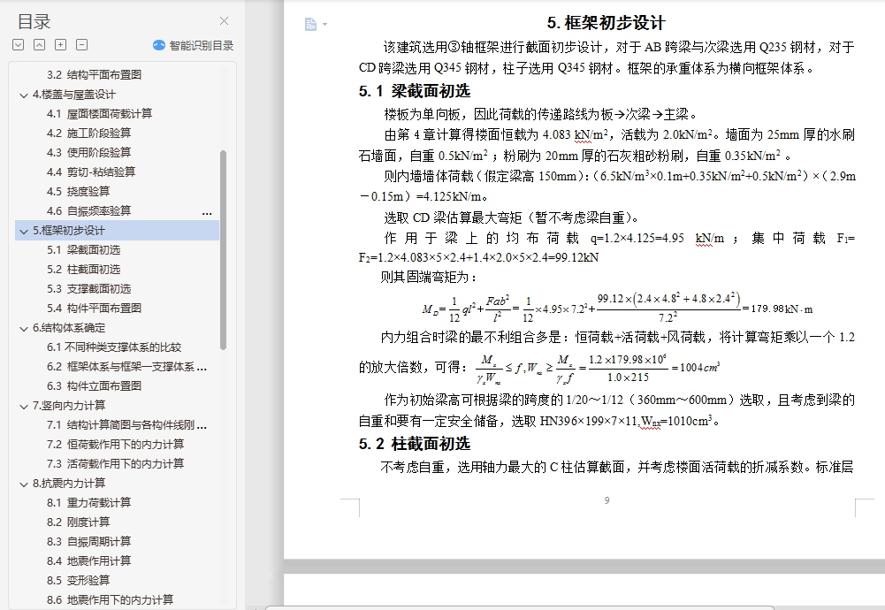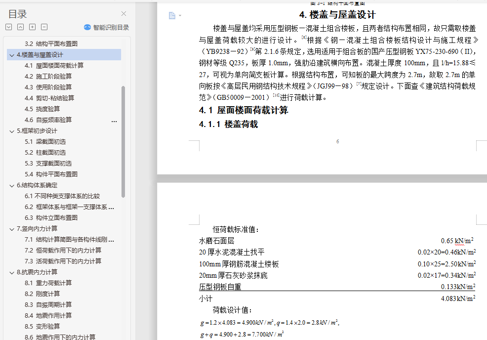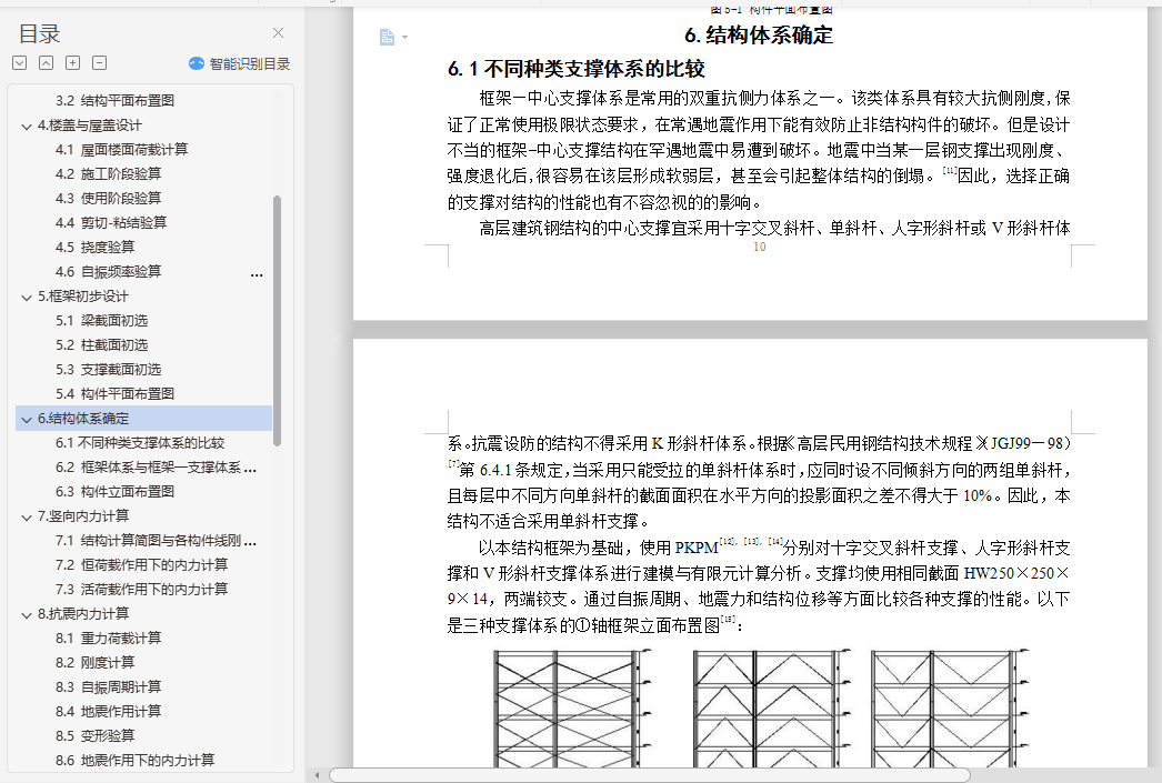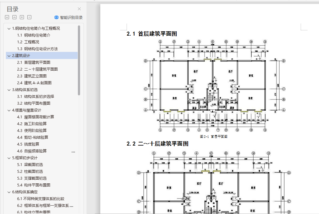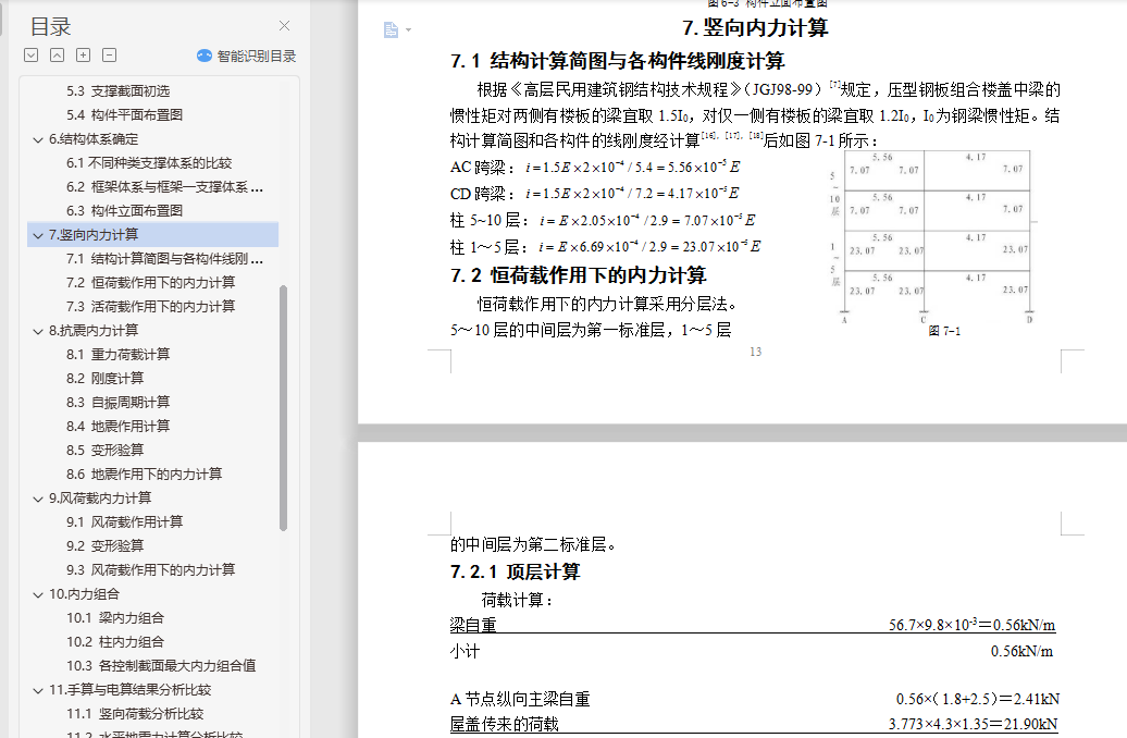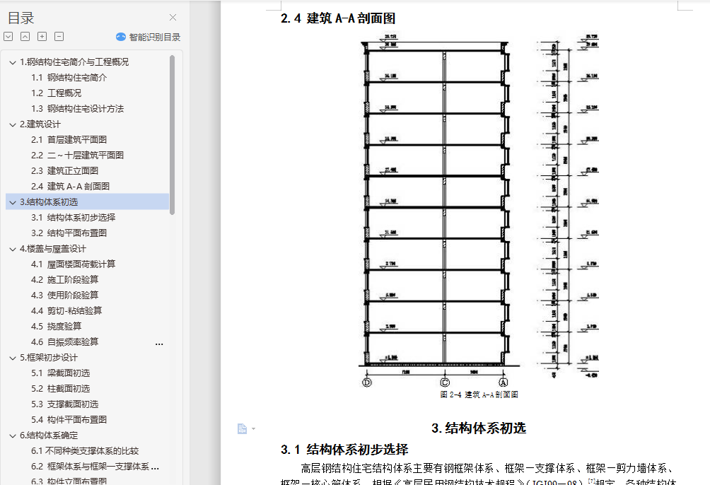 钢结构住宅毕业设计摘 要随着经济快速增长,具有强度高、质量轻等优点的钢结构住宅在国内外得到广泛的应用。本文阐述了某地区的一栋10层高钢结构住宅的设计过程,抗震设防烈度为8级。设计内容包括建筑设计、结构体系方案选择与结构设计三部分。结构体系方案主要通过比较不同方案抗震性能确定。结构设计包括手算设计楼板以及一品框架的竖向内力作用、地震作用以及风荷载作用,配合电算进行构件截面设计、节点设计以及施工图的绘制等。此外,还提出了一些关于钢结构住宅发展的问题。关键词:钢结构住宅;建筑设计;结构体系方案选择;结构设计;抗震性能目 录1.钢结构住宅简介与工程概况 11.1 钢结构住宅简介 11.2 工程概况 11.3 钢结构住宅设计方法 22.建筑设计 22.1 首层建筑平面图 32.2 二~十层建筑平面图 32.3 建筑正立面图 42.4 建筑A-A剖面图 53.结构体系初选 53.1 结构体系初步选择 53.2 结构平面布置图 64.楼盖与屋盖设计 64.1 屋面楼面荷载计算 74.2 施工阶段验算 74.3 使用阶段验算 84.4 剪切-粘结验算 84.5 挠度验算 84.6 自振频率验算 95.框架初步设计 95.1 梁截面初选 95.2 柱截面初选 95.3 支撑截面初选 105.4 构件平面布置图 106.结构体系确定 106.1不同种类支撑体系的比较 106.2 框架体系与框架―支撑体系的结构性能比较 126.3 构件立面布置图 137.竖向内力计算 137.1 结构计算简图与各构件线刚度计算 137.2 恒荷载作用下的内力计算 137.3 活荷载作用下的内力计算 228.抗震内力计算 248.1 重力荷载计算 248.2 刚度计算 258.3 自振周期计算 278.4 地震作用计算 288.5 变形验算 288.6 地震作用下的内力计算 299.风荷载内力计算 329.1 风荷载作用计算 329.2 变形验算 339.3 风荷载作用下的内力计算 3310.内力组合 3510.1 梁内力组合 3510.2 柱内力组合 3610.3 各控制截面最大内力组合值 3811.手算与电算结果分析比较 3911.1 竖向荷载分析比较 3911.2 水平地震力计算分析比较 4111.3 电算主要计算指标 4212.截面验算 4412.1 框架柱的计算长度 4412.2 框架柱截面验算 4512.3 框架梁截面验算 4712.4 支撑截面验算 4812.5 组合次梁设计 4812.6 钢框架梁柱节点全塑性承载力验算 4912.7 节点域抗剪强度验算 4912.8 抗震构造措施验算 4913.节点设计 5013.1 柱脚节点设计 5013.2 柱与柱的拼接连接设计 5113.3 梁柱节点设计 5113.4 次梁与主梁连接节点设计 5213.5 支撑节点设计 5314.楼梯设计与基础设计 5414.1 楼梯设计 5414.2 基础设计 5515.防锈防火设计 5515.1 防锈处理 5515.2 防火处理 5516.结语 57参考文献: 58