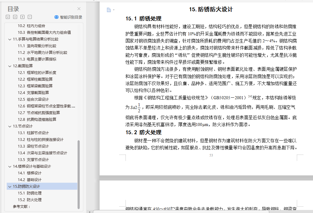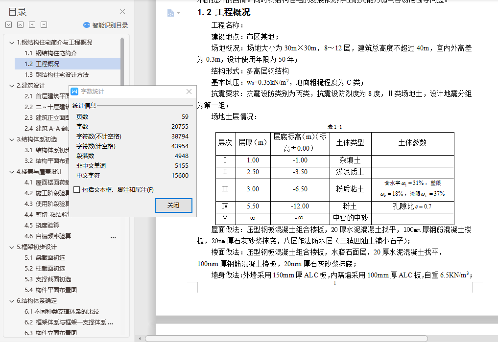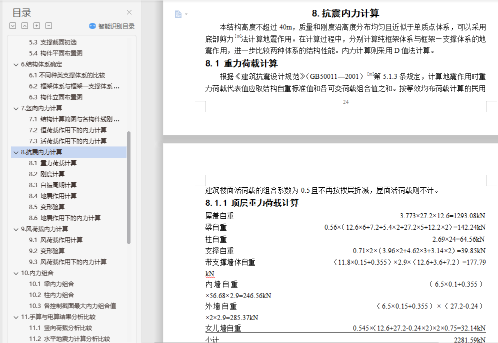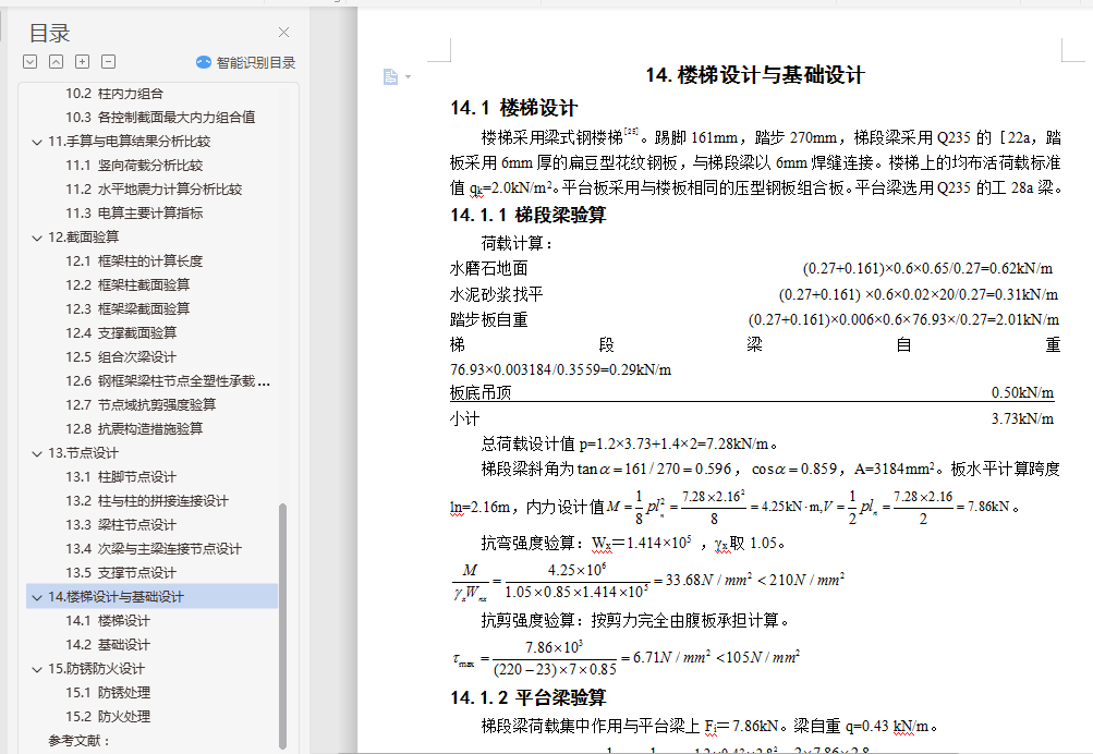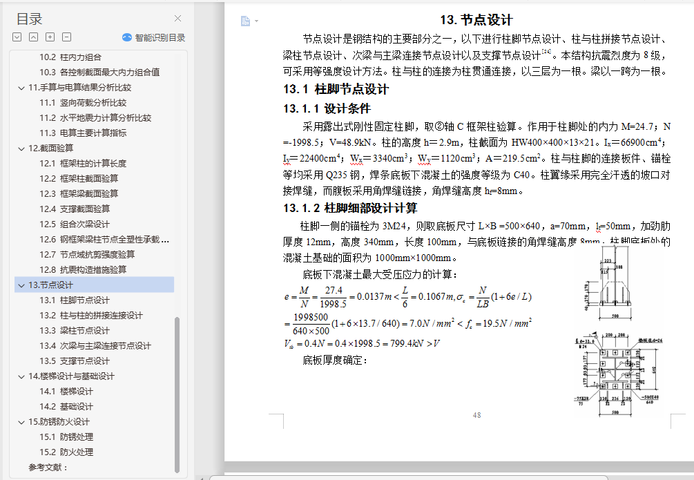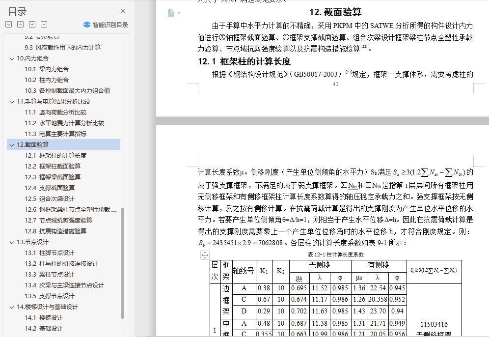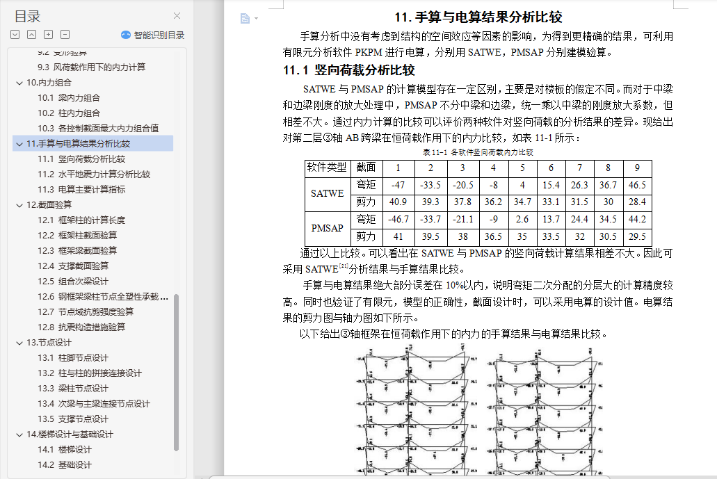 钢结构住宅毕业设计摘 要随着经济快速增长,具有强度高、质量轻等优点的钢结构住宅在国内外得到广泛的应用。本文阐述了某地区的一栋10层高钢结构住宅的设计过程,抗震设防烈度为8级。设计内容包括建筑设计、结构体系方案选择与结构设计三部分。结构体系方案主要通过比较不同方案抗震性能确定。结构设计包括手算设计楼板以及一品框架的竖向内力作用、地震作用以及风荷载作用,配合电算进行构件截面设计、节点设计以及施工图的绘制等。此外,还提出了一些关于钢结构住宅发展的问题。关键词:钢结构住宅;建筑设计;结构体系方案选择;结构设计;抗震性能目 录1.钢结构住宅简介与工程概况 11.1 钢结构住宅简介 11.2 工程概况 11.3 钢结构住宅设计方法 22.建筑设计 22.1 首层建筑平面图 32.2 二~十层建筑平面图 32.3 建筑正立面图 42.4 建筑A-A剖面图 53.结构体系初选 53.1 结构体系初步选择 53.2 结构平面布置图 64.楼盖与屋盖设计 64.1 屋面楼面荷载计算 74.2 施工阶段验算 74.3 使用阶段验算 84.4 剪切-粘结验算 84.5 挠度验算 84.6 自振频率验算 95.框架初步设计 95.1 梁截面初选 95.2 柱截面初选 95.3 支撑截面初选 105.4 构件平面布置图 106.结构体系确定 106.1不同种类支撑体系的比较 106.2 框架体系与框架―支撑体系的结构性能比较 126.3 构件立面布置图 137.竖向内力计算 137.1 结构计算简图与各构件线刚度计算 137.2 恒荷载作用下的内力计算 137.3 活荷载作用下的内力计算 228.抗震内力计算 248.1 重力荷载计算 248.2 刚度计算 258.3 自振周期计算 278.4 地震作用计算 288.5 变形验算 288.6 地震作用下的内力计算 299.风荷载内力计算 329.1 风荷载作用计算 329.2 变形验算 339.3 风荷载作用下的内力计算 3310.内力组合 3510.1 梁内力组合 3510.2 柱内力组合 3610.3 各控制截面最大内力组合值 3811.手算与电算结果分析比较 3911.1 竖向荷载分析比较 3911.2 水平地震力计算分析比较 4111.3 电算主要计算指标 4212.截面验算 4412.1 框架柱的计算长度 4412.2 框架柱截面验算 4512.3 框架梁截面验算 4712.4 支撑截面验算 4812.5 组合次梁设计 4812.6 钢框架梁柱节点全塑性承载力验算 4912.7 节点域抗剪强度验算 4912.8 抗震构造措施验算 4913.节点设计 5013.1 柱脚节点设计 5013.2 柱与柱的拼接连接设计 5113.3 梁柱节点设计 5113.4 次梁与主梁连接节点设计 5213.5 支撑节点设计 5314.楼梯设计与基础设计 5414.1 楼梯设计 5414.2 基础设计 5515.防锈防火设计 5515.1 防锈处理 5515.2 防火处理 5516.结语 57参考文献: 58