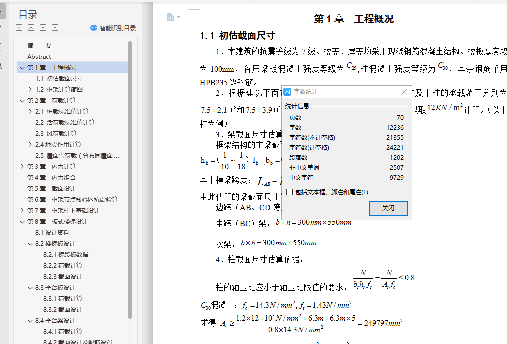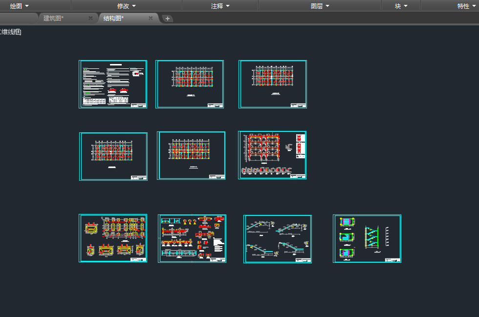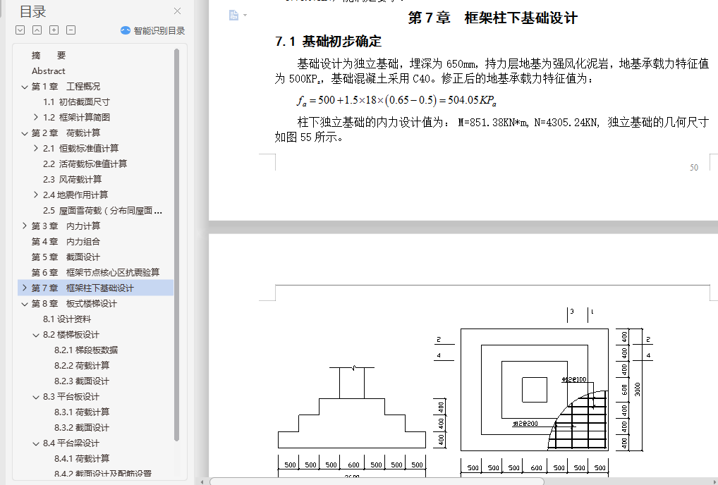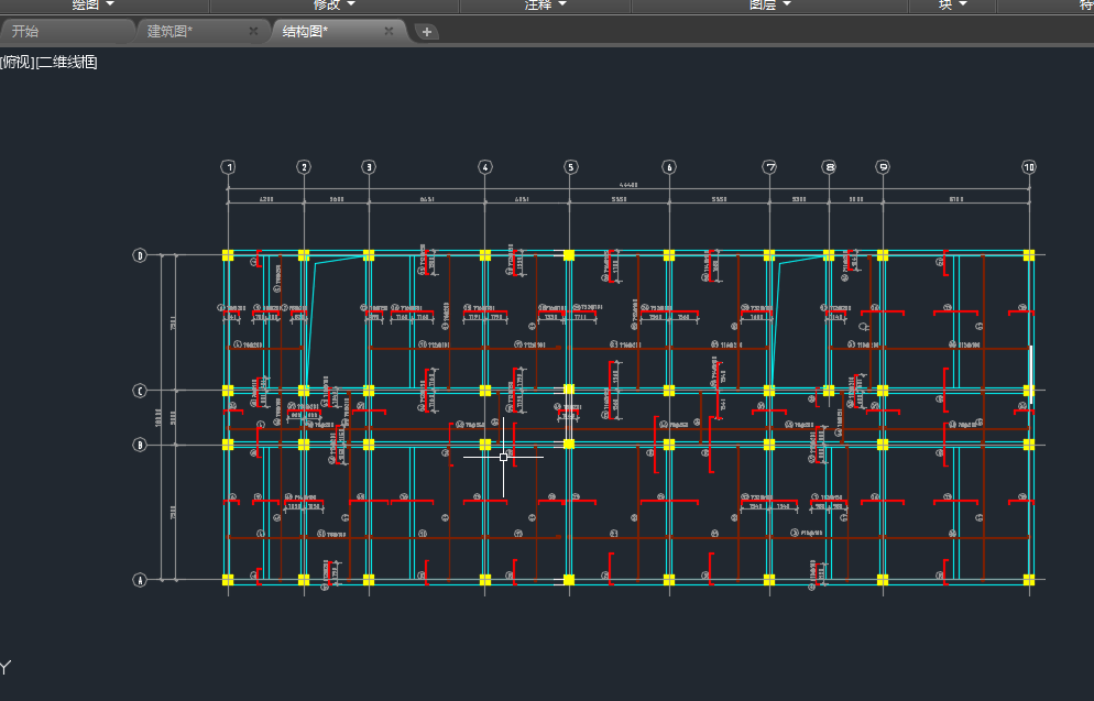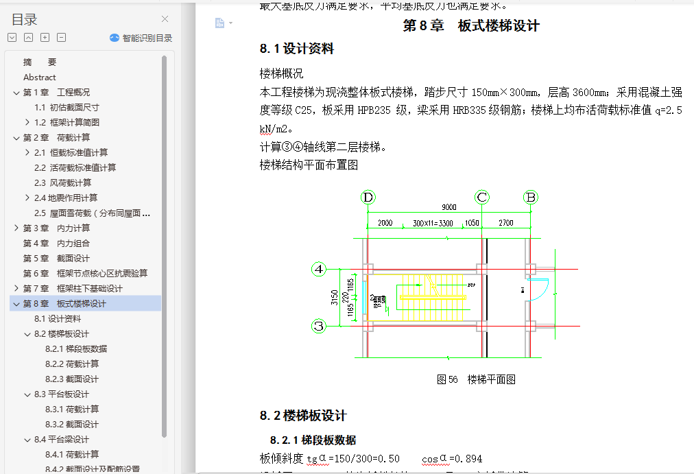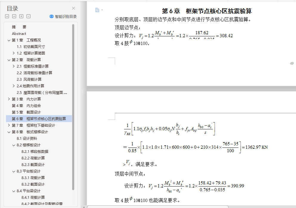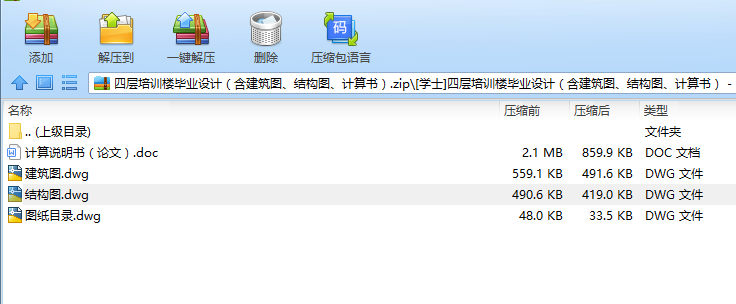 本设计主要进行了结构方案中横向框架2、3、7、8轴框架的抗震设计。在确定框架布局之后,先进行了层间荷载代表值的计算,接着利用顶点位移法求出自振周期,进而按底部剪力法计算水平地震荷载作用下大小,进而求出在水平荷载作用下的结构内力(弯矩、剪力、轴力)。接着计算竖向荷载(恒载及活荷载)作用下的结构内力,找出最不利的一组或几组内力组合。 选取最安全的结果计算配筋并绘图。此外还进行了结构方案中的室内楼梯的设计。完成了平台板,梯段板,平台梁等构件的内力和配筋计算及施工图绘制。