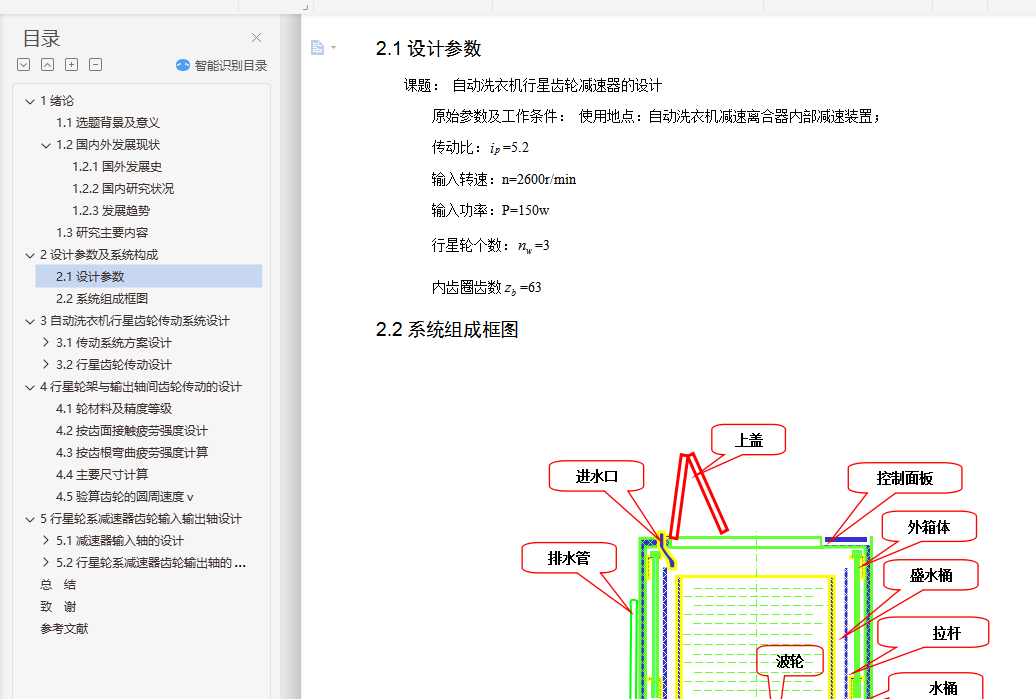 The design content is mainly to understand the development of planetary gear reducer;to use the knowledge learned to analyze and study it,so that students can fully understand and master the use of reference books,design methods and steps. Understand the development of automatic washing machine planetary gear reducer at home and abroad;automatic washing machine rotary system scheme design;planetary gear reducer structure design;rotary mechanism design calculation.