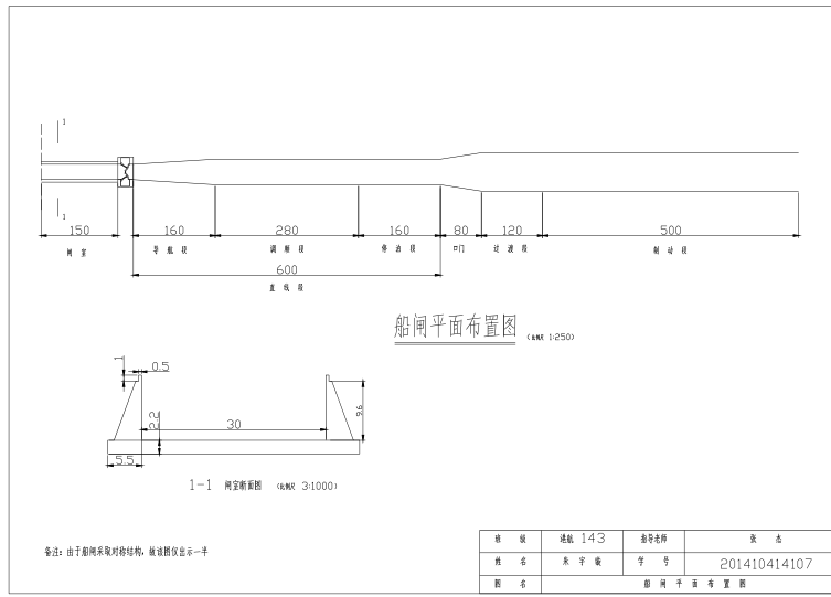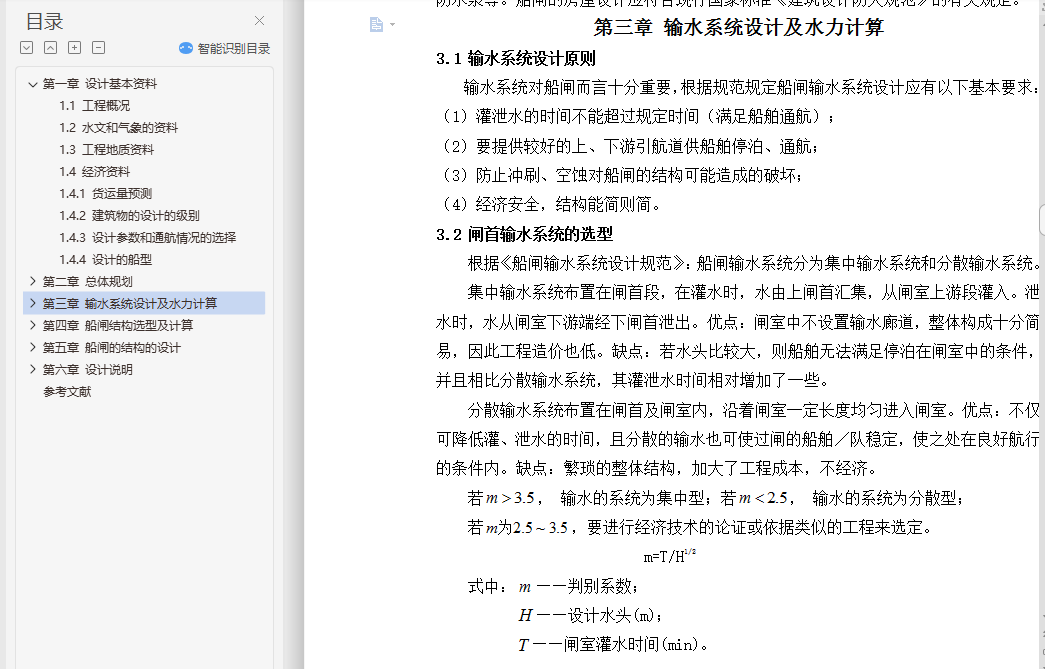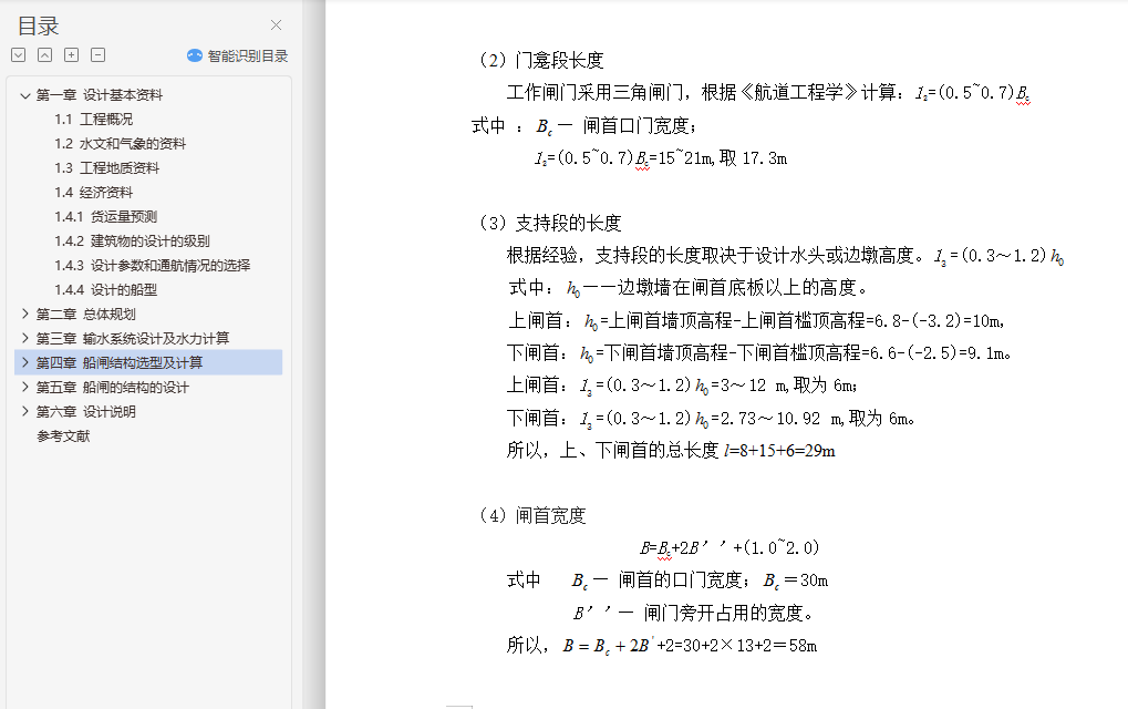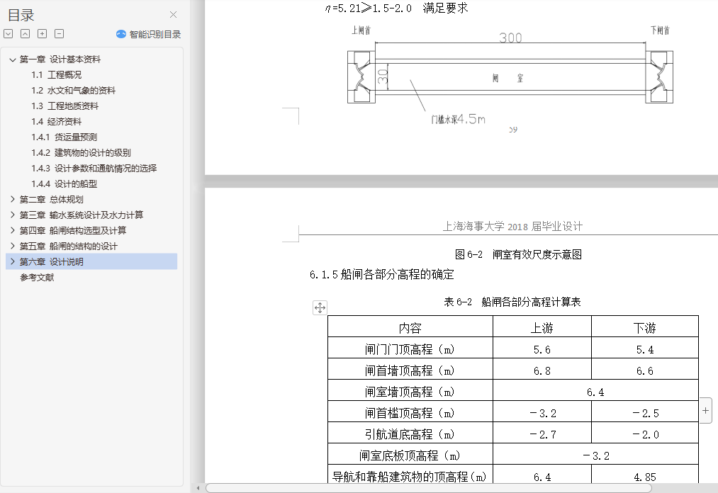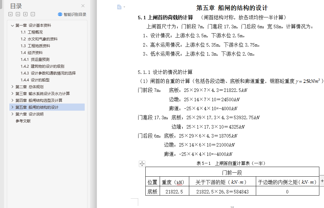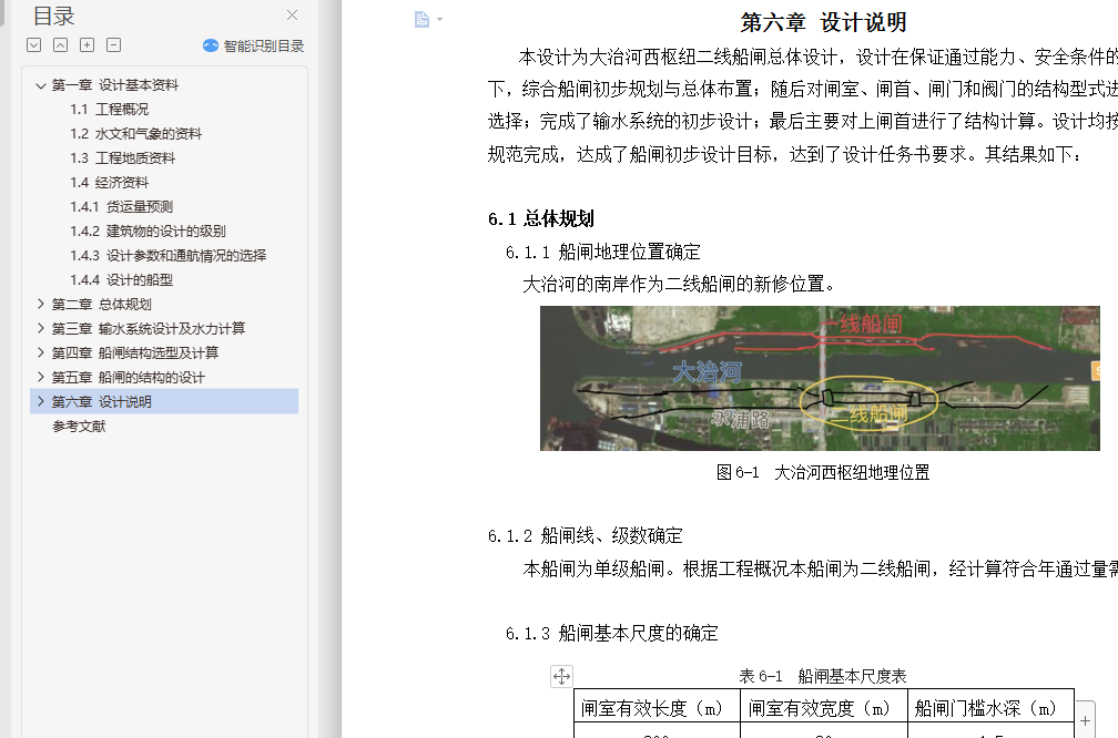 本设计为大治河西枢纽二线船闸基本的设计,从社会的经济、自然的条件考虑,在确保安全和通过能力的前提下,综合考量船闸总体的布置与初步的规划,有船闸地理位置的选择,引航道、船闸的高程及平面布置,以及船闸的耗水量和通过能力的计算;选定船闸各部位的结构型式;初步设计输水系统:如水力计算、廊道尺寸的确定以及型式选择等;最后是上闸首结构计算,有荷载的计算、稳定性的验算及底板的配筋计算。设计之中各项的拟定与计算均按现行的规范进行,实现船闸基本设计的目标,达到任务书的要求。