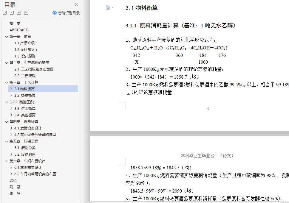 3.1.1 原料消耗量计算(基准:1吨无水乙醇) 9