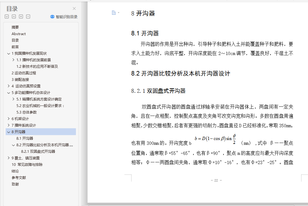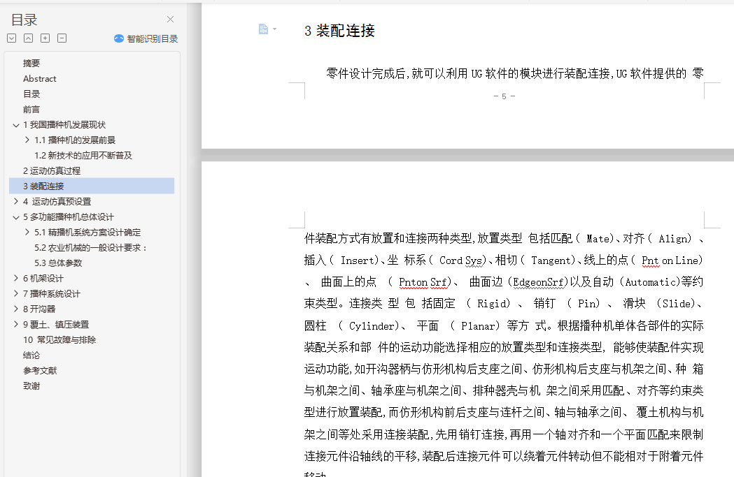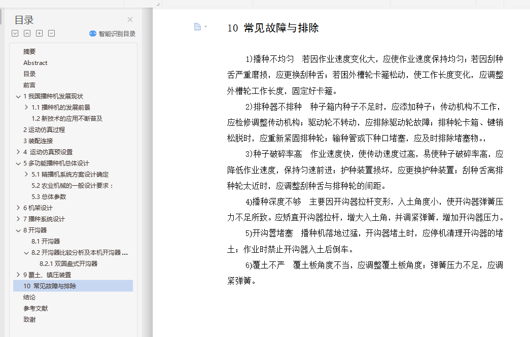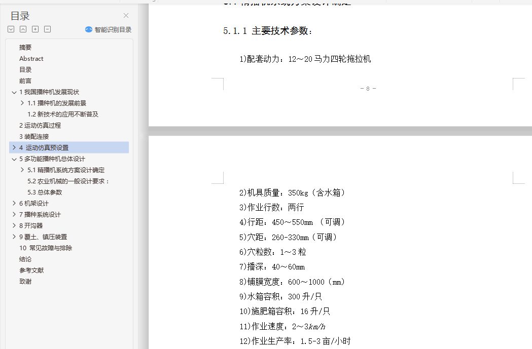 针对长期以来播种机的研制存在生产周期长、成本高,而且当产品制出后,经常会 出现部件、零部件之间相互干涉而无法装配等缺点,介绍了应用UG软件进行播种机单 体虚拟制造和运动仿真的过程。 首先对建立的播种机单体零件三维模型进行约束和连接 装配,形成播种机单体整机装配,然后进行运动仿真,展示在虚拟环境下的运动特性。 最 后对仿真结果进行处理,测试播种机单体的运动性能和检测干涉情况,从而对错误进行修 改。 结果表明:该方法提高了播种机设计的准确性和效率,代替了物理样机的制造和试 验,大大降低了成本。