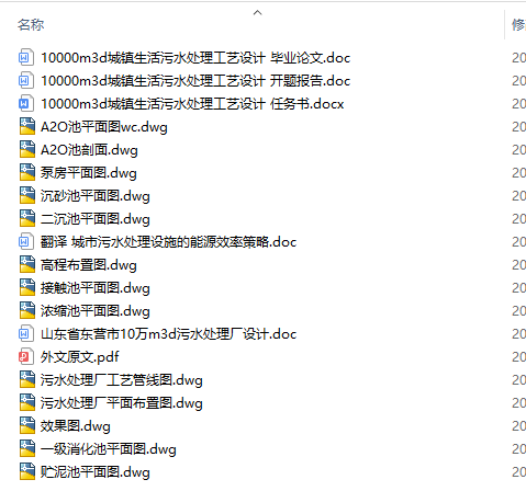 污水处理厂初步设计要求完成设计说明书一份、污水处理厂总平面图一张及污水处理厂污水与污泥高程图一张;单项处理构筑物设计中,主要是完成主体处理构筑物的选型以及平面图的绘制。