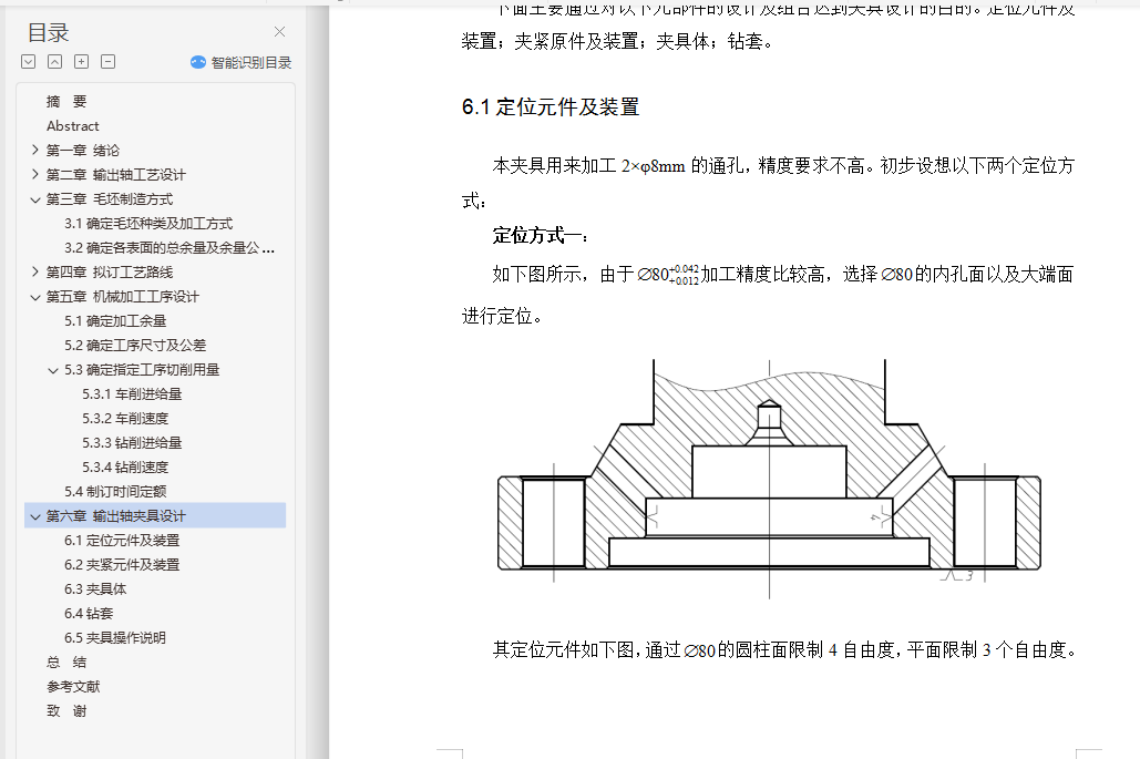 本文的研究内容是通过分析输出轴零件图,熟练地应用用PRO/E或UG设计夹具,确定装夹方案,并将工件及夹具装配;粗略地计算定位误差与夹紧力,确定工艺路线并编制工艺卡片;绘制工装夹具图。