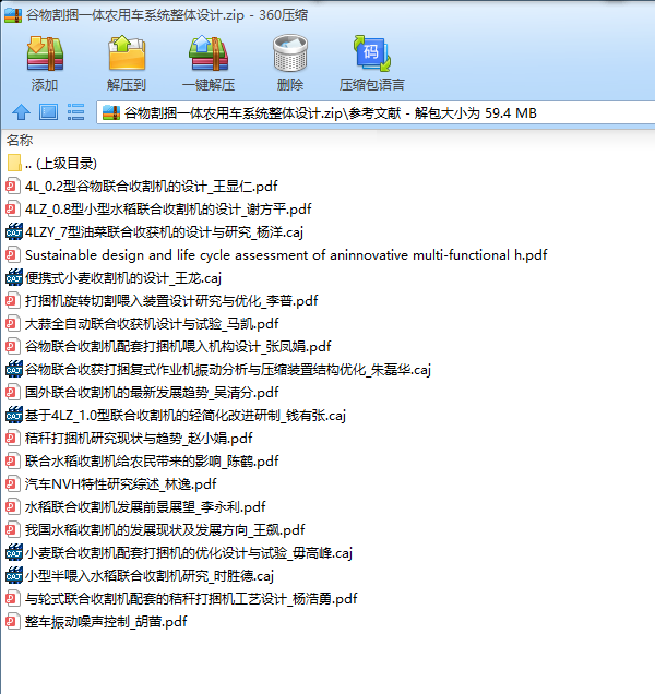 摘要:谷物作为作为我国第一大农作物,与之相对应的我国谷物割捆一体农用车发展十分迟滞。本文的出发点正鉴于此,以现有的谷物割捆一体农用车为什么不能适应中国的谷物种植农艺为出发点,选取最具代表性的前悬挂式谷物割捆一体农用车进行改进创新设计,使改进后的机型能够让农机与农艺得到最大限度的结合。本文对谷物割捆一体农用车进行了整体的机构理论研究。分析国内外的各种型号的谷物割捆一体农用车的使用与现状,找到适应我国情况的相应机型,并对其中的关键部位进行了设计计算,保证了机构运行的可靠性。