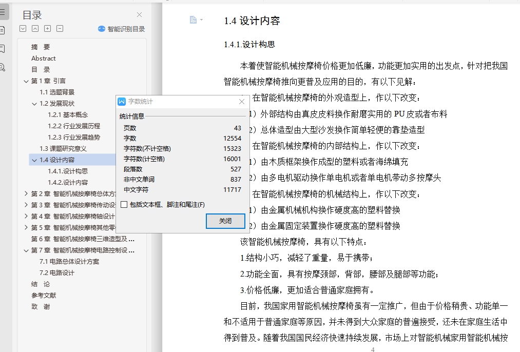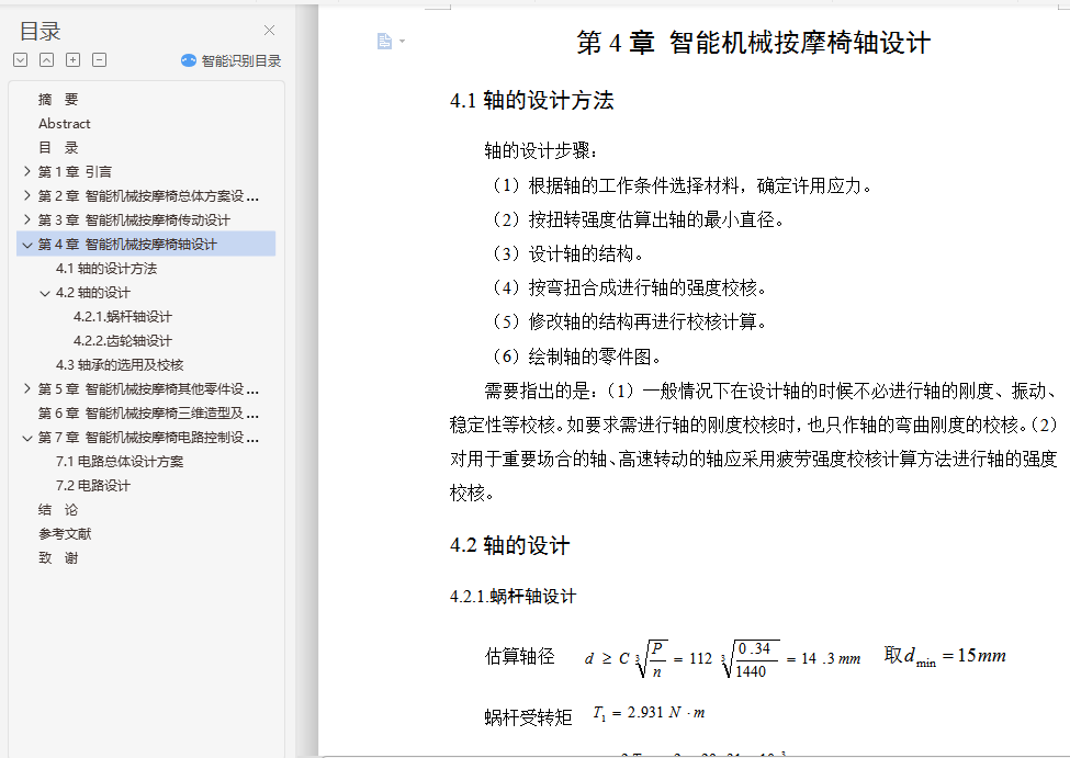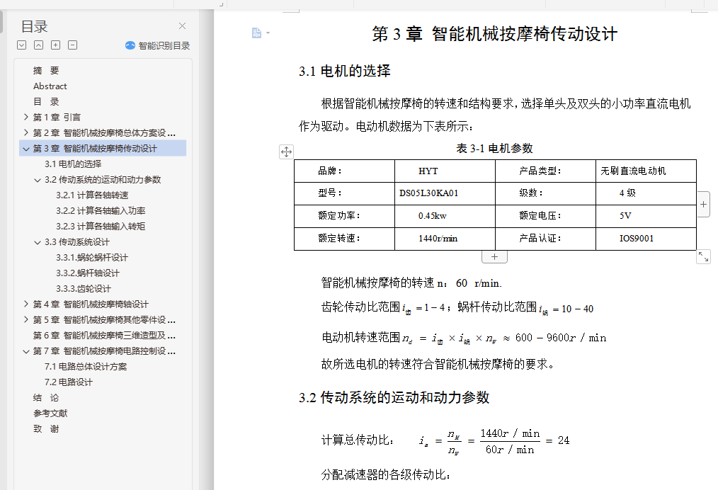 本次设计采用机械创新设计完成了按摩椅的多个功能的实现。产品背部按摩部分通过动滑轮、定滑轮和限位开关等实现按摩轮上下滚动按摩,避免物理损伤;在主传动轴两端采用形位配合与夹持装置,实现轴向滑动与周向转动,通过主传动轴的运动分流实现背部和腰部的运动协调控制。论文详细论述了该智能机械按摩椅的功能设计、结构设计、运动和受力分析、材料选用和校核等,并利用PRO/E三维设计软件对零件建模,完成智能机械按摩椅的三维造型和运动仿真。