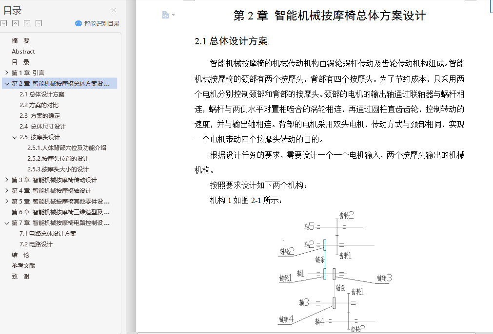 This design adopts the mechanical innovation design to complete the realization of multiple functions of the massage chair. Product back massage part through moving pulley,fixed pulley and limit switch to achieve massage wheel up and down rolling massage,to avoid physical damage;in the main driving shaft at both ends of the shape and position matching and clamping device to achieve axial sliding and circumferential rotation,through the main driving shaft movement shunt to achieve back and waist movement coordination control. The paper discusses in detail the function design,structure design,movement and force analysis,material selection and checking of the intelligent mechanical massage chair,and makes use of PRO/E 3D design software to model the parts to complete the intelligent mechanical massage chair 3D modeling and motion simulation.