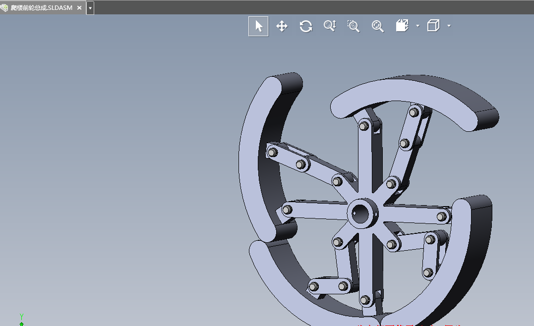 本次设计对一种新型爬楼装置进行了结构设计。新型爬楼装置需要能够运送重物并且能够以一定速度上下楼梯,这就要求设计出符合要求的爬楼机构、下楼机构、能保持水平机座。在本次设计中爬楼机构采用的是一个在平路上行走时,可变轮收缩成跟普通轮一样的轮子,可在平稳的路面上行驶。当爬楼梯时,爬升爪张开,通过爪与楼梯接触,使整个车架上升,从而完成爬楼过程。可变轮采用双电机结构,正常时,两个电机工作状态相同,当需要转弯时,通过控制电机,使两轮转速一大一小来实现转弯。本中设计中的新型爬楼装置结构简洁合理而且十分紧凑,符合设计说明书提出的各项技术要求,能满足生产实践的需要。运用Solidworks三维设计软件以及cad绘图软件进行了三维设计并且绘制了二维工程图纸。