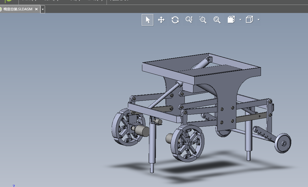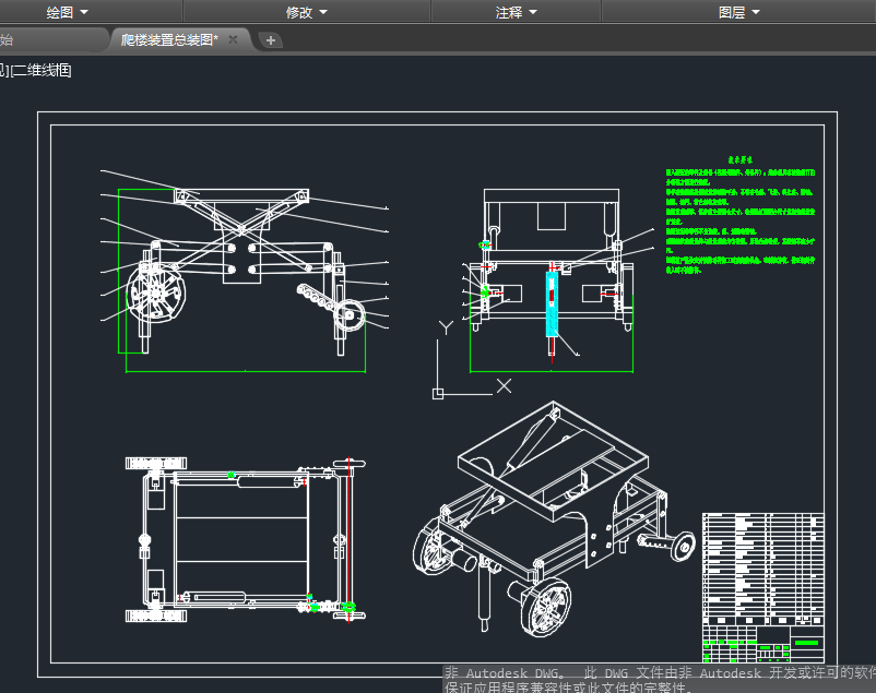 This design has carried on the structure design to a new type climbing device. The new climbing device needs to be able to carry heavy objects and can go up and down stairs at a certain speed,which requires the design of a climbing mechanism that meets the requirements,a lower building mechanism,and a horizontal machine seat. In this design,the climbing mechanism uses a flat road when walking,the variable wheel shrinks to the same wheel as the ordinary wheel,can travel on a smooth road. When climbing the stairs,the climbing claw opens and contacts with the stairs through the claws to make the whole frame rise,thus completing the climbing process. Variable wheel adopts double motor structure,when normal,the two motors work in the same state,when need turn. When,by controlling the motor,make two wheels rotate speed one big one small to achieve turn. The structure of the new climbing device in this design is simple,reasonable and compact,which meets the technical requirements of the design specification and can meet the needs of production practice. The Solidworks 3D design software and cad drawing software are used to carry out 3D design and draw 2D engineering drawings.