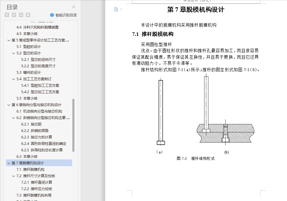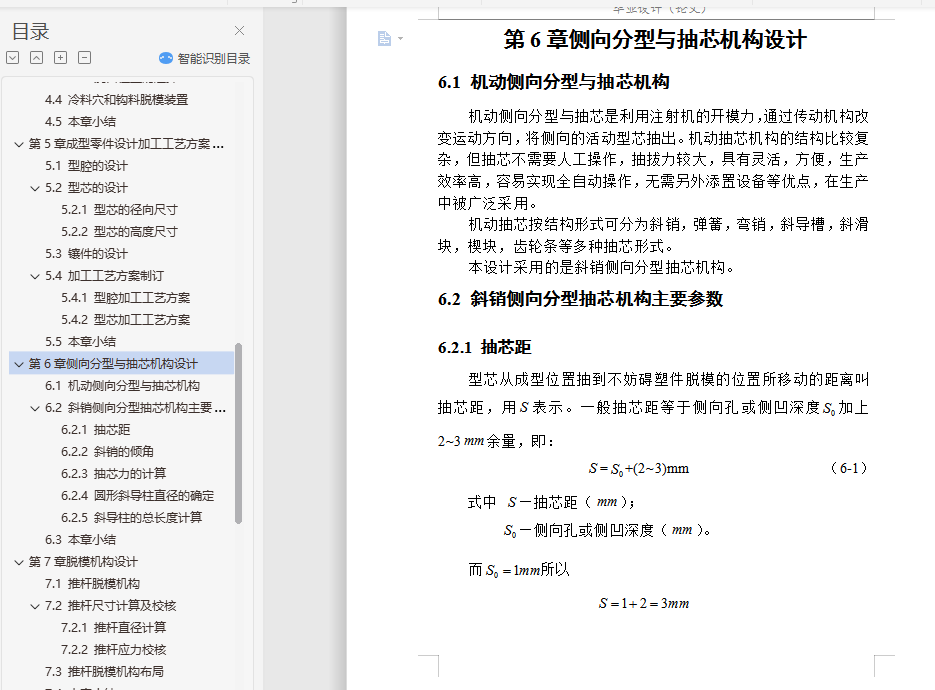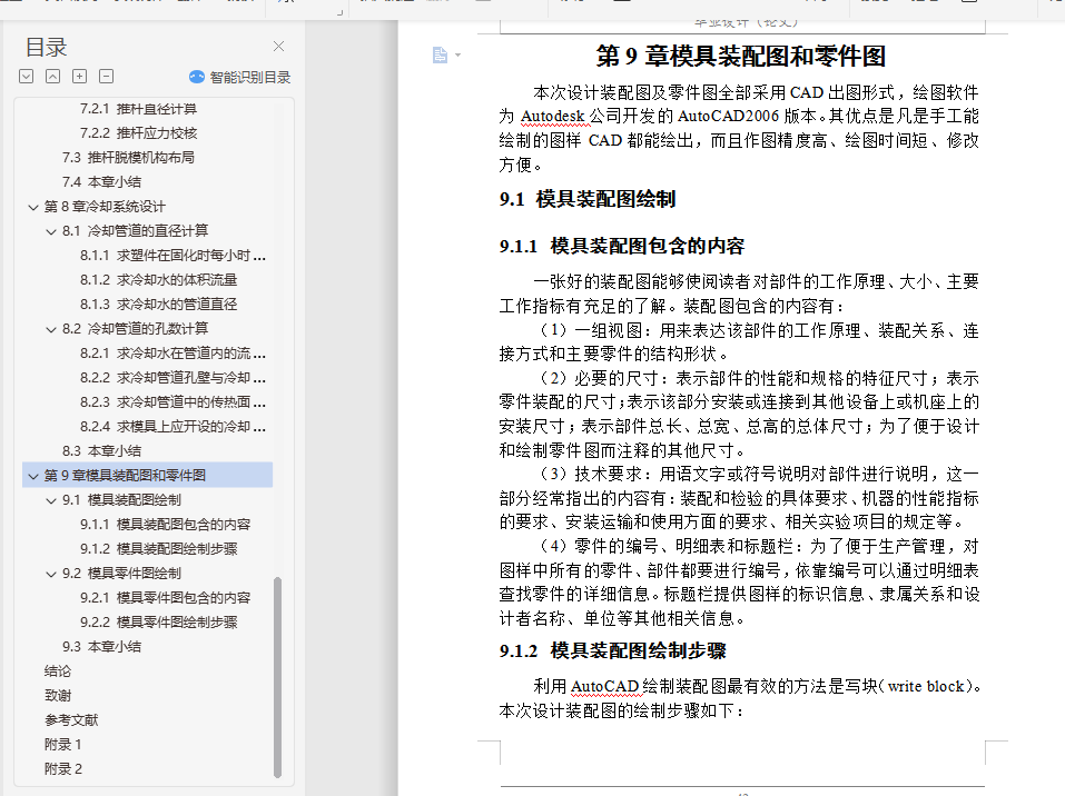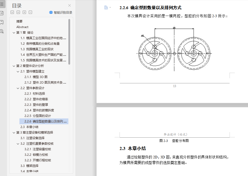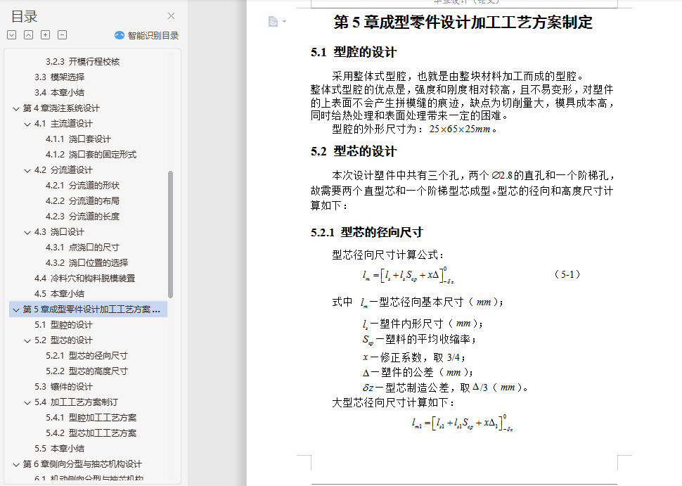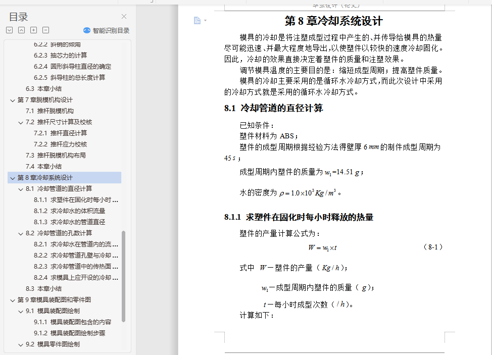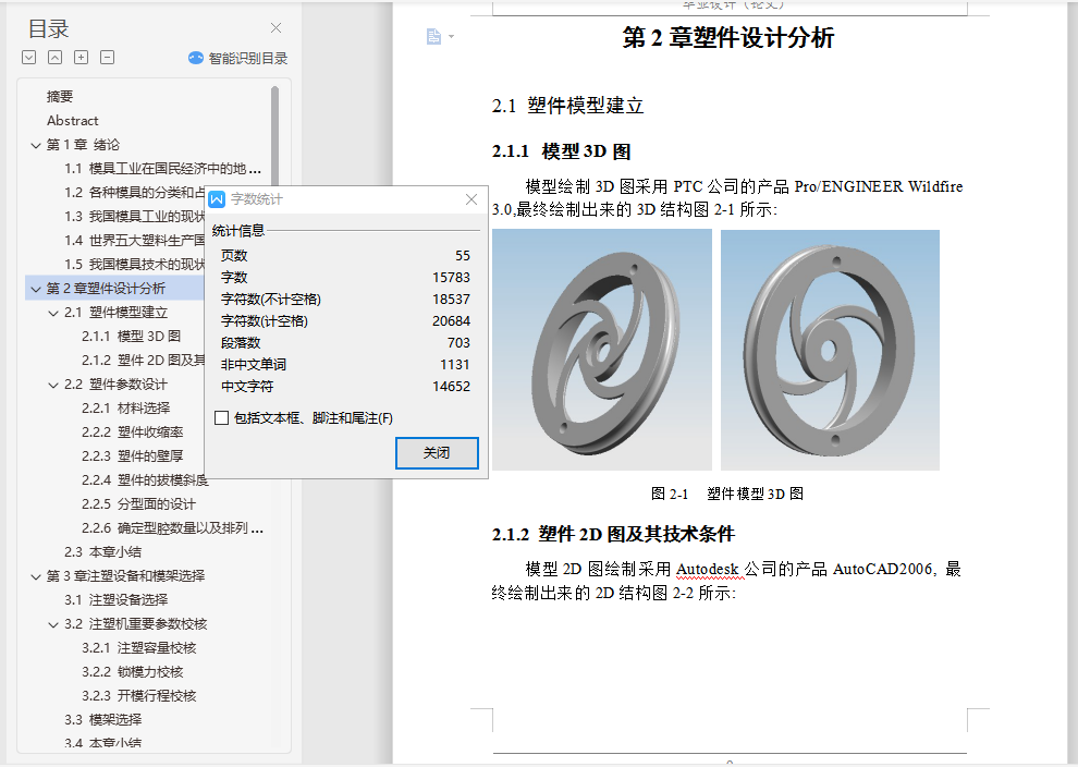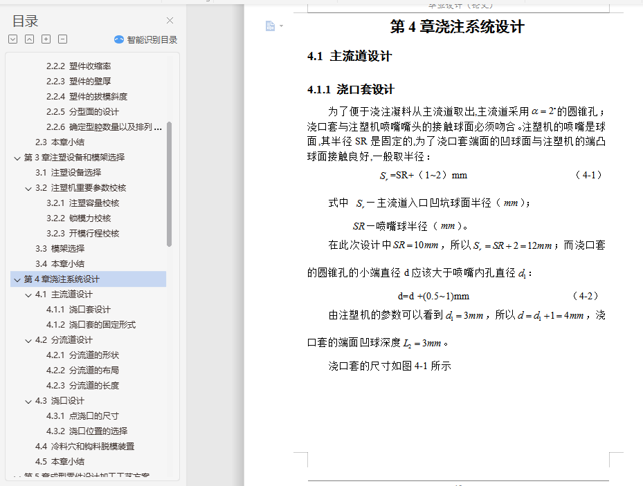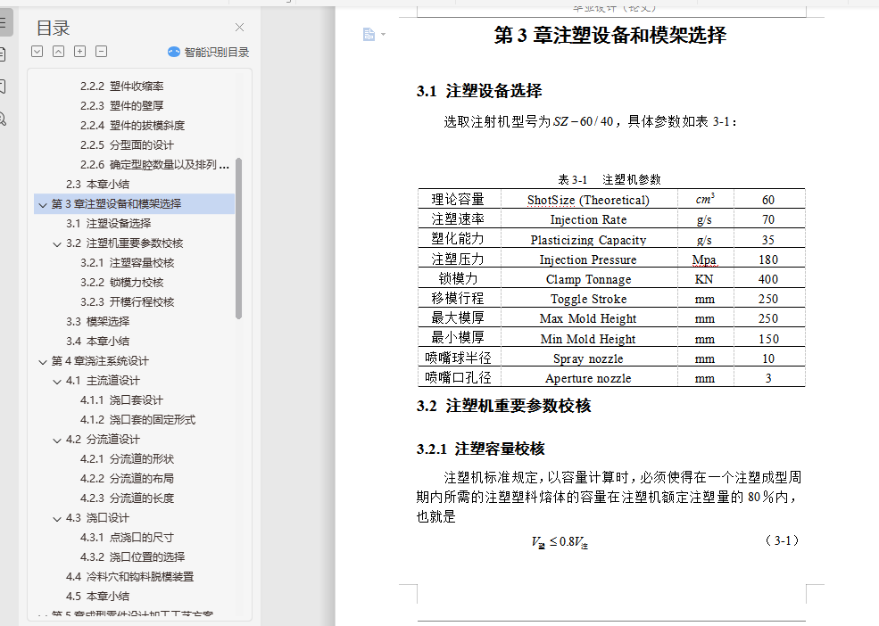 摘要本论文主要通过对工控机散热风扇支架的设计分析,设计出该塑件的模具。在整个模具设计过程中,涉及到了塑件的结构设计、注塑机和模架的选择及注塑机的一些重要工艺参数的校核,并详细叙述了模具设计中的分型面设计、浇注系统设计、成型零件设计、顶出机构设计和冷却系统设计。利用塑料成型模拟分析软件Moldflow的MPI模拟其成型过程,制定合理的工艺方案并优化模具结构,Moldflow可提供如下分析:产品结构是否合理 、怎样选择合适的注塑材料 、怎样确定合理的浇口位置 、浇口位置自动优化 、预测熔接痕位置 、模具型腔是否充满 、最终制品的质量如何 、怎样选择合适的注塑机 、缩痕分析,所以这次设计中Moldflow的引入很重要。本论文基于Pro/E CAD系统,通过该系统,用户可以在可视化平台上交互式的设计注塑模具各个部件,不仅可以避免相似零件设计的重复性,大大提高其设计效率和设计质量,缩短产品的开发周期,而且方便了产品后续的有限元分析,同时也符合了现代设计思想的发展要求。关键词 模具设计;CAD;Pro/E;MoldFlowAbstractThis paper mainly through the plastic parts of the disc design analysis, design of the plastic molds. In the die design process, relate to the structural design of plastic parts, injection molding machines and die-injection molding machines and the choice of a number of important parameters of the verification process, and described in detail the design of the die-design, gating system design , molding parts design, the top agencies to design and cooling system design.In this paper, based on Pro / E CAD system, through the system, users can interactive visualization platform on the injection mold design various components, not only can avoid similar to the repetitive parts design, greatly improving the efficiency of its design and design quality and shorten product development cycle, and facilitate the follow-up product finite element analysis, but also in line with the thinking of the development of modern design requirements.Key words Mold Design;CAD;Pro/E;MoldFlow目 录摘要 IAbstract II第1章 绪论 11.1 模具工业在国民经济中的地位 11.2 各种模具的分类和占有量 21.3 我国模具工业的现状 31.4 世界五大塑料生产国的产能状况 41.5 我国模具技术的现状及发展趋势 7第2章塑件设计分析 92.1 塑件模型建立 92.1.1 模型3D图 92.1.2 塑件2D图及其技术条件 92.2 塑件参数设计 102.2.1 材料选择 102.2.2 塑件收缩率 122.2.3 塑件的壁厚 122.2.4 塑件的拔模斜度 132.2.5 分型面的设计 132.2.6 确定型腔数量以及排列方式 132.3 本章小结 14第3章注塑设备和模架选择 153.1 注塑设备选择 153.2 注塑机重要参数校核 153.2.1 注塑容量校核 153.2.2 锁模力校核 163.2.3 开模行程校核 173.3 模架选择 173.4 本章小结 18第4章浇注系统设计 194.1 主流道设计 194.1.1 浇口套设计 194.1.2 浇口套的固定形式 204.2 分流道设计 204.2.1 分流道的形状 204.2.2 分流道的布局 214.2.3 分流道的长度 214.3 浇口设计 224.3.1 点浇口的尺寸 224.3.2 浇口位置的选择 224.4 冷料穴和钩料脱模装置 234.5 本章小结 23第5章成型零件设计加工工艺方案制定 245.1 型腔的设计 245.2 型芯的设计 245.2.1 型芯的径向尺寸 245.2.2 型芯的高度尺寸 255.3 镶件的设计 275.4 加工工艺方案制订 275.4.1 型腔加工工艺方案 275.4.2 型芯加工工艺方案 285.5 本章小结 28第6章侧向分型与抽芯机构设计 296.1 机动侧向分型与抽芯机构 296.2 斜销侧向分型抽芯机构主要参数 296.2.1 抽芯距 296.2.2 斜销的倾角 306.2.3 抽芯力的计算 306.2.4 圆形斜导柱直径的确定 316.2.5 斜导柱的总长度计算 326.3 本章小结 33第7章脱模机构设计 347.1 推杆脱模机构 347.2 推杆尺寸计算及校核 357.2.1 推杆直径计算 357.2.2 推杆应力校核 357.3 推杆脱模机构布局 367.4 本章小结 36第8章冷却系统设计 378.1 冷却管道的直径计算 378.1.1 求塑件在固化时每小时释放的热量 378.1.2 求冷却水的体积流量 388.1.3 求冷却水的管道直径 398.2 冷却管道的孔数计算 408.2.1 求冷却水在管道内的流速 408.2.2 求冷却管道孔壁与冷却介质之间的传热系数 408.2.3 求冷却管道中的传热面积 418.2.4 求模具上应开设的冷却管道的孔数 418.3 本章小结 42第9章模具装配图和零件图 439.1 模具装配图绘制 439.1.1 模具装配图包含的内容 439.1.2 模具装配图绘制步骤 439.2 模具零件图绘制 449.2.1 模具零件图包含的内容 449.2.2 模具零件图绘制步骤 449.3 本章小结 45结论 46致谢 47参考文献 48附录1 49附录2 50