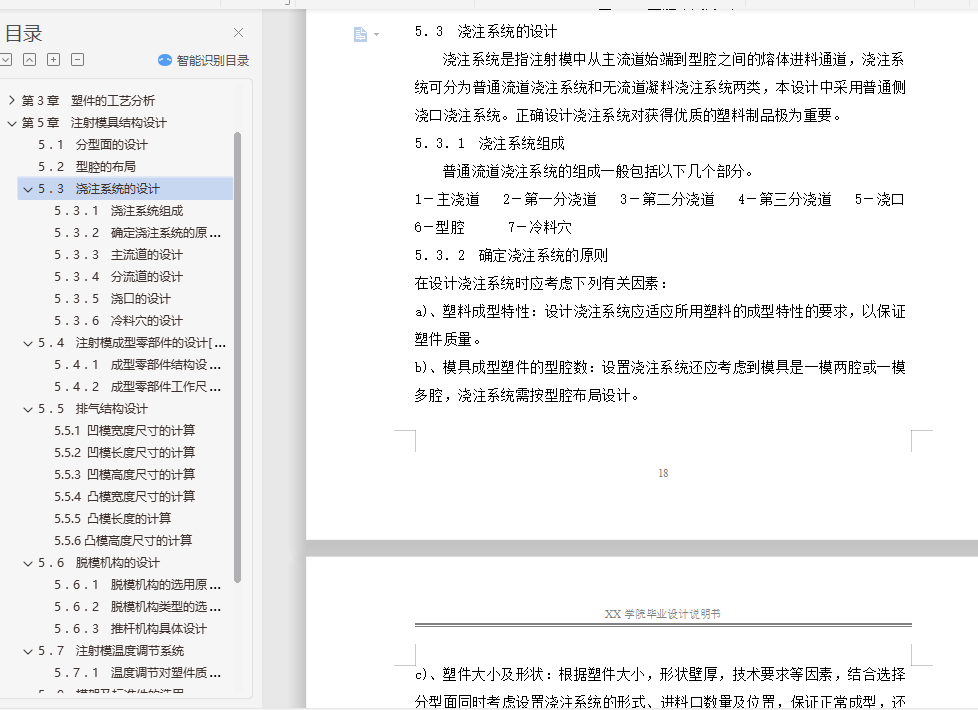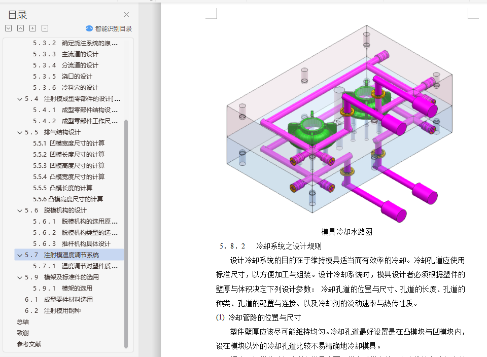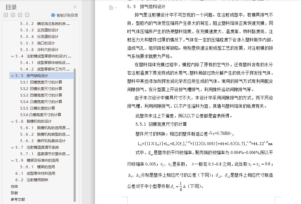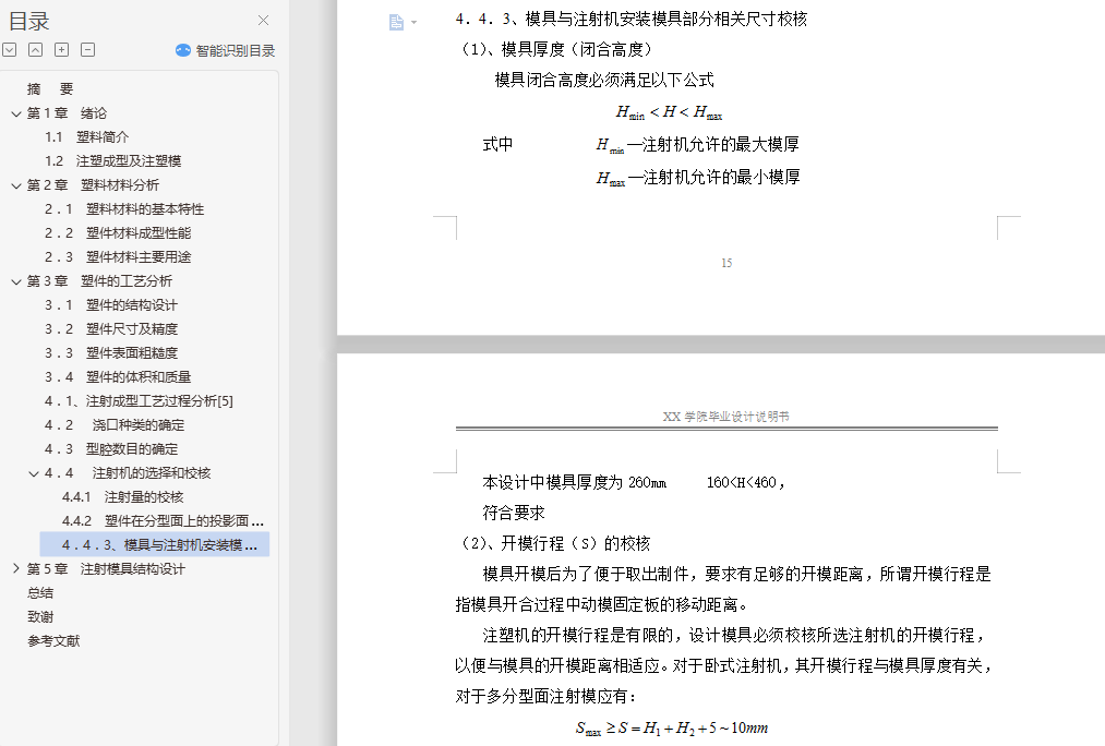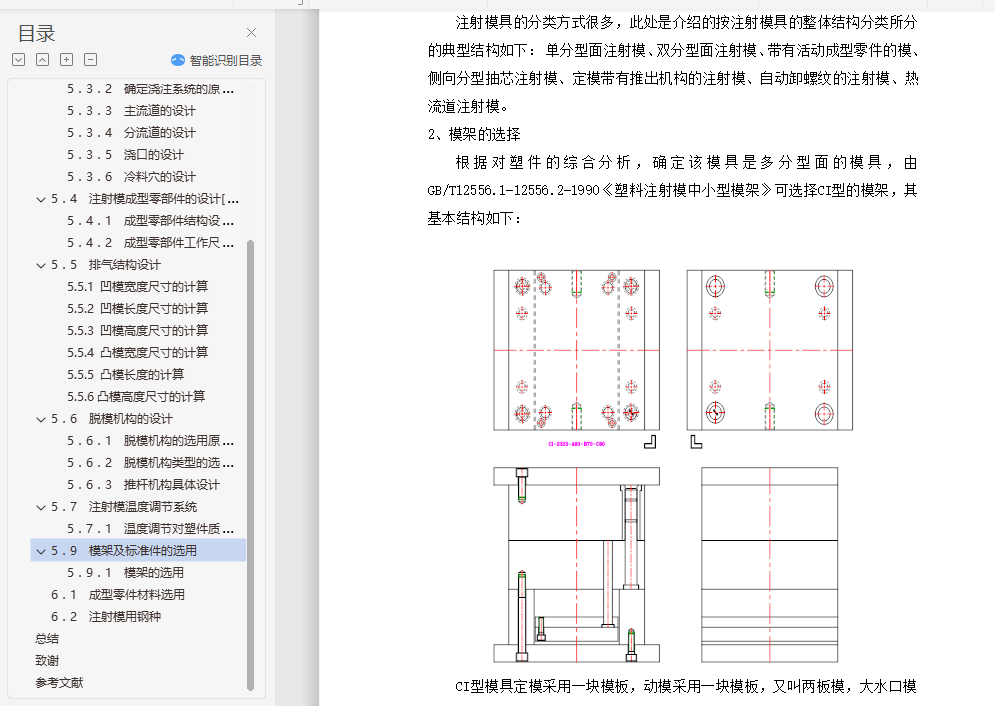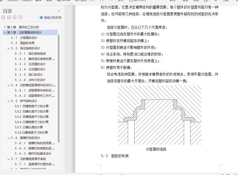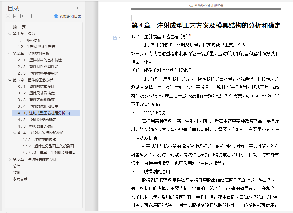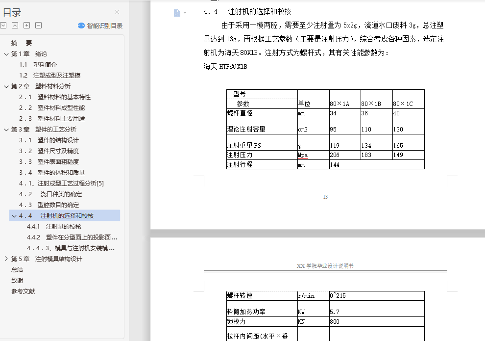 摘 要根据塑料制品的要求,了解塑件的用途,分析塑件的工艺性、尺寸精度等技术要求,选择塑件制件尺寸。本模具采用一模两腔,侧浇口进料,注射机采用海天80X1B型号,设置冷却系统,CAD和UG绘制二维总装图和零件图,选择模具合理的加工方法。附上说明书,系统地运用简要的文字,简明的示意图和和计算等分析塑件,从而作出合理的模具设计。关键词:机械设计;模具设计;CAD绘制二维图;UG绘制3D图,注射机的选择English the moldAbstractAccording to the plastic products requirements, understand the use of plastic parts, technical requirements, analysis of plastic parts size preCIsion technology, selection of plastic parts size. A piece of the mould, point gate feeding, injection machine using the 80X1B model, setting the cooling system, CAD and UG 2D assembly drawing and parts drawing, choose the reasonable processing method of mould. An instruction booklet, the systematic use of a brief text, schematic diagram and calculation of plastic parts and conCIse, so as to make reasonable mold design.Key words: mechanical design; die design; CAD two-dimensional graph drawing; UG rendering of 3D map, the choice of injection machine目 录摘 要 I第1章 绪论 41.1 塑料简介 41.2 注塑成型及注塑模 4第2章 塑料材料分析 72.1 塑料材料的基本特性 72.2 塑件材料成型性能 72.3 塑件材料主要用途 8第3章 塑件的工艺分析 93.1 塑件的结构设计 93.2 塑件尺寸及精度 113.3 塑件表面粗糙度 113.4 塑件的体积和质量 11第4章 注射成型工艺方案及模具结构的分析和确定 124.1、注射成型工艺过程分析[5] 124.2 浇口种类的确定 134.3 型腔数目的确定 134.4 注射机的选择和校核 134.4.1 注射量的校核 144.4.2 塑件在分型面上的投影面积与锁模力的校核 154.4.3、模具与注射机安装模具部分相关尺寸校核 16第5章 注射模具结构设计 175.1 分型面的设计 185.2 型腔的布局 185.3 浇注系统的设计 195.3.1 浇注系统组成 195.3.2 确定浇注系统的原则 195.3.3 主流道的设计 205.3.4 分流道的设计 225.3.5 浇口的设计 225.3.6 冷料穴的设计 235.4 注射模成型零部件的设计[7] 235.4.1 成型零部件结构设计 235.4.2 成型零部件工作尺寸的计算 255.5 排气结构设计 265.5.1 凹模宽度尺寸的计算 265.5.2 凹模长度尺寸的计算 275.5.3 凹模高度尺寸的计算 275.5.4 凸模宽度尺寸的计算 275.5.5 凸模长度的计算 275.5.6凸模高度尺寸的计算 275.6 脱模机构的设计 285.6.1 脱模机构的选用原则 285.6.2 脱模机构类型的选择 285.6.3 推杆机构具体设计 285.7 注射模温度调节系统 295.7.1 温度调节对塑件质量的影响 295.9 模架及标准件的选用 315.9.1 模架的选用 31第6章 模具材料的选用 336.1 成型零件材料选用 336.2 注射模用钢种 33总结 34致谢 36参考文献 37