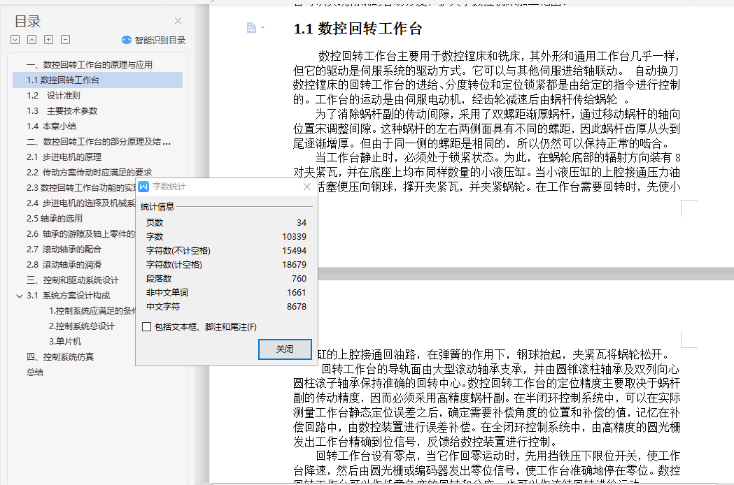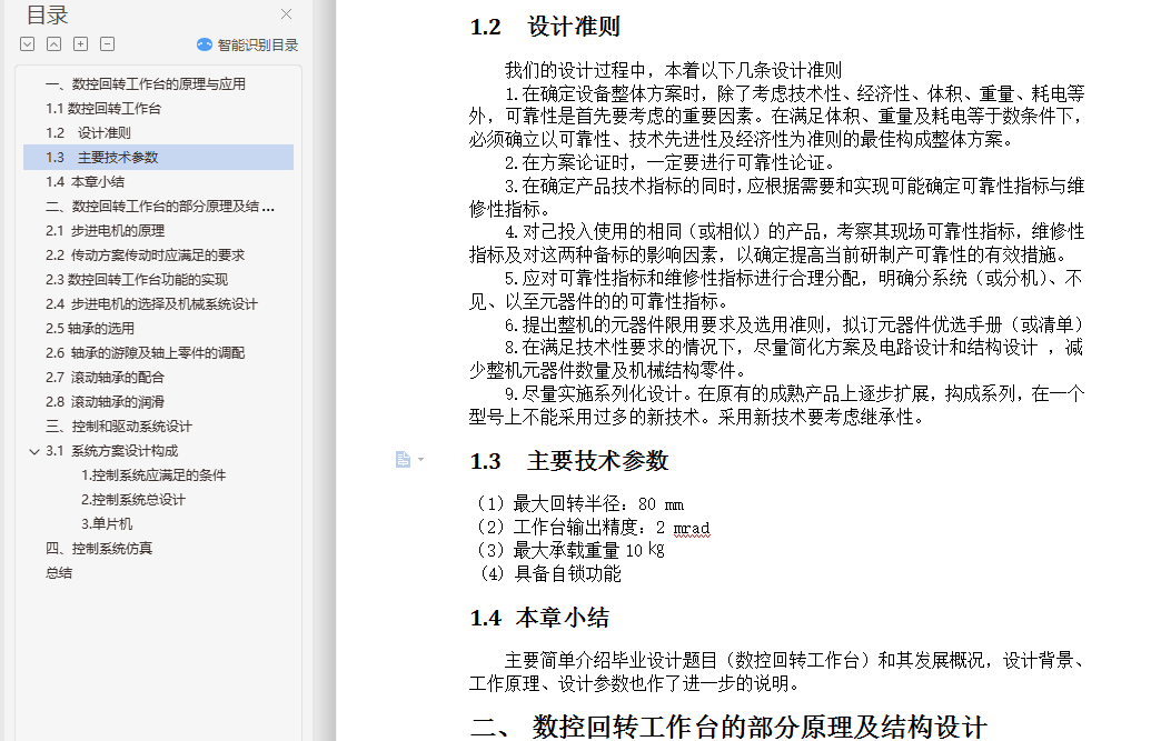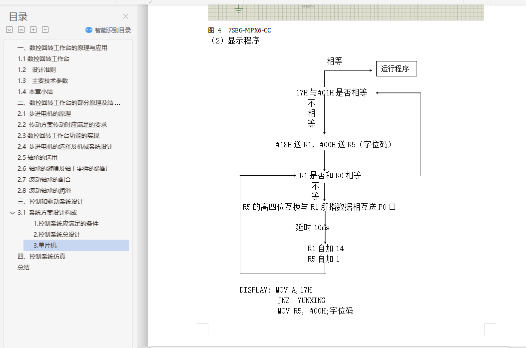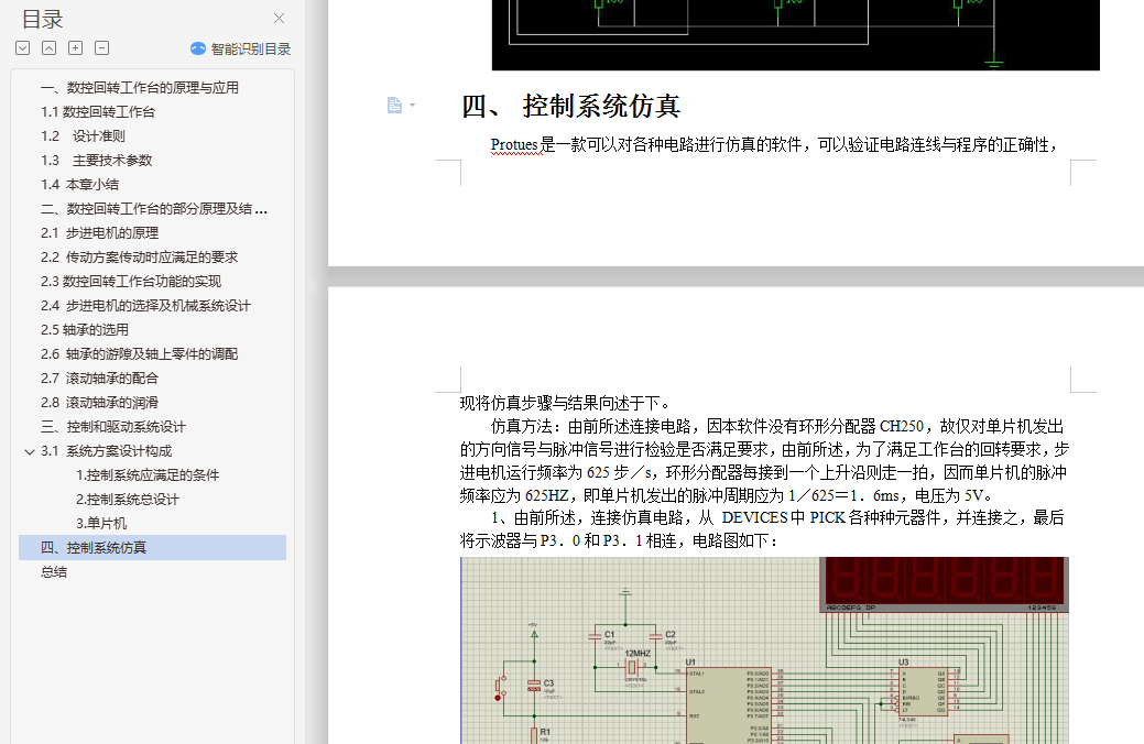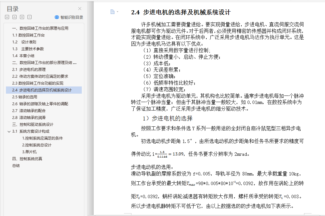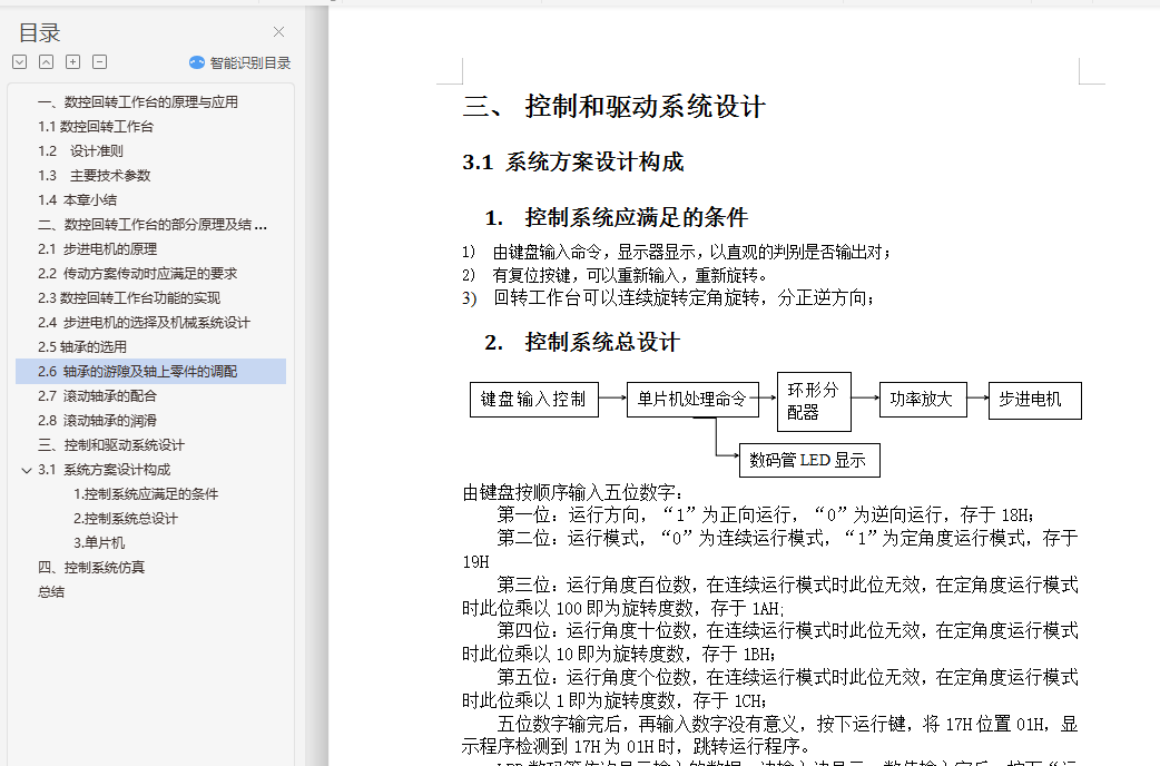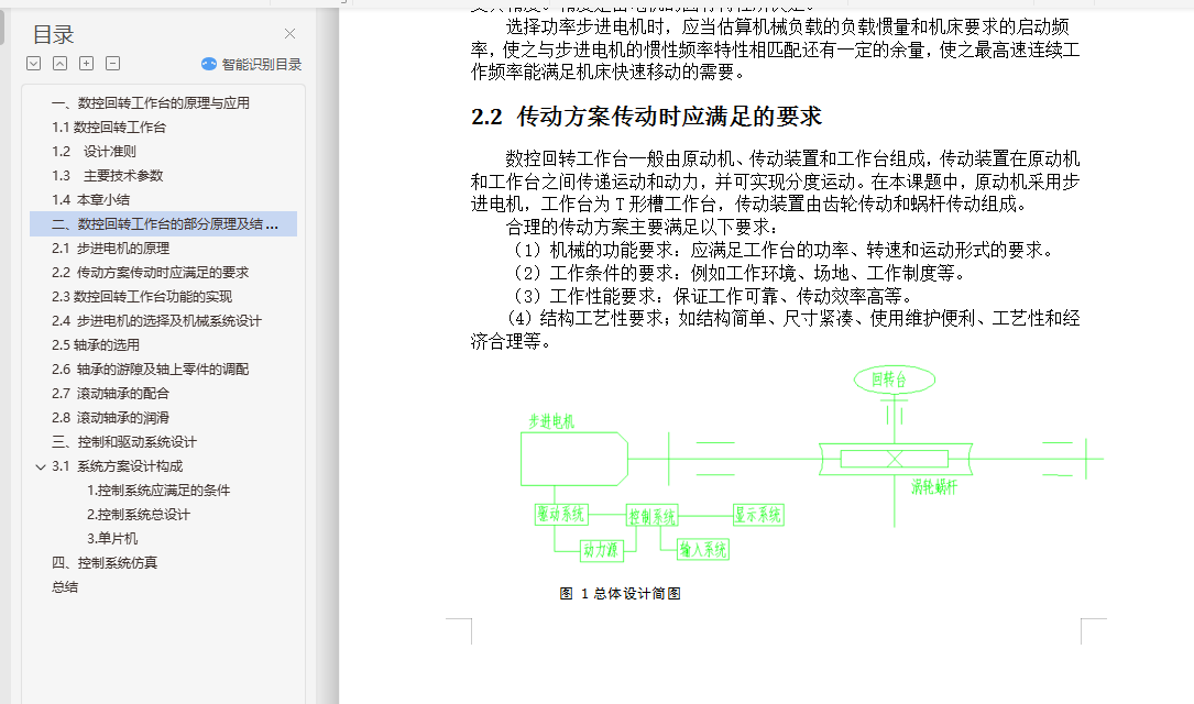 目录一、数控回转工作台的原理与应用 21.1数控回转工作台 21.2 设计准则 31.3 主要技术参数 31.4 本章小结 3二、数控回转工作台的部分原理及结构设计 32.1 步进电机的原理 42.2 传动方案传动时应满足的要求 42.3数控回转工作台功能的实现 52.4 步进电机的选择及机械系统设计 52.5轴承的选用 92.6 轴承的游隙及轴上零件的调配 92.7 滚动轴承的配合 92.8 滚动轴承的润滑 9三、控制和驱动系统设计 103.1 系统方案设计构成 101. 控制系统应满足的条件 102. 控制系统总设计 103. 单片机 10四、控制系统仿真 20总结 22绪论毕业设计主要是培养学生综合应用所学专业的基础理论、基本技能和专业知识的能力,培养学生建立正确的设计思想,掌握工程设计的一般程序、规范和方法。而本科类学生更应侧重于从生产的第一线获得产品的工艺需求和设计思路,获得工程技术经用性岗位的基本训练,通过毕业设计,可树立正确的经济观点和全局观点,实现由学生向工程技术人员的过渡。使学生进一步巩固和加深对所学的知识,使之系统化、综合化。培养学生独立工作、独立思考和综合运用所学知识的技能,提高解决本专业范围内的一般工程技术问题的能力,从而扩大、深化所学的专业知识和技能。培养学生的设计计算、工程绘图、实验研究、数据处理、查阅文献、外文资料的阅读与翻译、计算机应用、文字表达等基本工作实践能力,使学生初步掌握科学研究的基本方法和思路。使学生学会初步掌握解决工程技术问题的正确指导思想、方法手段,树立做事严谨、严肃认真、一丝不苟、实事求是、刻苦钻研、勇于探索、具有创新意识和团结协作的工作作风。本次毕业设计主要是解决数控回转工作台的工作原理和控制系统的设计。设计思路是先功能需求后系统结构。目前数控回转工作台已广泛应用于数控机床和加工中心上,它的总的发展趋势是:在规格上将向两头延伸,即开发小型和大型转台;在性能上将研制以钢为材料的蜗轮,大幅度提高工作台转速和转台的承载能力;在形式上继续研制两轴联动和多轴并联回转的数控转台。数控转台的市场分析:随着我国制造业的发展,加工中心将会越来越多地被要求配备第四轴或第五轴,以扩大加工范围。估计近几年要求配备数控转台的加工中心将会达到每年600台左右。预计未来5年,虽然某些行业由于产能过剩、受到宏观调控的影响而继续保持着较低的行业景气度外,部分装备制造业将有望保持较高的增长率,特别是那些国家产业政策鼓励振兴和发展的装备子行业。作为装备制造业的母机,普通加工机床将获得年均15%-20%左右的稳定增长。