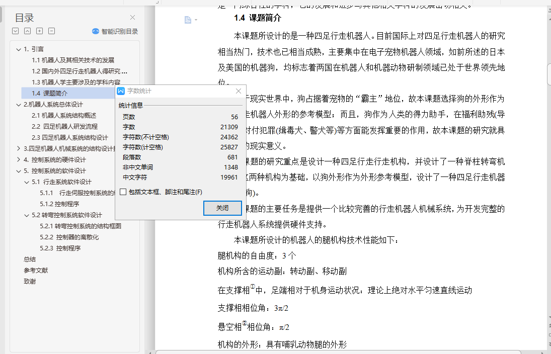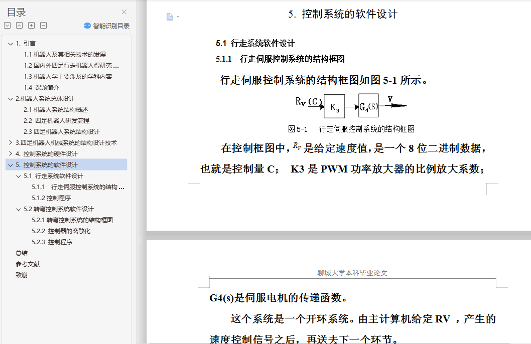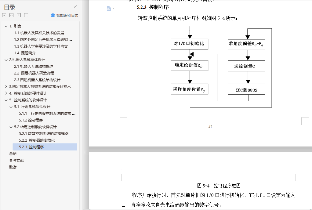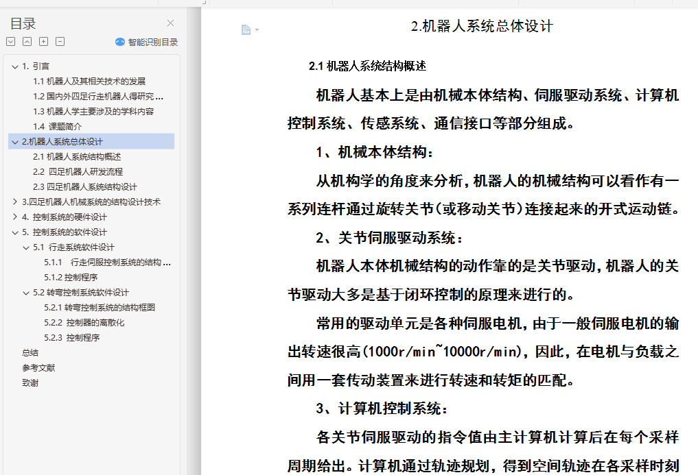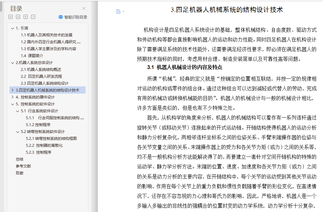 摘 要四足机器人作为仿生机器人的一种,得到了广泛的研究。行走机构和转弯机构是四足机器人最关键的部分,目前,行走机构的研究大多采用在腿机构的关节处安装伺服电机进行驱动,增加了机器人的重量和控制策略的难度。并且,机器人本体大多是一个刚性整体,转弯机构研究不足。为此,项目将四足机器人本体作为一个柔性整体,采用三维建模软件Pro/E4.0设计了四足机器人的机械系统,提出了一种新颖的凸轮控制驱动式行走机构,设计了一种腿机构以及相应的凸轮控制驱动机构,并初步设计了柔性转弯机构。在此基础上,论文采用主从式控制方式设计了四足机器人的控制系统,重点讨论了以8051单片机为控制器的行走机构和转向机构的控制系统设计。关键词:四足机器人;行走机构;凸轮驱动;控制系统;三维设计AbstractQuadruped robot as one of biomimetic robots, has been extensively studied. Travel agencies and institutions is a quadruped robot turning the key, At the present, servo motor is installed in the leg joints of the most travel agencies, increasing the weight of the robot and the difficulty of the control system strategy . And most of the robot is a rigid body as a whole, and the research of the turning institutions is not fully studied . For this purpose, the project will take four-legged robot whole body as a flexible rigid body, and three-dimensional modeling software Pro/E4.0 is used for designing quadruped robot mechanical systems, a new travel agency based on cam control drive is proposed , a kind of leg mechanism and control of the corresponding cam drive mechanism is designed, and a flexible turning institution is preliminary designed. Based on this work, the control system of the robot was designed. Especially, control systems of the stepped mechanism and the wheel mechanism were analyzed detailed.Key words: quadruped robot; stepped mechanism; cam drive; control system ;three dimensional design;目 录1.引言 11.1机器人及其相关技术的发展 11.2国内外四足行走机器人得研究概况 21.3机器人学主要涉及的学科内容 41.4 课题简介 52.机器人系统总体设计 62.1机器人系统结构概述 62.2 四足机器人研发流程 72.3四足机器人系统结构设计 93.四足机器人机械系统的结构设计技术 103.1 机器人机械设计的内容及特点 103.2 机械结构总体设计 113.3行走机构的研究 133.4 行走机构的设计计算 193.5 转弯机构的设计 243.6 腱机构 283.7 机器人的外形设计 283.8 驱动系统的设计 294.控制系统的硬件设计 354.1传感器 354.2 控制器 364.3控制系统 395.控制系统的软件设计 425.1 行走系统软件设计 425.2转弯控制系统软件设计 43总结 47参考文献 49致谢 51