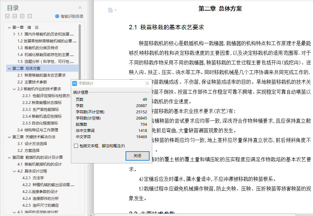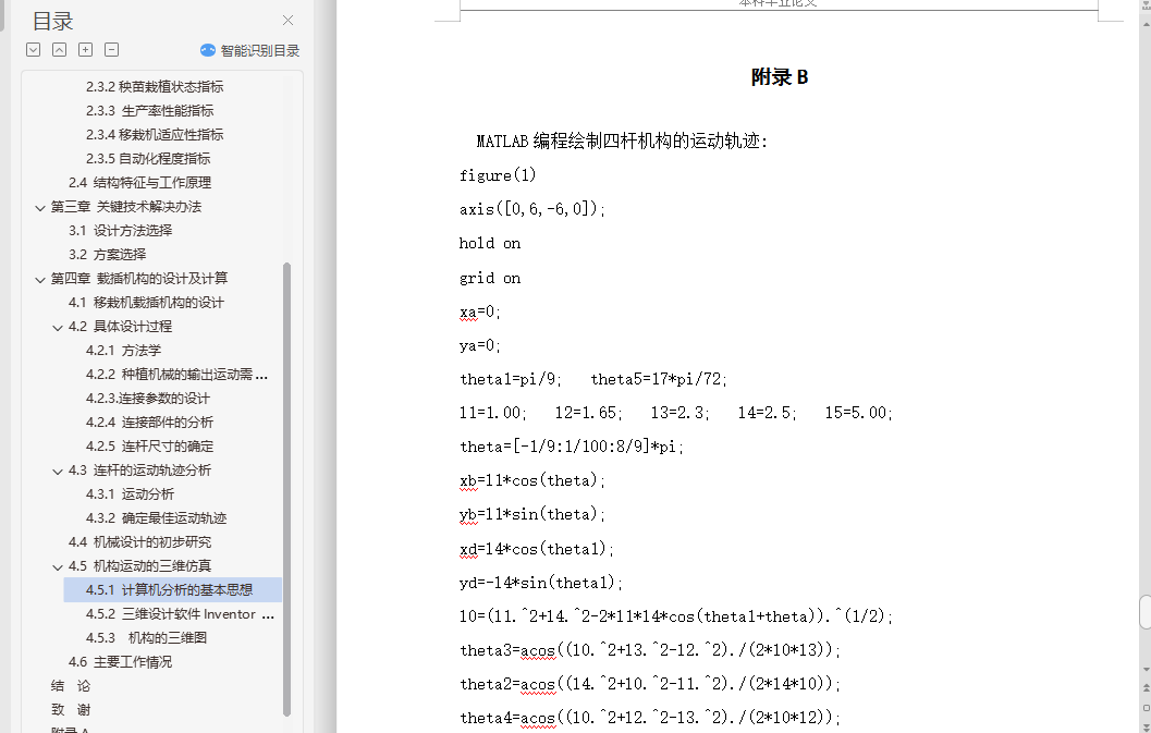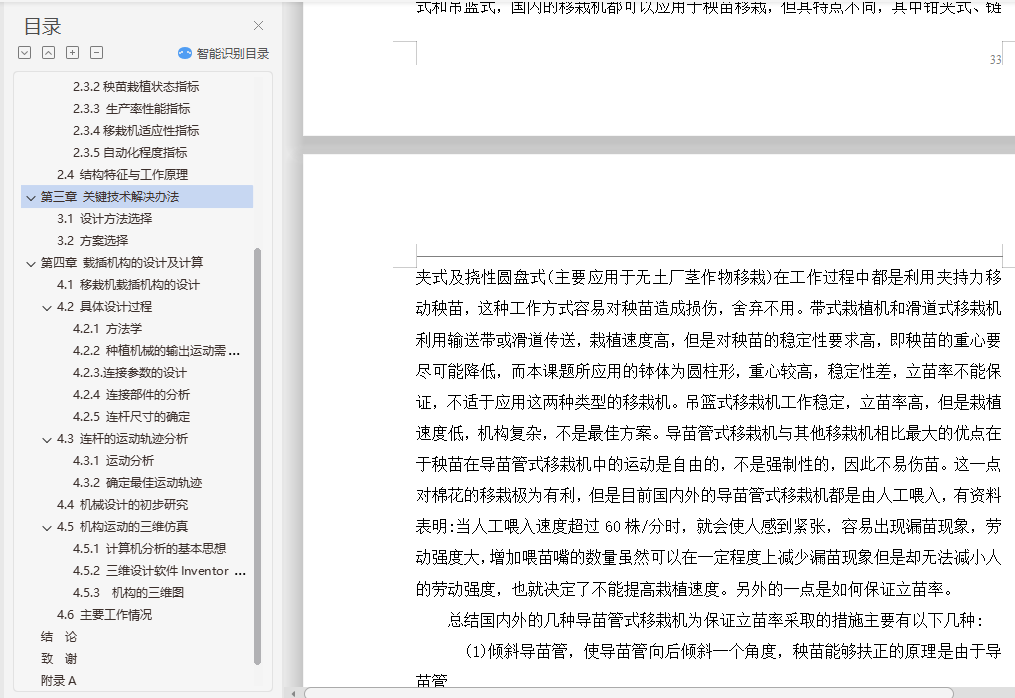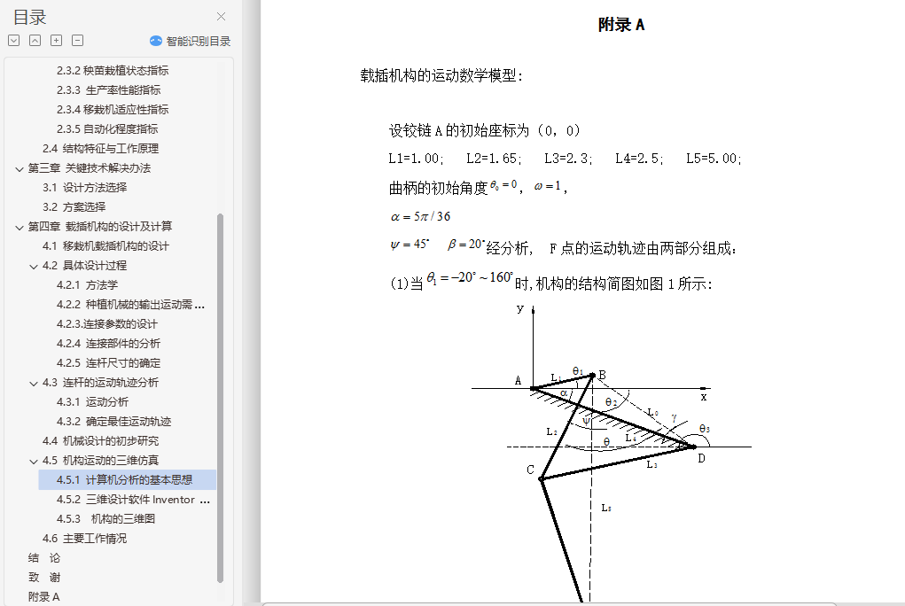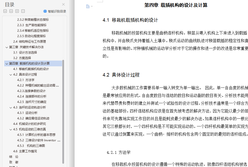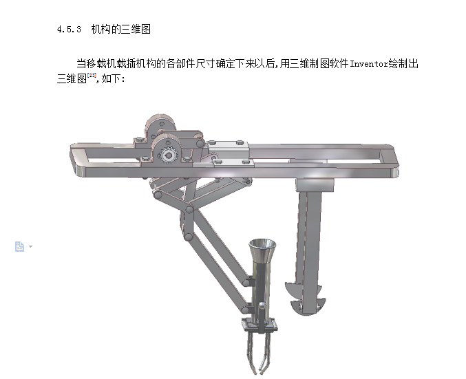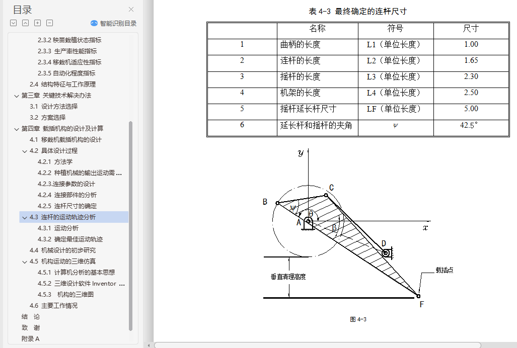 摘要 本文主要讨论的是一种秧苗移栽机的载插机构,该移栽机主要应用于烟苗、玉米、甜菜、茄子、蕃茄、棉花等作物的田间移栽作业。根据作物育苗移栽的农艺要求,在分析了国内外众多移栽机的基础上,优化设计了适合秧苗移栽的机械的关键部件,分析研究了机械栽苗的一般规律,找出了影响栽苗效果的若干因素,确定了工作部件的主要参数。该机构的创新点是采用了曲柄连杆机构作为移栽机的投苗机构。由于条件限制,实践方面有待进一步的加强,进行进一步的检验、分析、再设计,使所设计的烟苗移栽机械达到较好的工作性能指标和工作可靠性的要求,但最为重要的是一定要满足农业生产的要求―农艺要求。移栽部件的运动分析是移栽机设计的基础,在建立秧苗运动数学模型的前提下,运用Inventor建立实体模型,创建组件连接,在Inventor中对移栽部件进行模拟仿真,并对其关键点与建立的数学模型进行比较,对移栽部件参数进行优化。关键词: 移栽机; 曲柄连杆机构; 投苗机构.Abstract This paper mainly discusses the transplanting mechanism of a seedling transplanter, which is mainly applied to the field transplanting of tobacco seedlings, corn, sugar beet, eggplant, tomato, cotton and other crops. According to the agronomic requirements of seedling raising and transplanting of crops, based on the analysis of many transplanters at home and abroad, the key components of the machinery suitable for seedling transplanting are optimally designed, the general rules of mechanical seedling planting are analyzed and studied, several factors affecting the seedling planting effect are found out, and the main parameters of the working components are determined.The innovation of this mechanism is that crank-link mechanism is adopted as the seedling throwing mechanism of transplanter. Due to the limited conditions, the practice needs to be further strengthened, further inspection, analysis and redesign are carried out, so that the designed tobacco seedling transplanting machine can meet the requirements of better working performance index and working reliability, but the most important thing is that it must meet the requirements of agricultural production-agronomic requirements.Kinematic analysis of transplanting parts is the basis of transplanting machine design. On the premise of establishing mathematical model of seedling motion, Inventor is used to establish solid model, create component connection, simulate transplanting parts in Inventor, compare its key points with the established mathematical model, and optimize the parameters of transplanting parts.Key words: transplanter; Crank and connecting rod mechanism; Seedling throwing mechanism.目 录第一章 绪论…………………………………………………………………31.1 国内外移栽机的历史和发展状况……………………………………………31.1.1国外移栽机的发展状况……………………………………………………31.1.2国内移栽机械的发展概况…………………………………………………41.1.3国内移栽机械的主要问题…………………………………………………41.2发展旱地秧苗移栽机械的必要性……………………………………………51.3 移栽机的分类及特点…………………………………………………………71.4 机械化移栽目前存在的主要问题…………………………………………101.5 选题分析(科学性、可行性论证)和内容……………………………………11第二章 总体方案…………………………………………………………132.1 秧苗移栽的基本农艺要求…………………………………………………132.2 主要技术参数………………………………………………………………132.3 移栽机作业的技术要求……………………………………………………142.3.1 性能评定指标与检测方法………………………………………………142.3.2 秧苗栽植状态指标………………………………………………………162.3.3 生产率性能指标…………………………………………………………182.3.4 移栽机适应性指标………………………………………………………182.3.5 自动化程度指标…………………………………………………………192.4 结构特征与工作原理………………………………………………………19第三章 关键技术解决办法………………………………………………233.1 设计方法选择………………………………………………………………233.2 方案选择……………………………………………………………………24第四章 载插机构的设计及计算…………………………………………254.1 移栽机载插机构的设计……………………………………………………254.2 具体设计过程………………………………………………………………254.2.1 方法学……………………………………………………………………254.2.2 种植机械的输出运动需求………………………………………………264.2.3 连接参数的设计…………………………………………………………264.2.4 连接部件的分析…………………………………………………………274.2.5 连杆尺寸的确定…………………………………………………………294.3 连杆的运动轨迹分析………………………………………………………314.3.1 运动分析…………………………………………………………………314.3.2 确定最佳运动轨迹………………………………………………………324.4 机械