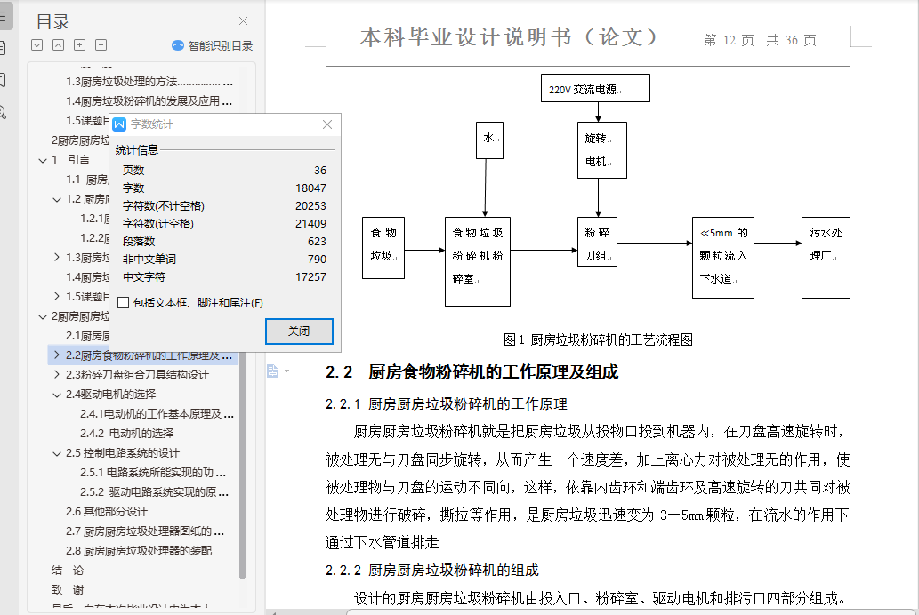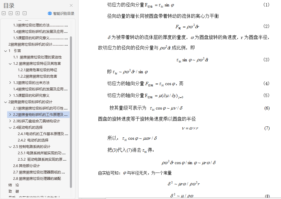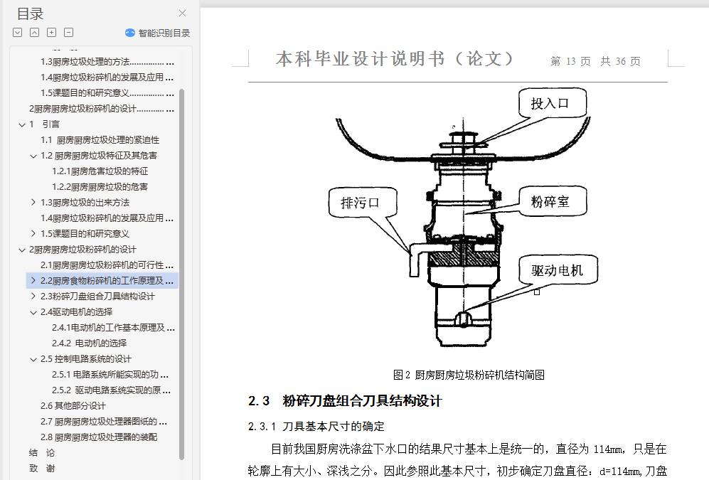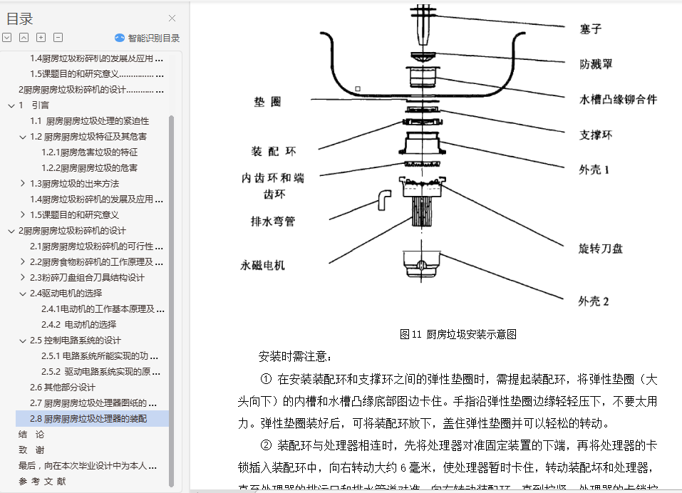 目次1.绪论……………………………………………………………………………… 11.1厨房食物垃圾粉碎机的紧迫性…………………………………………………11.2厨房食物垃圾特征及其危害……………………………………………………21.3食物垃圾处理的方法……………………………………………………………31.3.1作牲畜饲料……………………………………………………………………51.4食物垃圾粉碎机的发展及应用现状……………………………………………51.5课题目的和研究意义……………………………………………………………62厨房食物垃圾粉碎机的设计……………………………………………………82.1厨房食物垃圾粉碎机的可行性分析……………………………………………82.2厨房食物垃圾粉碎机的工作原理及组成……………………………………92.3粉碎刀盘组合刀具结构设计…………………………………………………102.4驱动电机的选择………………………………………………………………172.5 控制电路系统的设计…………………………………………………………232.6 其它部分设计…………………………………………………………………252.7厨房食物垃圾粉碎机图纸的绘制……………………………………………262.8 厨房食物垃圾处理器的装配…………………………………………………27结论…………………………………………………………………………………29致谢…………………………………………………………………………………32参考文献……………………………………………………………………………33附录…………………………………………………………………………………34