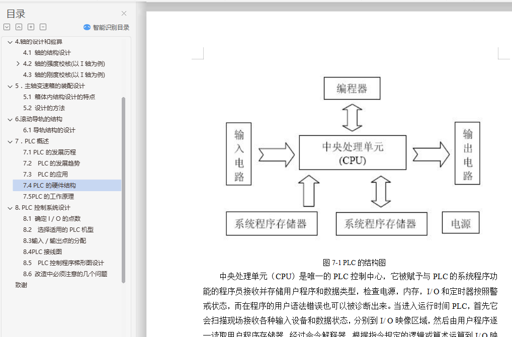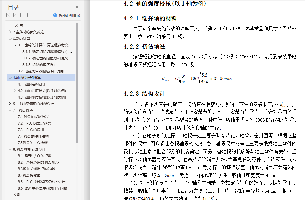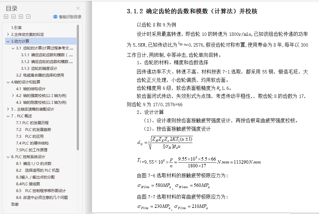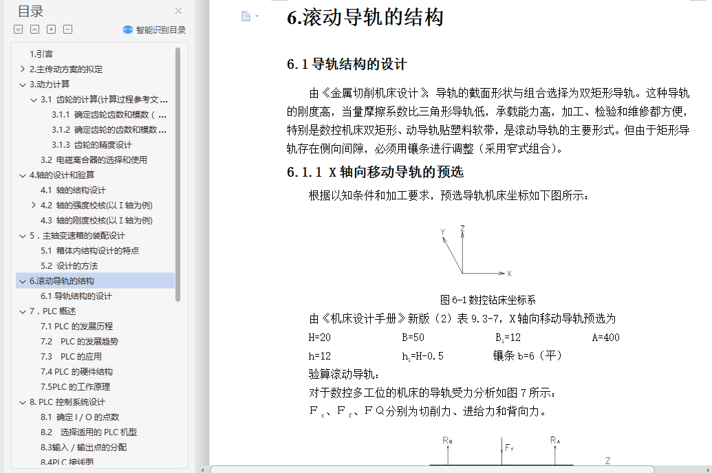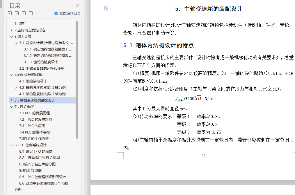 摘要本文研究的主要是数控机床的机械传动装置的设计,传动装置在各外界因素和自身因素的影响下传动精度会大大降低,例如几何精度与变形产生的误差、机床的热变形以及运动间的摩擦和传动间隙等因素。这些都是影响数控机床传动精度的重要因素,我也是从这入手,从各个方面着手提高数控机床的传动精度。我完成的设计主要包括一些原始数据的拟定,再根据拟定的参数,进行传动方案的比较,确定传动方案。然后计算各传动副的传动比及齿轮齿数,再估算齿轮的模数和各轴的轴径,并对齿轮和轴的强度、刚度进行校核。除此之外,还要对箱体内的主要结构进行设计,一些零件的选型,从而完成对整个机械传动系统的设计。关键词:数控机床 传动系统 精度 设计AbstractOf this study is the design of the transmission tools of CNC machine , mechanical transmission gear under the influence of external factors and the factors driving accuracy will greatly reduce the Accuracy, such as geometric accuracy and deformation of the thermal deformation of machine tools, as well as the movement between the friction and the transmission gap. These are the transmission accuracy of CNC machine tools, I am also from this start begin to improve the transmission accuracy of CNC machine tools, from all aspects.I completed the design include the formulation of some of the raw data, according to the parameters of the proposed transmission scheme compared to determine the transmission scheme. Then calculate the transmission ratio of the pair and gear of the transmission, and then estimate the modulus of the gear and the axis of the shaft, and gear and shaft strength and stiffness of the check. In addition, we must design the main structure of cabinets, some parts of the selection, thus completing the design of the mechanical drive system as a whole.Keywords: accuracy of CNC machine tool drive system designKeywords:NC machine tool; driving system; Accuracy;design目录1.引言...........................................................................42.主传动方案的拟定 102.1 初定传动方案 102.2 方案的选择 113.动力计算 173.1 齿轮的计算(计算过程参考文献2 第八章) 173.2 电磁离合器的选择和使用 264.轴的设计和验算 284.1 轴的结构设计 284.2 轴的强度校核(以Ⅰ轴为例) 294.3 轴的刚度校核(以Ⅰ轴为例) 325.主轴变速箱的装配设计 345.1 箱体内结构设计的特点 355.2 设计的方法 356.滚动导轨的结构 376.1导轨结构的设计 377.PLC概述 437.1 PLC的发展历程 437.2 PLC的发展趋势 457.3 PLC的应用 467.4 PLC的硬件结构 477.5 PLC的工作原理 488. PLC控制系统设计 498.1 确定I/O的点数 498.2 选择适用的PLC机型 508.3 输入/输出点的分配 508.4 PLC接线图 508.5 PLC控制程序梯形图设计 508.6 改造中必须注意的几个问题 51致谢 5353参考文献 54附件清单 55