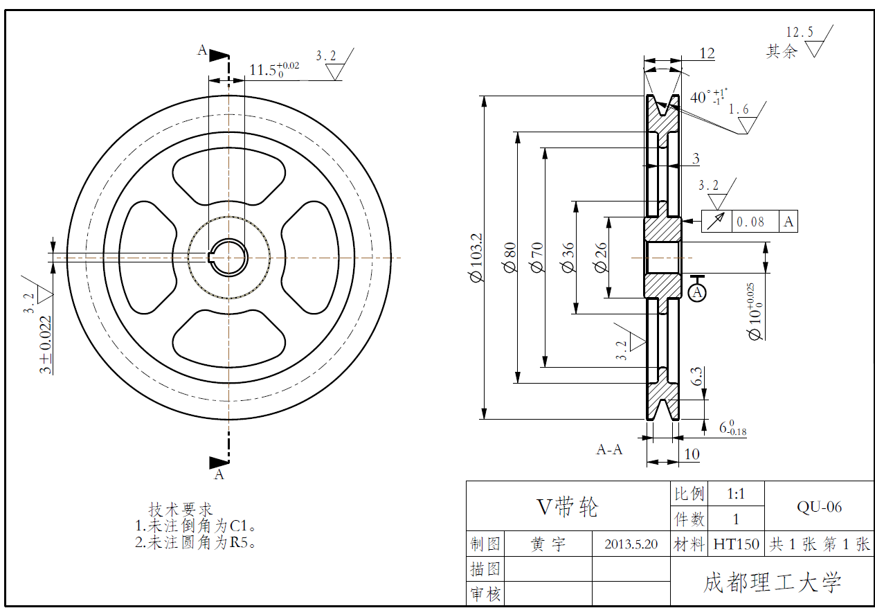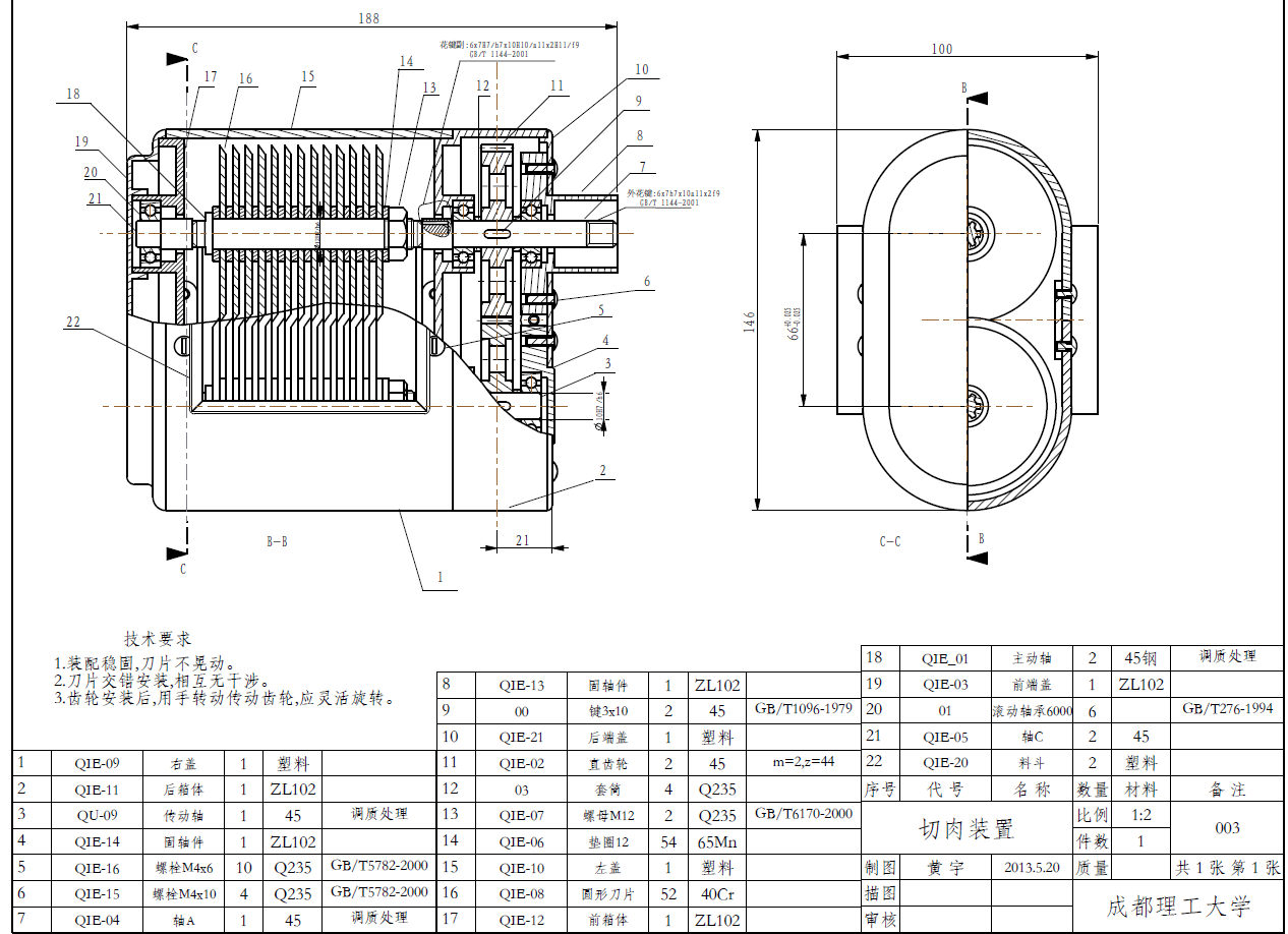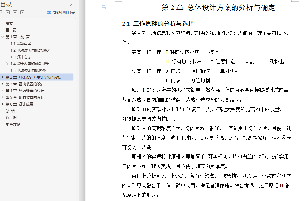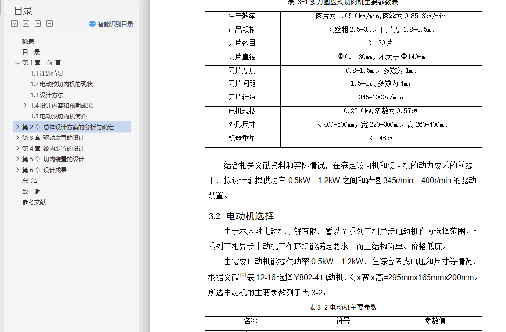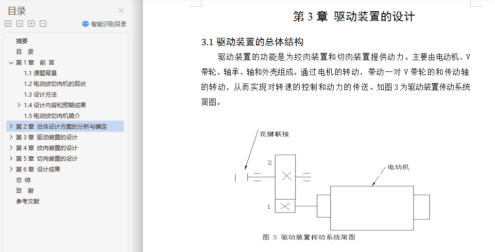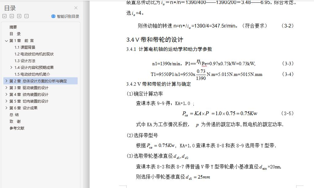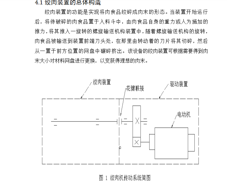 摘要为了解决现市场上电动绞切肉机价格贵、体积大,不能广泛适用于普通家庭等问题,本设计论述了一种高效、便捷的小型电动绞切肉机,主要具有绞肉和切肉(肉片、肉丝)两种功能普通家庭。其主要由驱动装置、切肉装置、绞肉装置,三大部分组成。本设计通过对现有绞肉机和切肉机的结构进行小型化和改进,将绞肉功能和切肉功能有效结合。论文详细论述了该电动绞切肉机的功能设计、结构设计、运动和受力分析、材料选用和校核等,并利用PRO/E三维设计软件对零件建模,完成电动绞切肉机的三维造型和运动仿真,操作简单,适用于广大普通家庭。本设计功能全面、设计人性化、系统稳定,有效的节约了人力,并且设备安全可靠度高,为家庭日常生活带来了大大的便利。关键词: 绞肉装置; 切肉装置; 驱动装置; 三维造型; 运动仿真The Design and Motion Simulation of the small Electric Meat Grinder Based on the PRO/EAbstract: In order to solve the problem of electric meat cutter machine now on the market, the price is expensive, bulky, and not widely used in ordinary families, the design discussed in an efficient and convenient small electric auger Meat Slicer, Meat choppers and grinders (meat, pork) two functions, simple operation, suitable for ordinary families. Its main by Meat device, meat device and drive device, composed of three parts. This design for miniaturization and improved the structure of the the existing meat grinder meat slicer, meat grinder features and cutting function effectively combine. The paper discusses in detail the electric auger meat slicer functional design, structural design, exercise and stress analysis, material selection and check and PRO / E 3D design software for part modeling, complete electric auger meat slicer three-dimensional modeling and motion simulation. The design full-featured, user-friendly design, the system is stable, effective manpower savings, high reliability and safety of equipment, greatly facilitate the family's daily life.Key words: Meat device; Cutting device; Drive device; Three-dimensional modeling ; Motion Simulation目 录摘要Abstract第1章 前 言 11.1课题背景 11.2电动绞切肉机的现状 11.3设计方法 21.4设计内容和预期成果 31.4.1 基本任务与要求 31.4.2 拟解决问题 31.4.3预期成果 31.5电动绞切肉机简介 3第2章 总体设计方案的分析与确定 52.1 工作原理的分析与选择 52.2 总体方案的确定与概述 5第3章 驱动装置的设计 83.1驱动装置的总体结构 83.2 电动机选择 103.3确定驱动装置的传动比 113.4 V带和带轮的设计 113.4.1 计算电机轴的运动学和动力学参数 113.4.2 V带和带轮的计算与确定 11第4章 绞肉装置的设计 144.1绞肉装置的总体构造 144.2 螺旋推进器的设计 164.2.1螺旋推进器简介 164.2.2螺旋推进器的分析与说明 164.2.3螺旋推进器的详细设计 174.3绞刀的设计 174.3.1绞刀简介 174.3.2绞刀的结构设计与说明 184.4出料网盘的设计 19第5章 切肉装置的设计 205.1切肉装置的总体结构 205.2轴系零件总述 225.3圆盘刀的设计 235.3直齿轮的设计 235.6主动轴和从动轴的设计 255.7传动轴I的设计与校核 265.7.1传动轴I的结构设计 265.7.2校核该轴 275.7.3 精确校核轴的疲劳强度 28第6章 设计成果 316.1产品规格 316.2创新点与投资效益分析 316.2.1产品特点及创新点 316.2.2产品市场与投资效益 31总 结 32致 谢 33参考文献 34