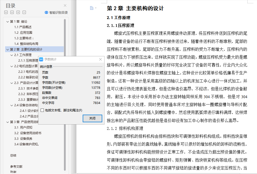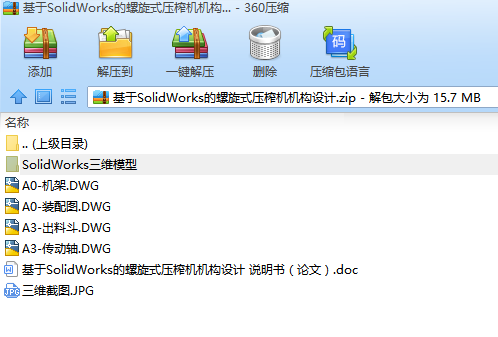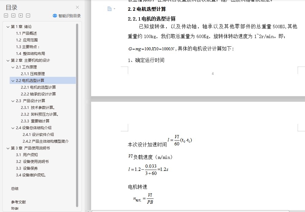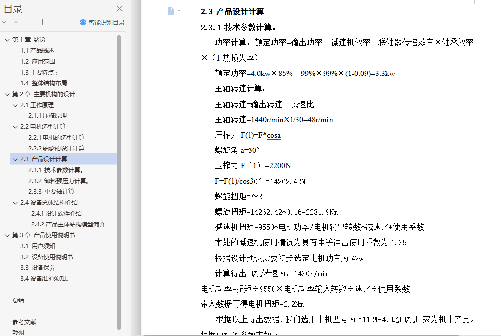 目录第1章 绪论 11.1产品概述 11.2 应用范围 11.3主要特点: 51.4 整体结构布局 7第2章 主要机构的设计 92.1工作原理 112.1.1压榨原理 132.2电机选型计算 152.2.1电机的选型计算 162.2.2轴承的设计计算 162.3 产品设计计算 162.3.1 技术参数计算 172.3.2 卸料预压力计算 172.3.3 重要轴计算 172.4设备总体结构介绍 182.4.1设计软件介绍 182.4.2产品主体结构模型简介 18第3章 产品使用说明书 193.1 用户须知 203.2 设备使用说明书 213.3 设备保养 223.4设备维护须知。 24第4章 总结 25参考文献: 26致谢 27摘要本设计是针对螺旋式压榨机的设计,主要概述了螺旋压榨机的主体构造,对螺旋式压榨机的上料、排渣、传动等机构进行了较为详细的设计。整个设计过程中从电机选择到传动机构标准件选择都经过详细计算设计,通过计算较为准确的对电机进行确定选型,对结构尺寸进行了更为细致的验证。并且通过研究对市场原有的螺旋压榨机进行了简单的改进使得设备更加适于人们的使用,更加简单方便。本设计包括对产品零部件材料的选择,对标准件可靠性的选择,以及设备使用寿命的计算和对设备维护保养的时间计算,并简单的制作了操作手册。关键词:螺旋式压榨机;螺旋压榨;主体构造AbstractThis design is for the spiral press design. It mainly introduces the screw press main body structure, in a spiral pressing machine material, slag, transmission and other institutions for the detailed design. The whole design process from the motor selection to choose the standard transmission parts are after a detailed calculation of the design, by calculating accurately the motor determined the selection, the size of structure were more careful verification. And through the research on the market of the original screw press made a simple improvement makes the device more suitable for people to use, more simple and convenient. This design includes the choice of product parts and components, the choice of the reliability of the standard parts, as well as the equipment service life calculation and the time of maintenance of equipment maintenance, and simple production of the operation manual.Keywords: Screw press; screw press; main body structure