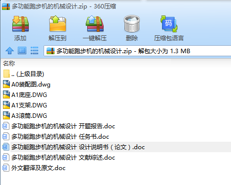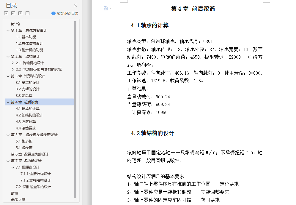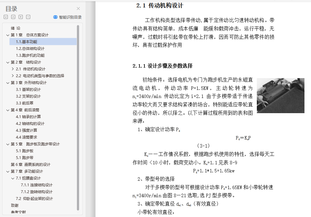 The design of the main research contents include the overall functional design, transmission design, shape design, front and rear drum design. According to the research content of each part can be divided into: the overall functional design ( has been determined experimentally human body structure and movement characteristics, and according to their exercise given the care needs ) including basic function, structure design and functional principle of determination; transmission mechanism design includes motor type, power selection and technical parameters, transmission mechanism design and parameter selection multi wedge belt pulley, the structure and size selection and belt tensioning device selection; shape structural design includes a frame design and stent design; before and after the drum design includes bearing calculation, shaft strength calculation and design requirements and drum. At the same time also includes the running plate and a running belt design, use and maintenance.