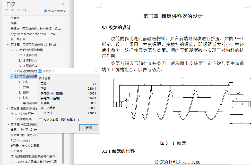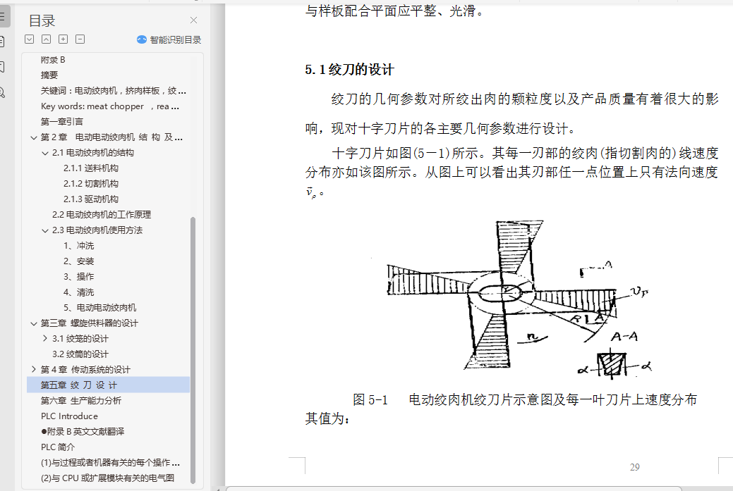 目 录中文摘要Abstract第一章 引言第二章 电动绞肉机结构及工作原理2.1电动绞肉机的结构2.1.1送料机构2.1.2切割机构2.1.3驱动机构2.2电动绞肉机的工作原理2.3 电动绞肉机的使用方法第三章 螺旋供料器的设计3.1绞笼的设计3.1.1绞笼的材料3.1.2螺旋直径3.1.3螺旋供料器的转速3.1.4螺旋节距3.2绞筒的设计第四章 传动系统的设计4.1电机的选择4.2带传动的设计4.2.1设计功率4.2.2 选定带型4.2.3 传动比4.2.4 小带轮基准直径4.2.5 大带轮基准直径4.2.6 带速验算4.2.7 初定轴间距4.2.8 所需带的基准长度4.2.9 实际轴间距4.2.10 小带轮包角4.2.11单根V带的基本额定功率4.2.12 时单根V带型额定功率增量4.2.13 V带的根数4.2.14 单根V带的预紧力4.2.15作用在轴上的力4.2.16带轮的结构和尺寸4.3齿轮传动设计4.3.1选择材料,确定和及精度等级4.3.2按接触强度进行初步设计4.3.2.1确定中心距4.3.2.2 确定模数4.3.2.3确定齿数4.3.2.4计算主要的几何尺寸4.3.3校核齿面接触强度4.3.4校核齿根的强度4.3.5齿轮及齿轮副精度的检验项目计算4.3.5.1确定齿厚偏差代号4.3.5.2确定齿轮的三个公差组的检验项目及公差值4.3.5.3确定齿轮副的检验项目与公差值4.3.5.4 确定齿坯的精度4.4轴的设计4.4.1按扭转强度计算18第五章 绞刀的设计5.1绞刀的设计5.1.1刀刃的起讫位置15.1.2刀刃的前角5.1.3刀刃的后角5.1.4刀刃的刃倾角5.1.5刀刃上任一点位量上绞肉速度5.1.6绞刀片的结构第六章 生产能力分析6.1绞刀的切割能力6.2 电动绞肉机的生产能力6.3功率消耗设计总结参考文献致谢…附录A附录B