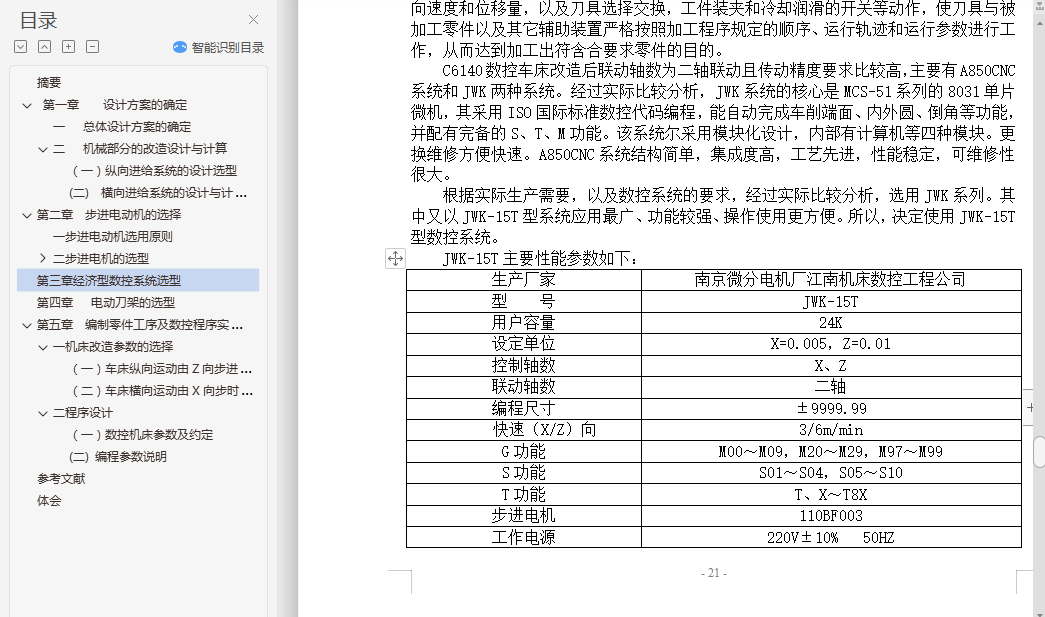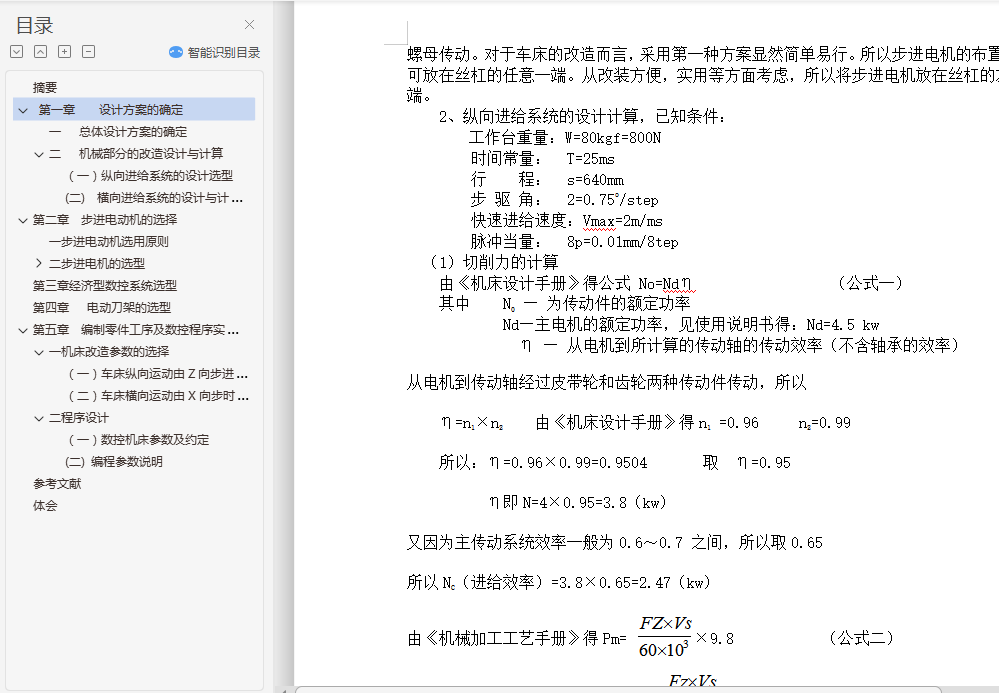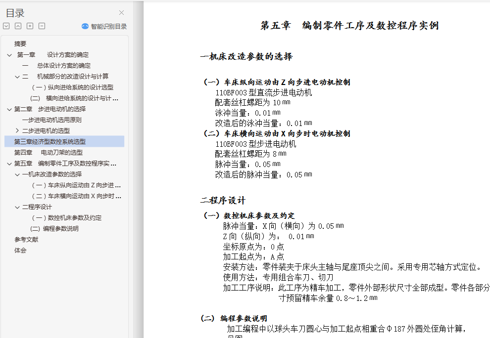 目录0摘要…………………………………………-3-1引言……………………………………….-6-第一章 设计方案的确定 - 9 -一 总体设计方案的确定 - 9 -二 机械部分的改造设计与计算 - 10 -(一)纵向进给系统的设计选型 - 10 -(二) 横向进给系统的设计与计算 - 15 -第二章 步进电动机的选择 - 19 -一步进电动机选用原则 - 19 -二步进电机的选型 - 20 -(一)C6140纵向进给系流步进电机的确定 - 20 -(二)C6140横向进给系流步进电机的确定 - 20 -(三)110BF003型直流步进电机主要技术参数 - 20 -(四)110BF004型直流步进电机主要技术参数 - 21 -第三章经济型数控系统选型 - 21 -第四章 电动刀架的选型 - 22 -第五章 编制零件工序及数控程序实例 - 23 -一机床改造参数的选择 - 23 -(一)车床纵向运动由Z向步进电动机控制 - 23 -(二)车床横向运动由X向步时电动机控制 - 23 -二程序设计 - 23 -(一)数控机床参数及约定 - 23 -(二) 编程参数说明 - 23 -参考文献 - 27 -体会 - 28 -摘要1947年,Parsons公司的John Parsons着手进行一项实验,他想用空间数据控制机床加工飞机零件。1949年,Parsons公司与美国空军签定了制造第一台数控机床的合同。1951年, 美国麻省理工学院承担了这一项目。1952年,麻省理工学院(MIT)使用实验室制造的控制器和辛辛那提立式主轴展示三轴联动获得成功,这标志着数控时代的到来。到了1955年,几经改进之后,数空技术开始应用于生产。早期的NC机床能运行穿孔卡和穿孔带,两者中以穿孔带更为通用。但是,鉴于更换、编辑纸带费时费力,后来便采用计算机作为编程的辅助工具。计算机在数控中的应用有两种形式:一是计算机辅助编程语言,二是实施直接数字控制(DNC),有了计算机辅助编程语言,程序员可用一套通用“混杂英语”命令编写NC程序,然后由计算机将其释译为机器码并制成穿孔带。直接数字控制是指用一台计算机对一台或多台数控机床实施部分或整体控制。虽然有些公司运用DNC已获得成功,但是,扩大计算机容量、购买软件、协调DNC系统等花费使这种系统并不适合所有公司,而只适用于一些大公司。最近,一种叫做分布式数字控制的新型DNC系统已经开发出来,它用计算机网络来协调多台DNC机床的运行。这种方式最终有可能用来协调整个工厂的运转。这种分布式数字控制方法解决了协调直接数字控制系统时遇到的一些难题。在此基础上,人们还开发出另一种分布式数字控制系统,其整个NC程序可从主机直接传输到机床控制器。另外,该系统也可在必要时将程序从主机传输到车间的个人电脑(PC),然后再传输到机床控制器工业机器人是在生产环境中用以提高生产效率的工具,它能做常规乏味的装配线工作,或能做那些对于工人来说是危险的工作,例如,第一代工业机器人是用来在核电站中更换核燃料棒,如果人去做这项工作,将会遭受有害放射线的辐射。工业机器人亦能工作在装配线上将小元件装配到一起,如将电子元件安放在电路印制板,这样,工人就能从这项乏味的常规工作中解放出来。机器人也能按程序要求用来拆除炸弹,辅助残疾人,在社会的很多应用场合下履行职能。机器人可以认为是将手臂末端的工具、传感器和(或)手爪移到程序指定位置的一种机器。当机器人到达位置后,它将执行某种任务。除了编程以及系统的开停之外,一般来说这些工作可以在无人干预下完成。关键字:加工精度,设计方案,分配,参数ABSTRACTIn 1947 , John Parsons of the Parsons Corporation, began experimenting with the idea of using three-axis curvature data to control machine tool motion for the production of aircraft components . In 1949 , Parsons was awarded a U. S. Air Force contract to build what was to become the first numerical control machine . In 1951 , the project was assumed by Massachusetts Institute of Technology . In 1952 , numerical control arrived when MIT demonstrated that simultaneous three-axis movements were possible using a laboratory-built controller and a Cincinnati Hydrotel vertical spindle . By 1955 , after further refinements , numerical control became available to industry .Early NC machines ran off punched cards and tape , with tape becoming the more common medium . Due to time and effort required to change or edit tape , computers were later introduced as aids in programming . Computer involvement came in two forms : computer aided programming languages and direct numerical control (DNC) . Computer aided programming language allowed a part programmer to develop an NC program using a set of universal “pidgin English” commands , which the computer then translated into machine codes and punched into the tape . Direct numerical control involved using a computer as a partial or complete controller of one or more numerical control machines . Although some companies have been reasonably successful at implementing DNC , the expense of computer capability and software and problems associated with coordinating a DNC system renders such systems economically unfeasible for all but the largest companies .Recently a new tape of DNC system called distributive numerical control has been developed . It employs a network of computers to coordinate the operation of a number of CNC machines . Ultimately , it may be possible to coordinate an entire factory in this manner . Distributive numerical control solves some of the problems that exist in coordinating a direct numerical control system. There is another type of distributive numerical control that is a spin-off of the system previously explained . In this system , the NC program is transferred in its entirety from a host computer dir