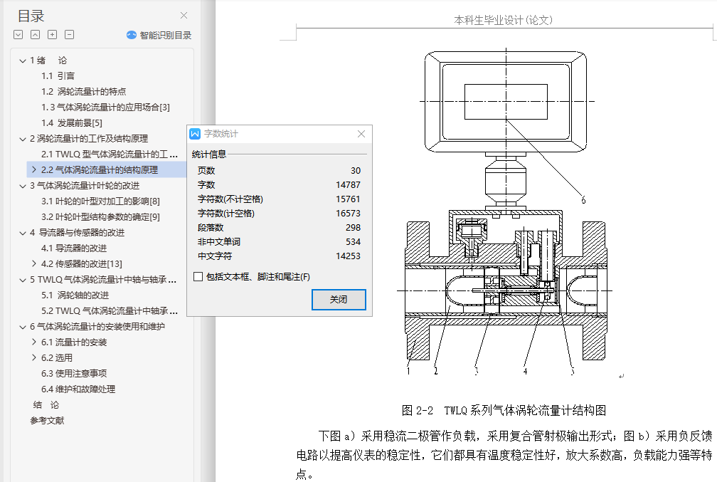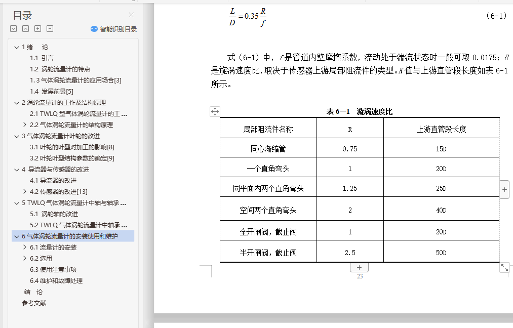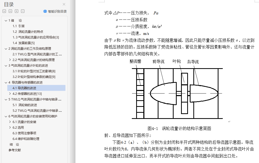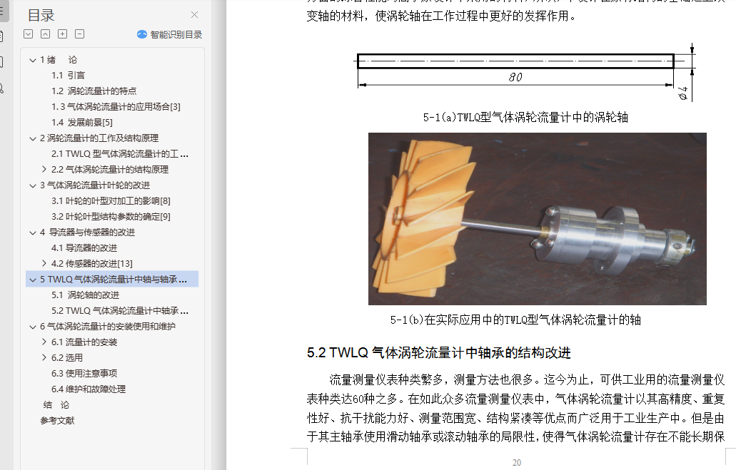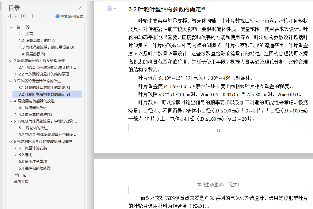 目 录1绪 论 11.1 引言 11.2 涡轮流量计的特点 11.3气体涡轮流量计的应用场合 31.4 发展前景 62涡轮流量计的工作及结构原理 72.1 TWLQ型气体涡轮流量计的工作原理 72.2气体涡轮流量计的结构原理 82.2.1 涡轮流量计的结构原理 82.2.2 涡轮流量传感器的结构 93气体涡轮流量计叶轮的改进 213.1叶轮的叶型对加工的影响 213.2叶轮叶型结构参数的确定 224 导流器与传感器的改进 264.1导流器的改进 264.2传感器的改进 294.2.1 传感器的分类 294.2.2流体密度对传感器的影响 305 TWLQ气体涡轮流量计中轴与轴承的改进 345.1 涡轮轴的改进 345.2 TWLQ气体涡轮流量计中轴承的结构改进 356气体涡轮流量计的安装使用和维护 386.1流量计的安装 386.1.1传感器的安装 386.1.2连接管道的安装 396.2选用 406.2.1传感器的选用 406.2.2流量指示积算仪 416.3使用注意事项 416.4维护和故障处理 42结 论 44参考文献 45