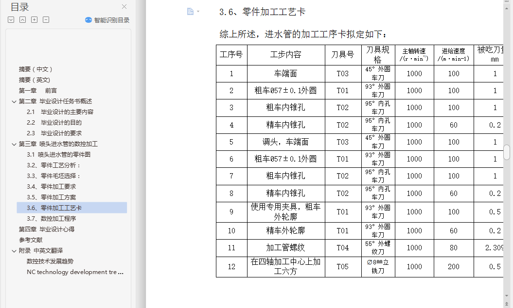 摘要(中文)随着科学技术的发展,自动喷水灭火系统的发展也是越来越快,而自动喷水灭火系统的发展究其实质而言就是喷头的发展。所以此次毕业设计我们主要研究旋转型消防喷头的制造工艺设计与数控加工。大空间旋转喷头是一种应用于大空间领域的新型喷水灭火产品。它是利用水流在喷头内产生的扭力,带动喷头自动旋转,从而把水流均匀分散在保护范围内。它可与大空间智能探测器配合使用,组成大空间智能喷水灭火系统,实现自动灭火功能;也可与其它大空间探测器配合使用,实现灭火功能。大空间旋转喷头各组成零件的加工质量对洒水的范围起着及其关键的作用,尤其是喷头上、下体中曲面的加工。摘要(英文)AbstractWith the development of science and technology, automatic sprinkler system development is more and more quickly, and the development of the automatic sprinkler system of its essence are concerned, is the development of the shower nozzle. So the graduation design we mainly study) fire sprinkler head spin manufacturing process design and numerical control processing.Large space rotating nozzle is a kind of applied to large space new sprinkler products. It is to use the water within the shower nozzle of torque, drive automatically rotating nozzle, and take the water equably dispersed in the protection range. It can and large space probe used together with intelligent, large space of intelligent sprinkler system, realize the automatic fire extinguishing function; Also with other large space detector cooperates to use, realize the fire fighting function. Large space rotating nozzle each composition parts processing quality to the scope of the water plays and key role, especially in the shower nozzle surface processing, nakedness.KEY WORDS : Fire extinguishing , sprayer , numerical control , machining目录摘要(中文) - 1 -摘要(英文) - 1 -第一章 前言 - 2 -第二章 毕业设计任务书概述 - 3 -2.1 毕业设计的主要内容 - 3 -2.2 毕业设计的目的 - 5 -2.3 毕业设计的要求 - 5 -第三章 喷头进水管的数控加工 - 6 -3.1 喷头进水管的零件图 - 6 -3.2、零件工艺分析: - 7 -3.3、零件毛坯选择: - 7 -3.4、零件加工要求 - 8 -3.5、零件加工方案 - 8 -3.6、零件加工工艺卡 - 14 -3.7、数控加工程序 - 15 -第四章 毕业设计心得 - 19 -参考文献 - 21 -附录 中英文翻译 - 22 -数控技术发展趋势 - 22 -NC technology development trends - 26 -