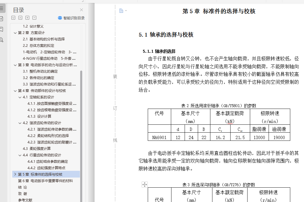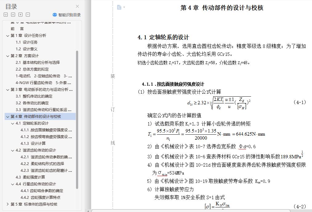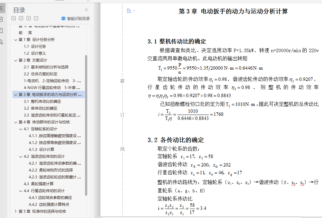 电动扳手设计[摘要] 在大型钢结构建筑中,广泛使用高强度螺栓链接。这种螺栓连接,在施工中要求用规定的拧紧力矩锁紧螺母,以保证链接的可靠性。由于高强度螺栓的材料和热处理是严格控制和检查的,因此螺栓定力矩切口处的扭剪断裂力矩能够控制在一个比较准确的范围,从而能保证螺栓连接的可靠性。当拧紧力矩过大时,不能保证螺栓的强度;当拧紧力矩过小时,又不能保证连接的可靠性。因此这种螺栓连接,在施工中要求用规定的拧紧力矩锁紧螺母,以保证链接的可靠性。另外,高强度螺栓往往成批使用,并且工作的环境也比较坚苦,如果是用普通扳手进行定力矩拧紧,工人拧紧螺母的过程中会有很多不便,工作效率也会很低。综合以上三点原因,在拧紧高强度螺栓时,我们采用电动扳手代替手从扳手进行拧紧。电动扳手以220V交流电源为动力进行工作,可以保证每个螺栓的拧紧力都在规定的范围内,同时,采用电动扳手代替手动扳手可以大大提高螺栓拧紧的速度,提高工人的工作效率,改善工人的劳动强度[关键词] 电动扳手 谐波传动 柔轮Electric Wrench Design[Abstract] In large steel structures, widely used in high strength bolts links. This bolt connection, in accordance with requirements of the construction of torque lock nut and to guarantee the reliability of the link.Due to the high strength bolts of material and heat treatment is strict inspection and control, thus shall the bolt torque incision torshear fracture in a moment can control the accuracy and can guarantee, the reliability of the bolt connection. When large torque, cannot guarantee the strength bolt, When the torque, and after hours cannot guarantee the reliability of the connection. Therefore the bolt connection, in accordance with requirements of the construction of torque lock nut and to guarantee the reliability of the link. Additionally, high strength bolts, and often used to working environment is hard, and if it's used for torque wrench on ordinary workers, tighten lock nut process will have a lot of inconvenience, the working efficiency is also very low. Three reasons, in comprehensive above tighten high strength bolts, we adopt electromotive spanner from wrench to replace hand tighten.Electromotive spanner to ac power for power on 220V work, can guarantee each bolt tightened force within a prescribed scope, at the same time, using electric wrench instead of manual wrench screw bolts can greatly improve the speed, improve work efficiency, improve the worker labor intensity[Key words] Electric wrench Harmonic Drive Flexspline目 录前 言 ……………………………………………………………………………1第 1 章 设计任务分析 ……………………………………………………………21.1 设计任务 …………………………………………………………………21.2 设计意义 …………………………………………………………………2第 2 章 方案设计 …………………………………………………………………32.1 基本结构的分析与选择 …………………………………………………32.2 总体方案的拟定 …………………………………………………………5第 3 章 电动扳手的动力与运动分析计算 ………………………………………83.1 整机传动比的确定 ………………………………………………………83.2 各传动比的确定 …………………………………………………………83.3 谐波齿轮传动和行星轮系运动分析 ……………………………………9第 4 章 传动部件的设计与校核…………………………………………………114.1 定轴轮系的设计…………………………………………………………114.1.1 .按齿面接触疲劳强度设计 ……………………………………114.1.2 按齿根弯曲疲劳强度设计………………………………………124.1.3 设计计算…………………………………………………………134.2 谐波齿轮传动的设计……………………………………………………144.2.1 谐波齿轮传动参数的确定………………………………………144.2.2 柔轮结构形式的选择……………………………………………154.2.3 谐波齿轮轮齿的耐磨计算………………………………………154.3 柔轮强度计算……………………………………………………………164.4 行星齿轮传动的设计……………………………………………………174.4.1 齿轮啮合参数的确定……………………………………………174.4.2 齿轮强度计算特点 ……………………………………………17第 5 章 标准件的选择与校核……………………………………………………215.1 轴承的选择与校核………………………………………………………215.1.1 轴承的选择………………………………………………………215.1.2 轴承的校核………………………………………………………225.1.3 轴承的润滑方式…………………………………………………225.2 键的选择与校核…………………………………………………………225.2.1 键的选择…………………………………………………………225.2.2 键的校核…………………………………………………………225.3 圆柱螺旋压缩弹簧的设计………………………………………………23第 6 章 电动扳手中重要零件的材料……………………………………………27结 论 ………………………………………………………………………………29致 谢 ………………………………………………