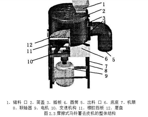 摘要:马铃薯去皮是所有马铃薯制品加工工艺过程的重要环节,目前存在的各种去皮方法都各自有其一定的局限性。随着马铃薯产业的发展和我国社会经济的进步,如 何寻找一种优质、高效、节能几环保的马铃薯剥皮方法己成为马铃薯加工工艺过程 中迫切需要解决的问题。本文主要介绍了以摩擦原理为基础的、适合食品加工工厂等场所使用的小型马铃薯去皮机的设计要点、工作原理和设备组成。一 本题来源及研究的目的和意义1.1 研究的目的目前,世界79%的国家种植马铃薯,总面积2000万千米左右,总产量3亿多吨,仅在小麦、玉米、水稻之后,居第四位。马铃薯在我国布极为广泛,主要产区集中在四川、黑龙江、甘肃、内蒙、河北、山西、陕西、云南、贵州、等省。1.2 研究的意义马铃薯属于茄科、块茎类作物,是珍贵的食物,它既是粮又是菜,营养丰富。其淀粉含量达11 %--25,且蛋白质营养价值很高,容易消化吸收。其中含有18种氨基酸、多种维生素及丰富的矿物质元素。属于低热量、高蛋白、多种维生素和矿物质食品。马铃薯的蛋白质主要是球蛋白,其生物价为67,高于除大米以外的各种粮食。如果用35%的鸡蛋清与65%的土豆蛋白混合食用,则可以合成目前己知的最佳蛋白质。马铃薯中主要含的是半纤维素,它能增加肠道蠕动的次数。另外,马铃薯还是一种较好的化工原料。日本通产省北海道工业技术实验厂开发出一种用马铃薯作原料生产塑料的技术。这种塑料能通过土壤和水中的微生物进行自然分解,最终化成为水和二氧化碳。二 课题所涉及的问题在国内外现状及分析2.1 国内外现状马铃薯是世界上第四大作物,我国是世界马铃薯生产第一大国。马铃薯耐抗逆、适应性广、生长周期短、营养价值高和产业链长,已成为我国脱贫致富、西部开发的重要支柱产业、主要的蔬菜和出口创汇高效作物、食品和工业淀粉加工的重要原料,为增加我国粮食产量、促进农民增收,做出了巨大贡献。随着耕地面积的减少、水资源短缺压力日益增加、大宗粮食作物比较效益降低以及膳食结构的改变,马铃薯对保障我国粮食安全的重要性日益凸显。我国马铃薯加工企业共4000-5000家,其中规模化深加工企业近100家。全国精淀总的加工设计能力200万吨,但由于原料缺乏,2006年实际生产粉50万吨左右,消耗原料薯在400万吨左右,其中设计能力6000吨以上精淀粉加工企业有50余家,分布在全国14个马铃薯主产省区。全淀加工总生产能力10万吨,2006年实际生产4万吨左右,消耗原料薯20万吨。目前共有薯片加工企业25-30家,年加工能力10万吨左右,实际年生产7万吨左右,消耗原料薯16万吨左右。每年速冻薯条进口量在8万吨左右。另外年产粉丝粉皮5.7万吨。马铃薯淀粉由于其自身的特点,在应用上具有其它类淀粉所无法替代的功能和作用。在方便食品、休闲食品、膨化食品、火腿肠、婴儿食品、低糖食品、果冻布丁等产品的生产上,由于马铃薯淀粉的高白度、高透明度、高粘度、低糊化温度等特点而被大量使用,有的甚至是玉米淀粉无法替代的。从餐饮调查情况,我国现有旅游涉外酒店8000多家,仅星级就有3000多家,而每家星级酒店用马铃薯淀粉作西点的膨松剂和涂抹食品的胶凝剂,以及中餐菜肴的增稠剂、火腿、肉类制品的吸附剂的用量,每月就在2吨以上,仅此一项每年就需马铃薯淀粉7―8万吨,这还不包括其他非星级的酒店、饭店的用量,而这些酒店、饭店的数量极大,全国要以数百万计,均使用马铃薯淀粉作增稠剂,因为它的用量是玉米淀粉的1/40。全国餐饮业马铃薯淀粉的需求量应在60―80万吨。随着市场经济的发展和国际化的推进,我国食品工业以外的行业对马铃薯淀粉的需求量也将不断增加马铃薯全粉既可作最终产品,也可作为中间原料制成多种后续产品,多层次提高马铃薯产品的附加值,并可满足人们对食品质量高、品味好,价格便宜、食用方便的要求。国外马铃薯主要用于加工,鲜食比例较小。美国有75%的鲜薯用于加工,法国为60%,荷兰为40%,英国为40%,而我国马铃薯主要以蔬菜的形式进行鲜食,用于加工的比例不足10%。由于马铃薯作为蔬菜其口感较差,并不太受人们的欢迎,因而价格低廉,每年有15%的马铃薯烂掉,浪费较多,严重影响了广大薯农的经济利益和种薯积极性。这种现象不利于我国马铃薯产业的发展。国外的马铃薯制品,如马铃薯条、马铃薯片是一种很受欢迎的快餐食品,现已风靡我国的麦当劳、肯德鸡等快餐店,其拳头产品就是马铃薯制品。我国的马铃薯产品加工起步较晚,工艺技术落后,还不能形成规模。马铃薯制品的质量赶不上国外水平,产量也远远满足不了市场要求,因而加快我国马铃薯产业的发展,提高马铃薯的附加值,不但能满足消费者需求,而且是加快我国贫困地区,尤其是西部马铃薯产区经济发展的一条重要途径。据了解,贵州省己经把马铃薯产业为本省经济的一大增长点。中央关于西部大开发的决议,又为马铃薯产业的发展带来了很好的机会。马铃薯产业将大有可为。2.2 马铃薯去皮技术凡是马铃薯果皮粗糙、坚硬,具有不良风味的均应去皮,以利于提高品质,只有在加工某些果脯、蜜饯、果汁和果酒时,因要打浆和压榨,才不用去皮,马铃薯去皮方法如下:(1)手工去皮:用特别的刀、刨等工具人工削皮,去皮干净、损失少,但劳动效率低。(2)机械去皮:主要用于比较常规的果蔬