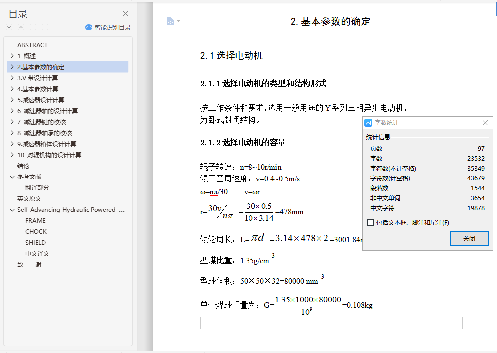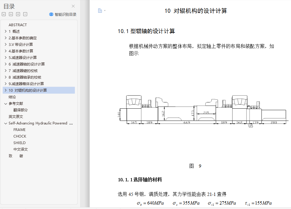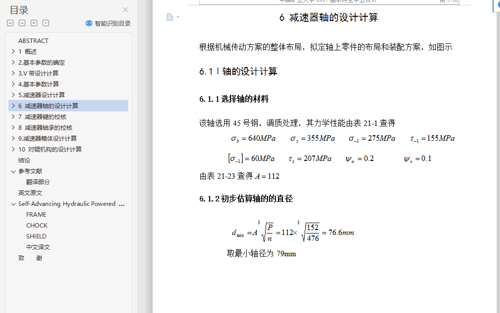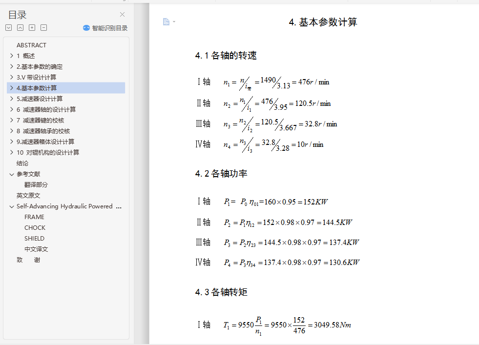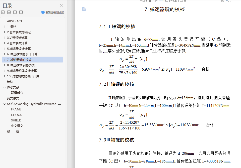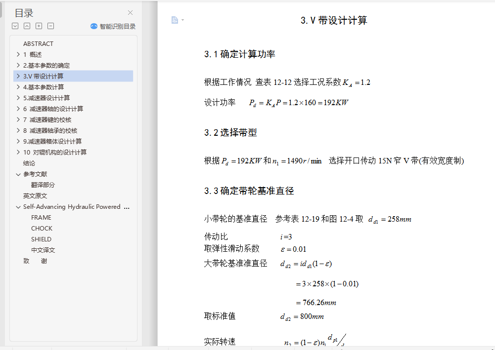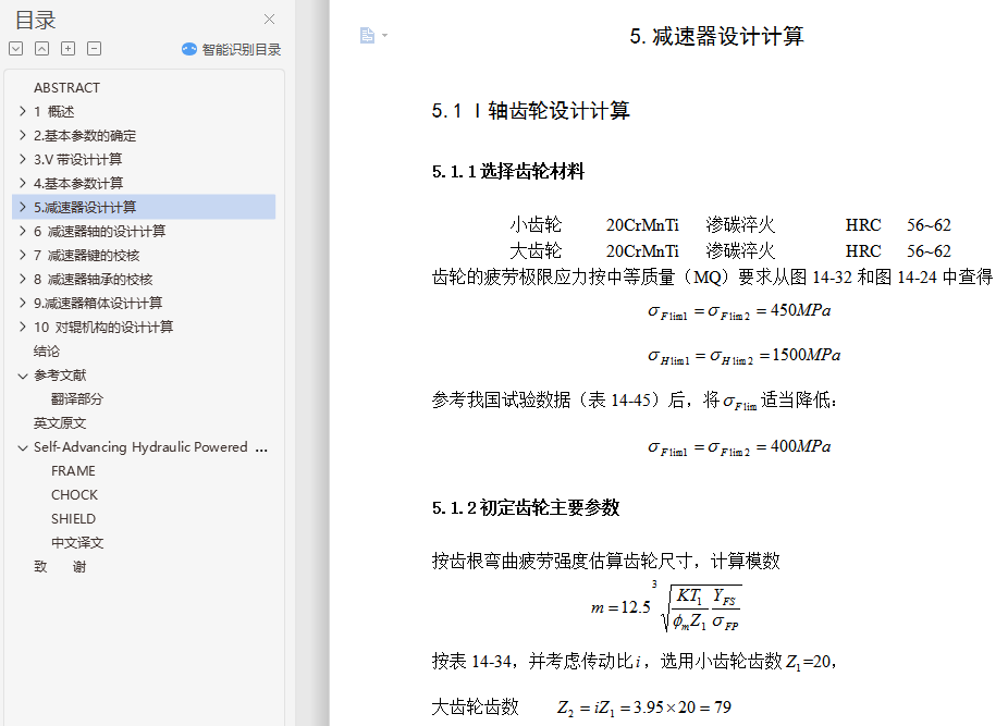 摘 要型煤加工对于有效地利用粉煤资源和保护环境是十分重要的,在我国的能源构成中,煤炭占有十分重要的地位。据统计,在我国能源生产和消费中,煤炭约占总量的75%左右。但是,随着采煤机械化程度的不断的提高,粉煤在原煤中所占的比例也越来越大。粉煤比例的增加不仅降低了散煤的燃烧效率,而且严重地污染了环境。发展型煤是提高粉煤利用率和减少环境污染的重要途径,研究表明,工业锅炉,窑炉使用型煤后可比烧散煤节煤10%~27%,烟尘排放量可减少50%~60%,添加固硫剂后,二氧化硫的排放量可减少35%~50%。因此,发展型煤对我国具有十分重要的现实意义。本设计为一种用于煤炭成型加工的高压对辊成型机,包括有机架,定对辊轴和动对辊轴设置在机架中部,动对辊轴的两端设置有加压装置,通过加压装置,动对辊轴能移动一定距离,在定对辊轴的轴端有同步外挂齿轮与联轴装置及三级设计减速器相连,在定对辊轴和动对辊轴上方的机架上安置有加料装置。该机采用强制加料方式,液压加载和使用安全联轴器,从而使其型煤产品满足生产要求。关键词:型煤; 型煤加工; 粉煤; 对辊成型机ABSTRACTCoal processing for the effective use of coal resources and environmental protection is very important, Coal occupy a very important position in our energy mix. According to statistics, China's energy production and consumption, coal accounts for about 75% of total. However, as the mining mechanization of a continuous increase in coal pulverized coal as a proportion is also growing. Coal proportion of the increase not only reduced the casual coal combustion efficiency, but also seriously polluted the environment. Development of coal briquette is to improve utilization and reduce environmental pollution in important ways, the study shows that industrial boilers, Kiln use briquette after comparable saving coal burning coal powder 10% ~ 27%, soot emissions can be reduced 50% ~ 60%. After the addition of sorbent , and sulfur dioxide emissions can be reduced 35% ~ 50%. Therefore, the development of China's coal is of great practical significance.The design of the coal used in a high-pressure molding and processing of roll forming machines, including rack, set to roll axis and move on roller shaft installed in the central rack, moving to the ends of roller shaft equipped with pressure device, through compression devices, move to roll axis can move a certain distance. In determining the roll axis of the shaft to keep pace with the pylon gear coupling device design and three-reducer, In determining the roll axis and move right side of the roll axis rack placed on the feeder. The aircraft introducing compulsory feeding, hydraulic loading and the use of safety coupling, thus briquette products meet production requirements.Keywords : briquette; Coal processing; Coal; Right roll forming machine目 录1 概述 11.1型煤发展方向 11.1.1发展型煤产业的重要性 11.1.2型煤产业及技术的现状 11.2国内外型煤发展概况 21.2.1国外型煤概况 21.2.2 国内型煤概况 41.3对辊成型机的发展概况 41.3.1对辊成型机的发展展状况 41.3.2对辊成型机的成型机理 52.基本参数的确定 72.1选择电动机 72.1.1选择电动机的类型和结构形式 72.1.2选择电动机的容量 72.2.1传动装置的总传动比 82.2.2分配各级传动比 93.V带设计计算 103.1确定计算功率 103.2选择带型 103.3确定带轮基准直径 103.4验算带的速度 113.5初定中心距 113.6确定基准长度 113.7确定实际轴间距 113.8验算小带轮包角 123.9单根V带的基本额定功率 123.10V带的根数 123.11单根V带的预紧力 133.12带轮的结构和尺寸 134.基本参数计算 144.1各轴的转速 144.2各轴功率 144.3各轴转矩 145.减速器设计计算 155.1 I轴齿轮设计计算 155.1.1选择齿轮材料 155.1.2初定齿轮主要参数 155.1.3校核齿面接触疲劳强度 175.2Ⅱ轴齿轮设计计算 205.2.1选择齿轮材料 205.2.2 初定齿轮主要参数 215.2.3校核齿面接触疲劳强度 235.3Ⅲ轴齿轮设计计算 265.3.1选择齿轮材料 265.3.2 初定齿轮主要参数 265.3.3 校核齿面接触疲劳强度 286 减速器轴的设计计算 326.1Ⅰ轴的设计计算 326.1.1选择轴的材料 326.1.2初步估算轴的的直径 326.1.3轴上零部件的选择和轴的结构设计 336.1.4轴的受力分析 346.1.5轴的强度计算 376.2Ⅱ轴的设计计算 386.2.1选择轴的材料 386.2.2初步估算轴的的直径 386.2.3轴上零部件的选择和轴的结构设计 386.2.4轴的受力分析 396.2.5轴的强度计算 406.3 Ш轴的设计计算 436.3.1选择轴的材料 436.3.2初步估算轴的的直径 436.3.3轴上零部件的选择和轴的结构设计 436.3.4轴的受力分析 446.3.5轴的强度计算 456.4Ⅳ轴的设计计算 486.4.1 选择轴的材料 486.4.2初步估算轴的的直径 496.4.3轴上零部件的选择和轴的结构设计 496.4.4轴的受力分析 506.4.5轴的强度计算 517 减速器键的校核 557.1 I轴键的校核 557.2Ⅱ轴键的校核 557.3Ⅲ轴键的校核 557.4Ⅳ轴键的校核 568 减速器轴承的校核 568.1验算Ⅰ轴承寿命 568.2验算Ⅱ轴承寿命 578.3验算Ⅲ轴承寿命 588.4验算Ⅳ轴承寿命 599.减速器箱体设计计算 609.1 箱体设计 6010 对辊机构的设计计算 6110.1型辊轴的设计计算 6110.1.1选择轴的材料 6110.1.2初步估算轴的的直径 6210.1.3轴上零部件的选择和轴的结构设计 6210.1.4 轴的受力分析 6210.1.5轴的强度计算 6610.2验算轴承寿命 6610.3型辊轴键的校核 6710.4辊型及型板的设计 6710.5 压辊的支撑装置(轴承) 6910.6 给料系统 7010.7 承压支架 7110.8 同步驱动齿轮系 7110.8.1选择齿轮材料 7110.8.2初定齿轮主要参数 7210.8.3校核齿面接触疲劳强度 7310.9液压施压系统及润滑 76结论 7