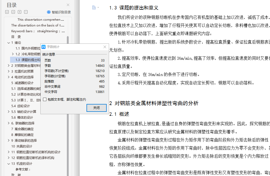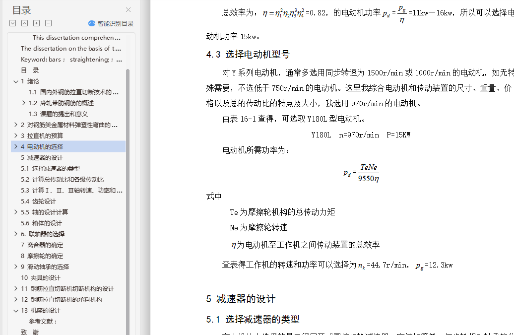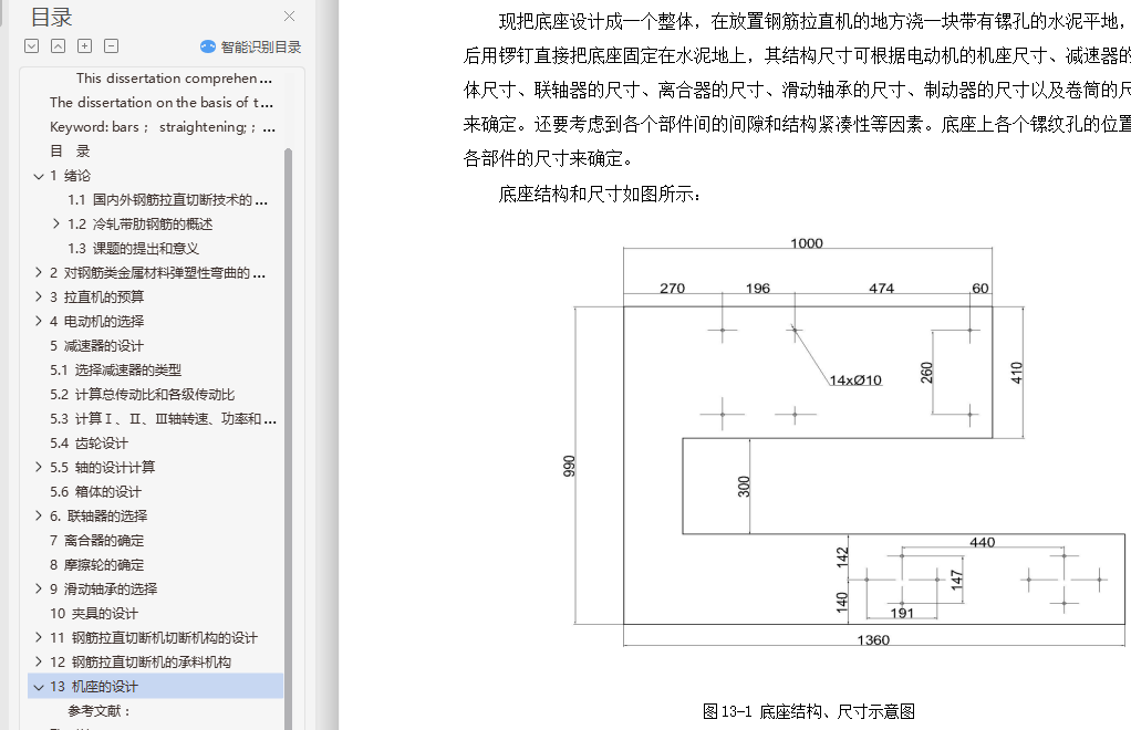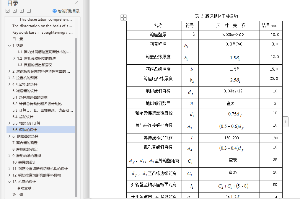 摘 要论文较为全面系统的研究了钢筋的拉直理论及拉直切断机的基本形式、结构、参数和选型方法,确定了钢筋拉直切断机的总体设计方案,论文运用材料力学和弹性力学的基本原理,将拉直过程中的钢筋看做一个连续弯曲的梁 ,对钢筋的弯曲变形做出了详尽的描述。论文对钢筋的拉直原理作了进一步的叙述,在此理论的基础上,研究分析了拉直系统参数确定的方法,提出了新的拉直方法。论文设计了一种较为简单实用的剪切机构。论文创造性地在拉直切断机上引入了行程开关,实现对钢筋的自动定尺切断,提高了自动化程度。论文在理论分析的基础上,充分联系实际中已有的拉直切断机原理机构。在降低机器成本的基础上,提高了切断效率,并实现了自动化。关键词:钢筋; 拉直; 行程开关; 剪切; 自动化AbstractThis dissertation comprehensively and systematically investigates straightening technology bars,straightening theory of bars,the straightening machines basis type, parameter and the method of choosing bars straightening machine type. Utilizing the basis of material mechanics, elastic-plastic mechanics and regarding a bar as a continuous bending beam in the process of straightening, bend transform of bars is explained elaborately.Straightening theory of bars is farther and on the basis of this theory ,confirming method of straightening system parameter is researched. The new roller type configuration theme is not forward and straightening system mechanical parameter and straightening power of this new theme is calculated. An simple cutting mechanism is designed. The dissertation draw into the distance-button on the straightening machines, the bars can be cutting in certain size automatic, make it more automatic.The dissertation on the basis of theory analyze,combine with the straightening machines used,on the basis of lower cost,raise the cutting efficiency,and to be automatic.Keyword: bars; straightening;; distance-button; cutting; automatic目 录1 绪论 11.1 国内外钢筋拉直切断技术的发展状况 11.2 冷轧带肋钢筋的概述 21.2.1 钢筋的种类 21.2.2 冷轧带肋钢筋的表面形式 31.2.3 冷轧带肋钢筋基本性能 31.3 课题的提出和意义 42 对钢筋类金属材料弹塑性弯曲的分析 42.1 概述 42.2 弹塑性弯曲的变形过程 63 拉直机的预算 73.1 力能参数计算 73.2 拉直机构设计中的几个问题 84 电动机的选择 84.1 电动机类型和结构 84.2 选择电动机的容量 84.3 选择电动机型号 95 减速器的设计 95.1 选择减速器的类型 105.2 计算总传动比和各级传动比 105.3 计算Ⅰ、Ⅱ、Ⅲ轴转速、功率和转矩 105.4 齿轮设计 115.5 轴的设计计算 135.5.1 设计要求 135.5.2 轴二的设计 135.5.3 轴一的设计 145.5.4 轴三的设计 145.6 箱体的设计 156. 联轴器的选择 166.1 联轴器的计算转矩 166.2 选择联轴器的型号 167 离合器的确定 168 摩擦轮的确定 189 滑动轴承的选择 199.1 轴承型号的确定 199.2 轴承宽度的确定 199.3 检验轴颈的圆周速度 199.4选择轴承的配合 199.5 滑动轴承润滑剂的选择 2010 夹具的设计 2011 钢筋拉直切断机切断机构的设计 2111.1 切断机构的概括 2111.2 承料机构 2111.3 传动系统 2111.4 钢筋拉直切断机剪切机构的分析与研究 2211.4.1 概述 2211.4.2 剪切形式的分类 2212 钢筋拉直切断机的承料机构 2312.1 承料机构分析 2312.2 钢筋拉直切断机承料机构的设计 2413 机座的设计 25参考文献: 26致 谢 26