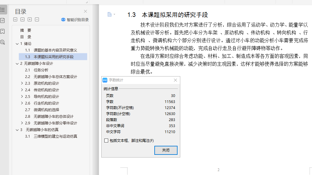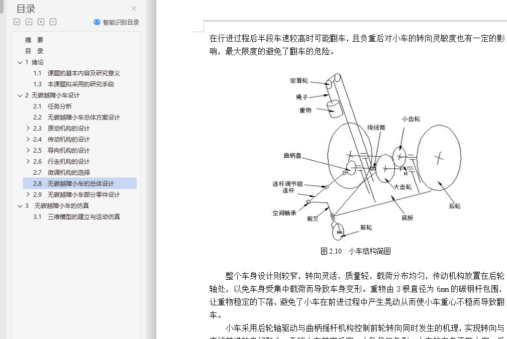 目前全球经济飞速发展,带来环境问题愈发明显,传统能源逐渐衰竭,鉴于此无碳小车的研制具有十分重要的意义。针对题目要求拟定了无碳越障小车的总体设计方案,通过计算分析完成了无碳越障小车的结构设计,绘制了装配图和部分主要零件图,通过pro/E模拟仿真验证了预定功能,并制作出了实体样机,通过实体样机的演示达到了规定功能。