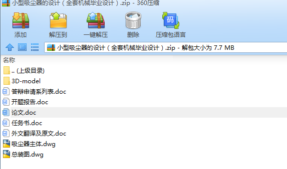From the vacuum cleaner's history began development of the vacuum cleaner, types, working principle, structure and application of environmental. Then do a brief analysis of the vacuum cleaner, from the design to the design of the internal structure of each part of the components of the vacuum cleaner constructed using Pro / E 3D map, such as hoses, fans, suction head, motor, chassis, the main. The final assembly of components designed, constructed assembly drawings and exploded diagram, and using CAD to draw two-dimensional diagram of the vacuum cleaner main structure. The paper also focuses on the design part of the motor to select the design and shock-absorbing muffler.